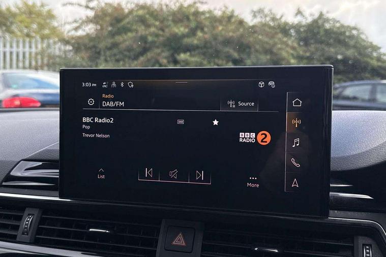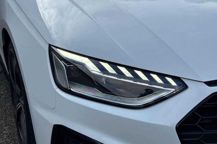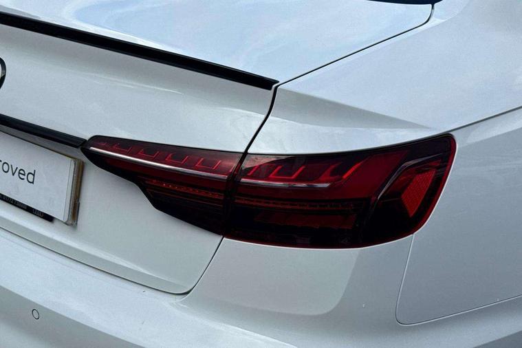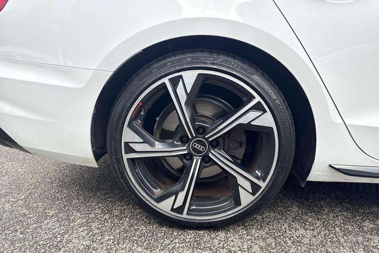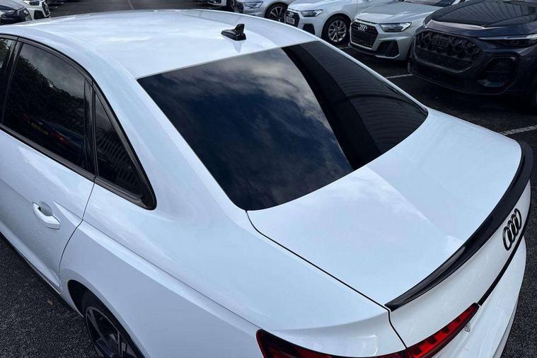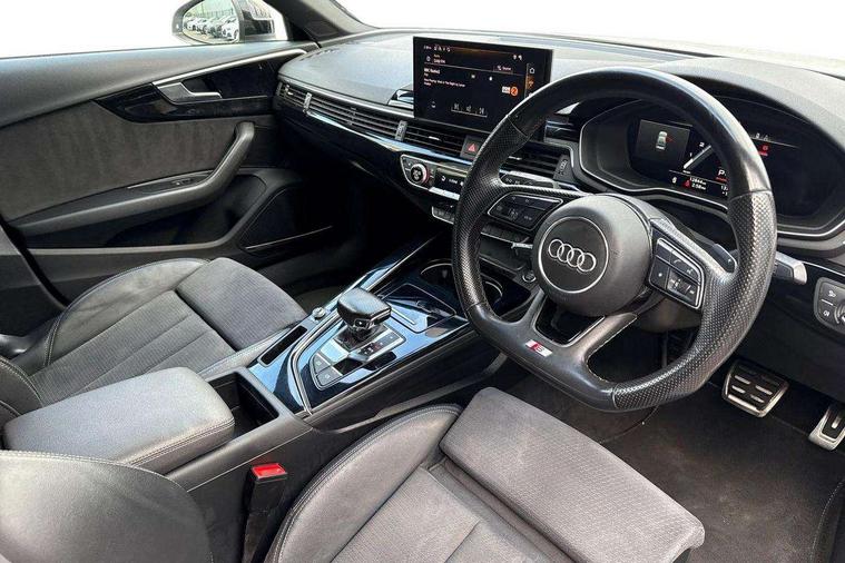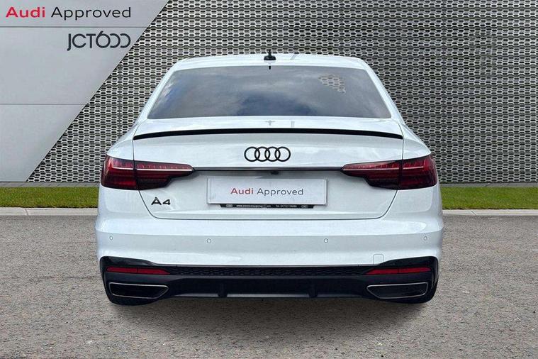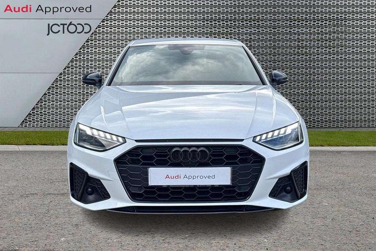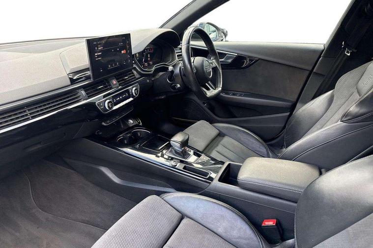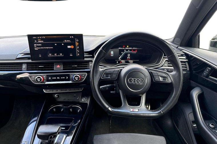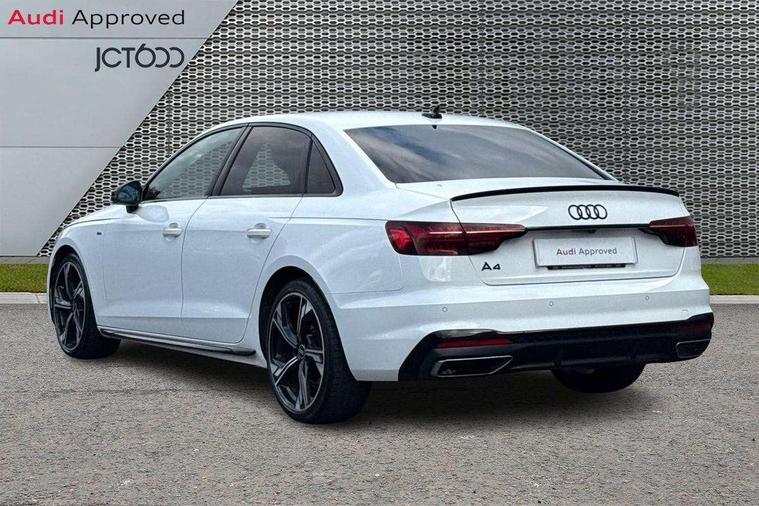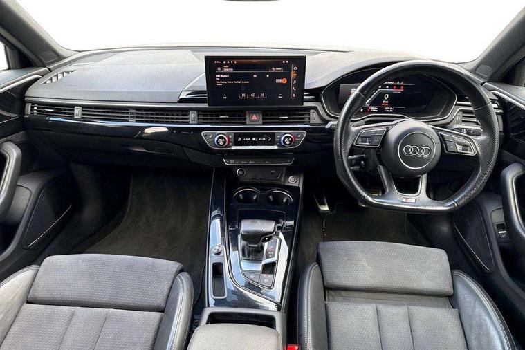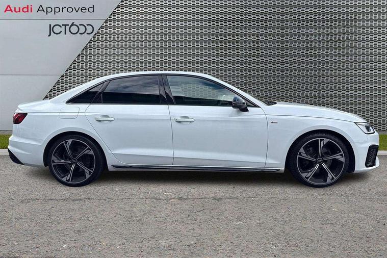 Audi connect safety and service (e-call), Audi connect with Amazon Alexa Integration, Audi drive select, Audi smartphone interface, Audi virtual cockpit, Automatic start-stop system with coasting functionality and efficiency programme, Bluetooth interface, Electric boot lid release, Electromechanical power steering, Email, calendar and text messages displayed via MMI, MMI Navigation plus with MMI touch includes 10.1" high resolution colour MMI display, 3D map, Voice control system, Sports suspension lowered by 23mm, 2 USB charging ports, 8 passive loudspeakers, DAB digital radio reception, Audi beam uses LEDs to project the audi logo onto the ground as you exit your A4, Auto dimming rear view mirror, Black Audi rings and black badging (model name in black badging, no engine badging), Body colour door handles, Body colour front spoiler lip, Body colour side sill trim, Electrically folding auto dimming/adjustable/heated door mirrors with LED side indicators and kerb view function for passenger side, Exhaust tailpipes in high gloss black, Front and rear bumpers with side skirts, Grained matt black side air inlets with matt aluminium silver inlay, High beam assistant, High gloss black B pillar trims and triangular rear door trim, LED headlights with LED rear lights + dynamic rear indicators + headlight adjustment and high beam, turning light + LED daytime running lights, LED third brake light, Privacy glass, Rain and light sensors, Rear boot, Rear diffuser in matt titanium black with trim strip in matt aluminium silver, Rear side wing doors, S Line badges on the front wings, Variable intermittent front wash/wipe, Windscreen with acoustic glazing, 4 way electric lumbar support for driver and front passenger, 40/20/40 split folding 3 rear seat bench in 3 parts with rear centre armrest, Black cloth headlining, Black perforated leather gearknob, Contrast stitching on seats, steering wheel and gear lever gaiter, Deluxe 3 zone electronic climate control, Door sill trims with aluminium inlay, Front and rear head restraints, Front centre armrest, Heated front seats, Illuminated door sill trims with S logo, ISOFIX child seat mounting and top tether, Manual seat adjustment, Single front passenger seat, Stainless steel pedals and foot rest, Black styling pack - A4 Saloon, LED Interior light pack - A4/S4, 3 rear seatbelts, 6 airbags - Driver, front passenger, curtain and side windows, Electronic Stabilisation Control (ESC) including ABS, ASR and EDL, Hill hold assist, Multi collision brake assist, Pop-up bonnet for pedestrian protection, Pre sense city, Rear door child safety locks, Seatbelt monitoring, Warning triangle and first aid kit, Anti theft alarm, Anti theft wheel bolts, Central locking, Keyless Go, Piano black finish inlay, 19" 5 arm flag design Audi sport diamond cut alloy wheels in gloss anthracite black, Tool kit, Tyre repair kit,