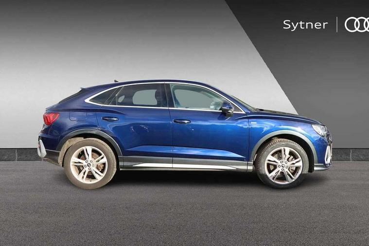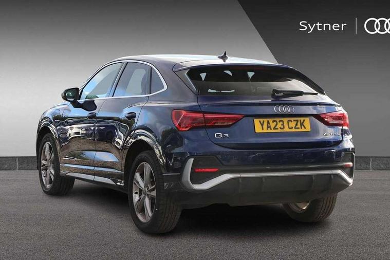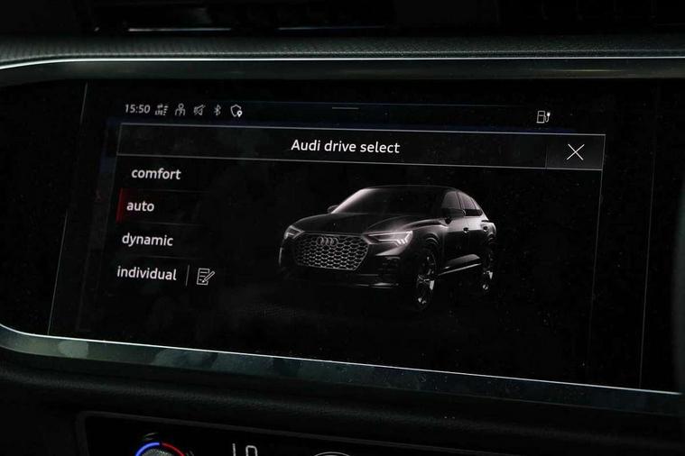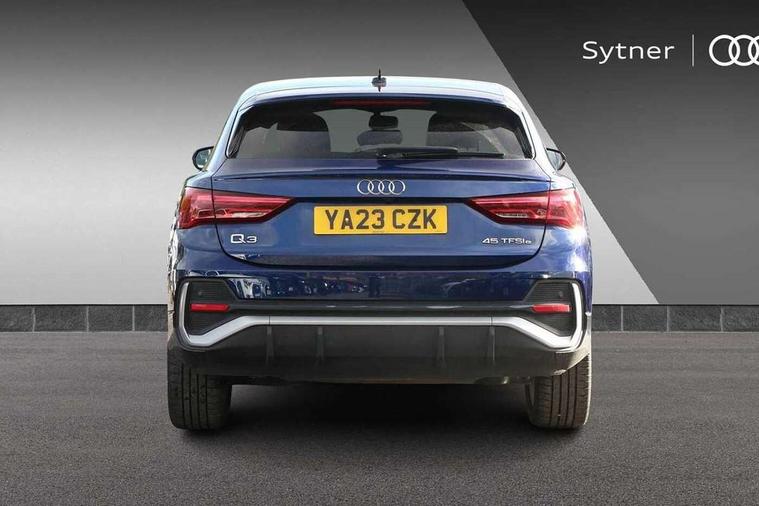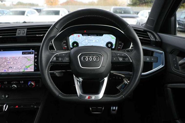Audi drive select, Audi lane departure warning, Audi Virtual Cockpit - 10.25" display, Bluetooth interface, Camera based traffic sign recognition, Legal emergency call, MMI Navigation Plus with high resolution 10.1 inch touchscreen colour display, Power operated tailgate, Progressive steering, Service interval indicator, Smartphone interface includes wireless Apple carplay/Android Auto, Start stop system with recuperation, Voice control system with natural language interaction, 3 pin 10 amp domestic charging cable, 3.6 kw On-board charger, Standard suspension, Type 2 mode 3 32 amp charging cable, Type 2 socket for AC charging, 2 USB-C ports with charge and data functions, 6 passive loudspeakers, DAB digital radio module, Acoustic windscreen, Aluminium window trim, Auto dimming frameless rear view mirror, Diffuser grille in grained matt black, Diffuser trim in selenite silver, Electrically folding, adjustable and heated door mirrors with integrated LED side indicators and kerb view function for passenger side, Front and rear electric windows, Front fog lights, Front side air inlets in selenite silver, Front underbody protection in manhattan grey paint finish, Grille surround in aluminium silver matt, High gloss black finish B and C pillars, LED Dynamic rear indicators, LED headlights with LED daytime running lights, LED rear lights, LED third brake light, Privacy glass dark tinted rear and rear-side windows (from B-pillar backwards), Radiator grille in anthracite black with inlay in matt aluminium silver, Rain and light sensors, Rear side wing doors, Rear underbody protection in matt black, Rear wiper, S line badges on front wings, S line front and rear bumpers and side skirts in contrasting Manhattan grey paint finish, Side skirt insert in matt Platinium grey, Variable front intermittent wipers, 12V socket in rear centre console, 3 seat bench in 2nd row, 3 spoke leather multifunction steering wheel features S badging and grips in perforated leather with contrast stitching, 40:20:40 folding with manual adjustment for 60:40 forwards/backwards position and backrest angle, Adjustable rear seat bench/backrest with centre armrest and cupholder, Black cloth headlining, Dual zone electronic climate control, Front and rear black floor mats with contrast stitching, Front and rear headrests, Front and rear roof module including reading lights, Front centre armrest, Glove compartment lighting, Height and reach adjustable steering wheel, Illuminated door sill trims with S logo, ISOFIX child seat mounting for front passenger with airbag deactivation and outer rear seat including top tether attachment point for outer rear seats, Luggage compartment light right in white, Luggage compartment sill protection in stainless steel, Manual front seats with height adjustment, Perforated leather gearknob, Single front passenger seat, Stainless steel pedals, Ambient lighting pack - Q3, Non smoking pack - Q3, 3x3 point rear seatbelts, 6 airbags - Driver, front passenger, curtain and side windows, Audi pre-sense front with pedestrain and cyclist recognition, Electrically operated child locks on rear doors, Electromechanical parking brake, Electronic stabilisation control including ABS, ASR and EDL, Front seatbelt reminder, Hill descent control, Hill hold assist, Pre sense basic, Seatbelt monitoring, Tyre pressure warning, Warning triangle and first aid kit, Anti theft alarm, Anti theft wheel bolts, Immobiliser, Remote central locking, Aluminium look interior elements, Black dashboard, Dark matt brushed aluminium inlay, Detail dashboard around MMI touch colour display in glass look, black with surround in aluminium look, Leatherette door armrest, Tool kit, Tyre repair kit,