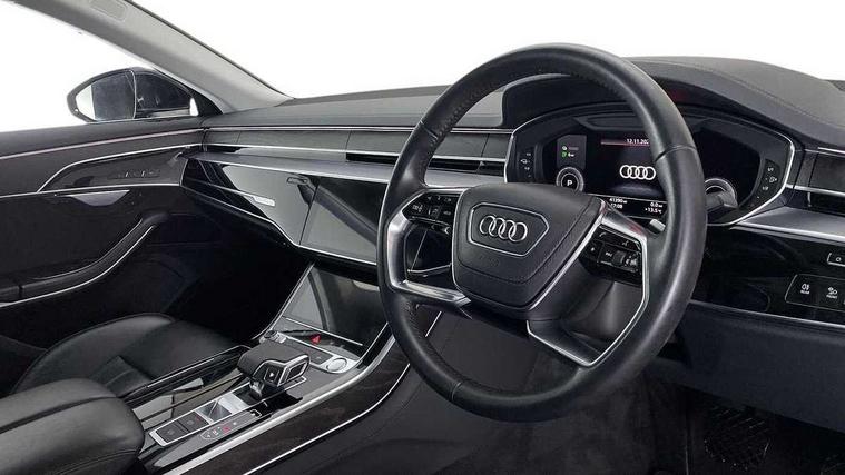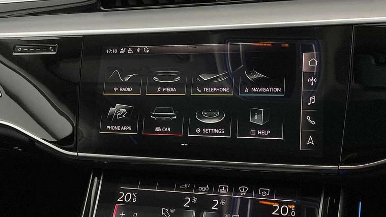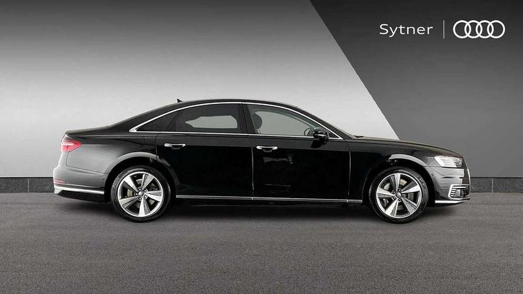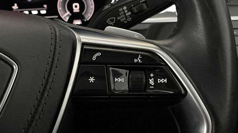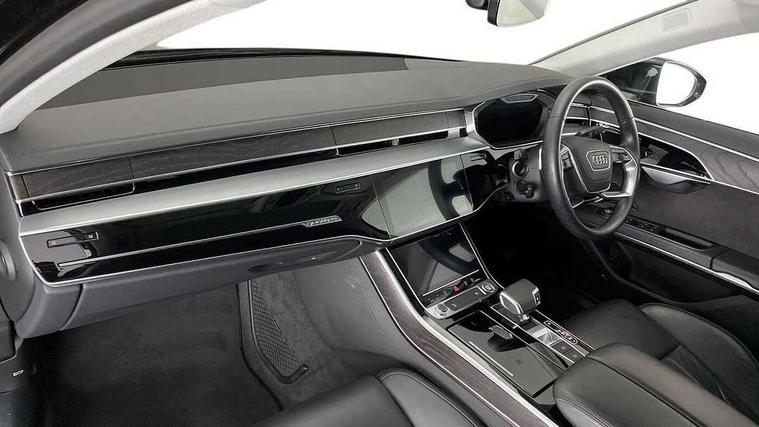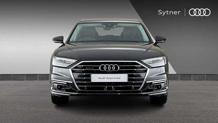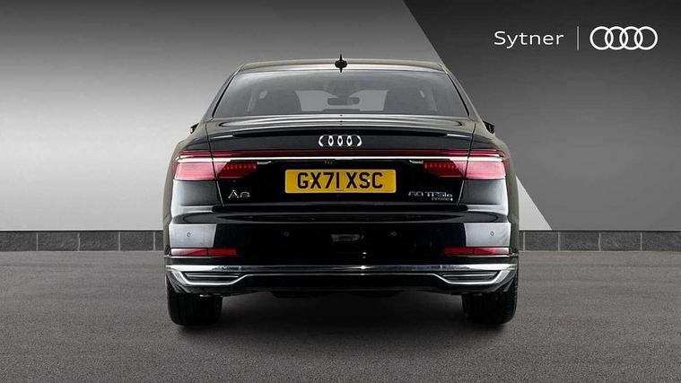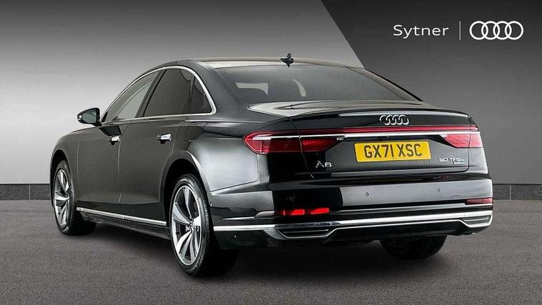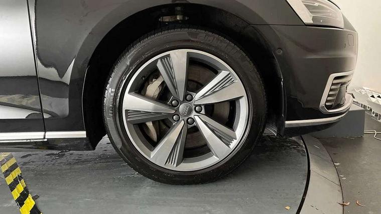 'Lights On' Reminder warning buzzer, Adaptive cruise control with speed limiter, Audi connect safety and service (e-call), Audi drive select, Audi parking system plus with front and rear sensors, Audi virtual cockpit, Audi wireless smartphone interface, Bluetooth interface, Camera based traffic sign recognition, Electro - mechanical power assisted steering, Head up Display, MMI navigation plus with MMI touch + Twin touch screens with haptic feedback, MyAudi app connection for Audi e-tron charging service, Operating buttons in black, glass look with haptic feedback, Power door closure, Power operated tailgate, Rear view camera, Remote fuel filler release, Service interval indicator, 3 pin 10 amp domestic charging cable, 65 litre fuel tank, 8 speed transmission with hill hold assist, Adaptive air suspension, Hybrid propulsion system, Quattro all wheel drive with self locking centre differential, Type 2 mode 3 32 amp charging cable, Type 2 socket for AC charging, Audi music interface, Audi sound system, DAB digital radio module, DVD System, Premium MMI radio plus, USB connection, Audi space frame, Auto dimming rear view mirror, Body colour bumpers, Body colour door handles, Body colour exterior mirror housings, Body colour side protection with aluminium trim strips, Chrome exterior styling, Electric drive specific light signature, Electric front windows, Electric rear windows with isolation switch, Electrically adjustable heated folding + automatically dimming exterior mirrors with memory function and integrated LED indicators, Heat insulating glass in side and rear windows, Heated rear window, Heated windscreen washer jets, High beam assist, LED brake lights, LED daytime running lights, LED Headlights, Rear boot, Rear side wing doors, Side skirts, Third brake light, 3 seat rear bench with centre armrest in 2nd row, 4 way electric lumbar support for driver and front passenger, 4 zone control automatic air conditioning, Centre console with cupholders, Climate controlled seats, Comfort centre armrest, Door armrest with storage, Door pockets with bottle holder, Driver and front passenger side sunvisors with illuminated vanity mirrors, Dust/pollen filters, Electric front seats with memory function, Front/rear floor mats, Glove compartment cooling, Heated front seats, Height/reach electric steering column with easy exit function, Isofix child seat mounting points on outer rear seats, Leather gearknob, Passenger footwell storage net, Pre-entry climate control, Reading lights, Rear headrests, Roof mounted sunglasses holder, Single front passenger seat, Valcona leather upholstery with comfort front seats, Connect package plus - A8, High gloss styling pack - A8, LED ambient interior lighting pack - A8, 3 point seatbelts on all rear seats, ABS/EBD, Acoustic vehicle alerting system, Active front headrest system, ASR traction control, Audi pre sense basic, Audi pre sense front, Driver/Front Passenger airbags, EDL traction control, Electromechanical parking brake, ESP, Extended pedestrian protection measures, Front and rear side airbags with head airbag system, Front brake discs, callipers painted black, Front passenger airbag deactivation, Rear brake discs, callipers painted black, Rear child proof door locks, Seatbelt reminder + electric contact in buckle + advanced safety equipment, Tyre pressure warning light, Warning triangle and first aid kit, Advanced key, Anti theft alarm tow away protection, Anti-theft wheel bolts and wheel loosening detection, Locking wheel bolts, Remote central locking, Dark matt brushed aluminium lower inlays, Tyre repair kit,