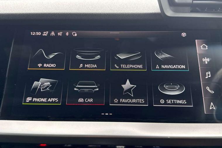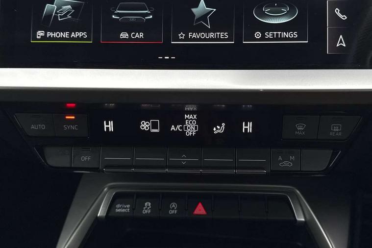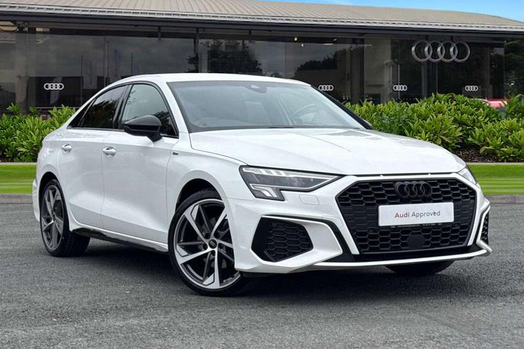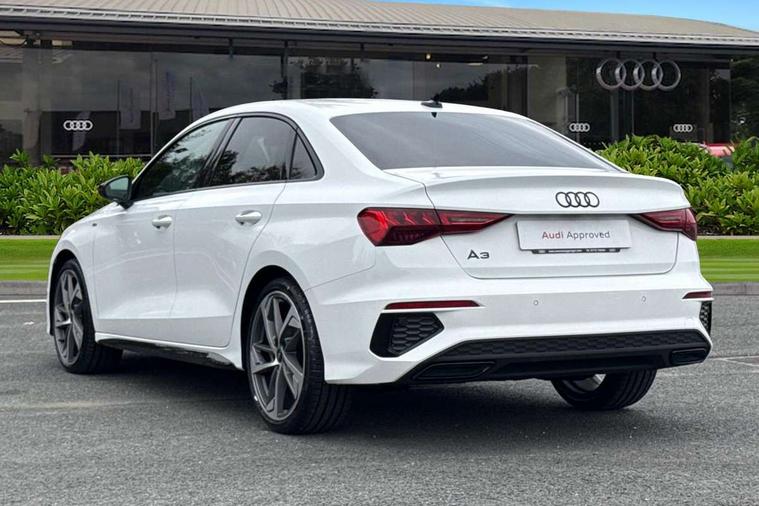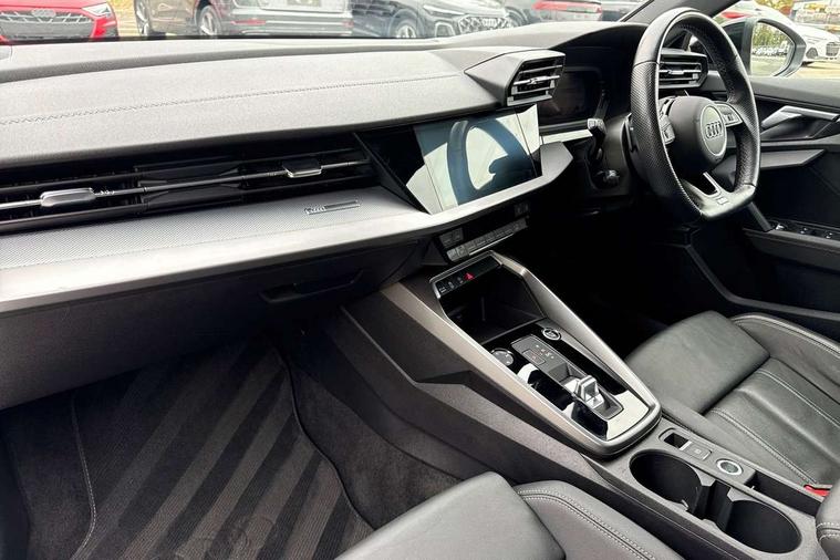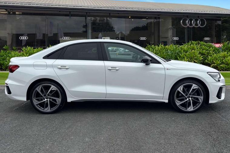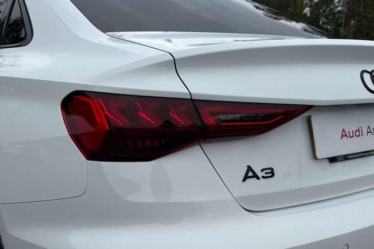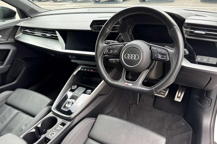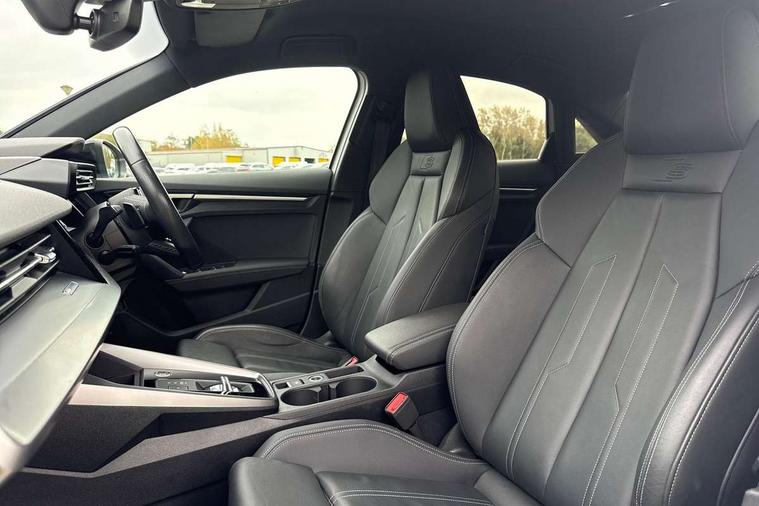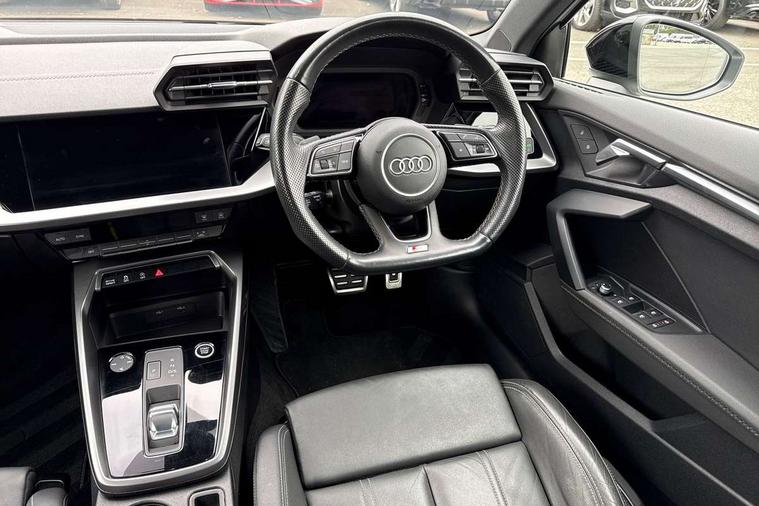 Audi drive select (Auto, Comfort, Dynamic, Efficiency and Individual), Audi smartphone interface, Audi Virtual Cockpit - 10.25" digital and colour instrument cluster, Automatic start/stop system with recuperation, Bluetooth interface, Camera based traffic sign recognition, Collision avoidance assistant, e-Call (emergency call), Electromechanical power speed sensitive steering, Lane departure warning system, MMI Navigation Plus with high resolution 10.1" colour touch screen display, Service indicator, Trip computer, Voice control system with natural language interaction, Sports suspension, 2xUSB-C connection with data and charging functions, 6 passive loudspeakers, CD player, DAB Digital radio, 3rd brake light, Acoustic glass windscreen, Audi beam uses LEDs to project the Audi logo onto the ground as you exit your A3, Auto dimming frameless rear view mirror, Electrically adjustable/heated/folding/auto dimming door mirrors with integrated LED indications + kerb view function for passenger side, Front electric windows, Illuminated door sills with aluminium inserts at the front with S logo, LED daytime running lights, LED headlights with LED rear lights and dynamic rear indicators, Light and rain sensors, Model and engine designation badges at rear, Privacy glass - dark tinted rear window, rear door and side windows, Rear boot, Rear electric windows, Rear side wing doors, S roof spoiler, 12V socket and storage compartment in front centre console, 3 seat bench in 2nd row, 3 spoke flat bottomed leather multifunction sport steering wheel with gear shift paddles, 4 way electrically adjustable lumbar support for driver and front passenger, 60/40 split folding rear seat bench, Black cloth headlining, Dual zone electronic climate control, Front and rear centre armrest in artificial leather, Front and rear headrests, Front/rear floor mats, Height and reach adjustable steering wheel, Interior lighting - glove compartment light and right hand side, Luggage compartment floor covering, Manual boot compartment lid, Single front passenger seat, Stainless steel pedals and front footrest in black, Twin leather upholstery with front sports seats S embossed logo, Aluminium interior elements pack - A3, Black styling pack - A3 Saloon/Black edition, LED interior lighting pack - A3 Saloon, 3x3 point rear seat belts, Driver and front passenger airbag with passenger airbag deactivation, Electronic Stabilisation Control (ESC) including ABS, ASR and EDL, First aid kit with warning triangle and 2 safety vests, Front side airbags with head airbags and interaction airbag, Pre-sense front with pedestrian and cyclist detection, Seatbelt monitoring, Tyre pressure loss indicator, Anti theft alarm, Anti-theft wheel bolts, Electronically operated child locks, Immobiliser, Remote control central locking, Aluminium air vent surrounds, Dark spectrum aluminium inlays, accent surfaces in the dashboard and centre console in platinum grey silk effect paint finish, 19" 5 arm trapezoid design alloy wheels in matt grey with diamond cut finish,