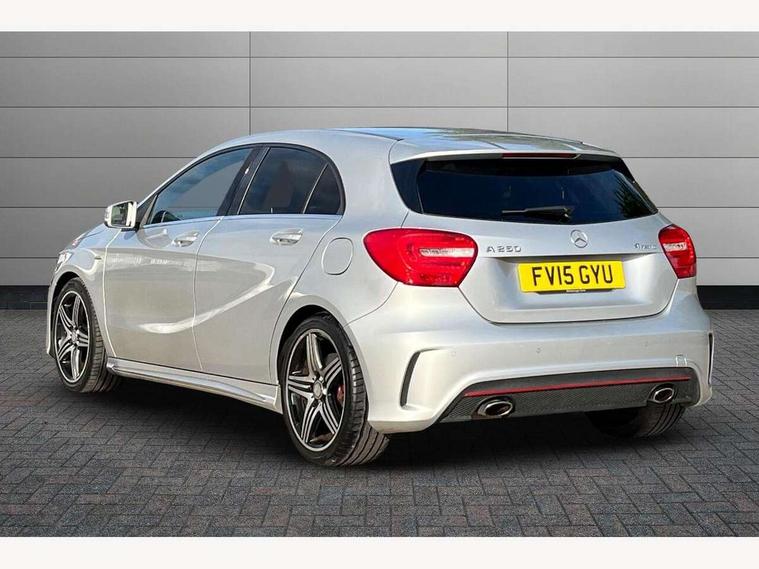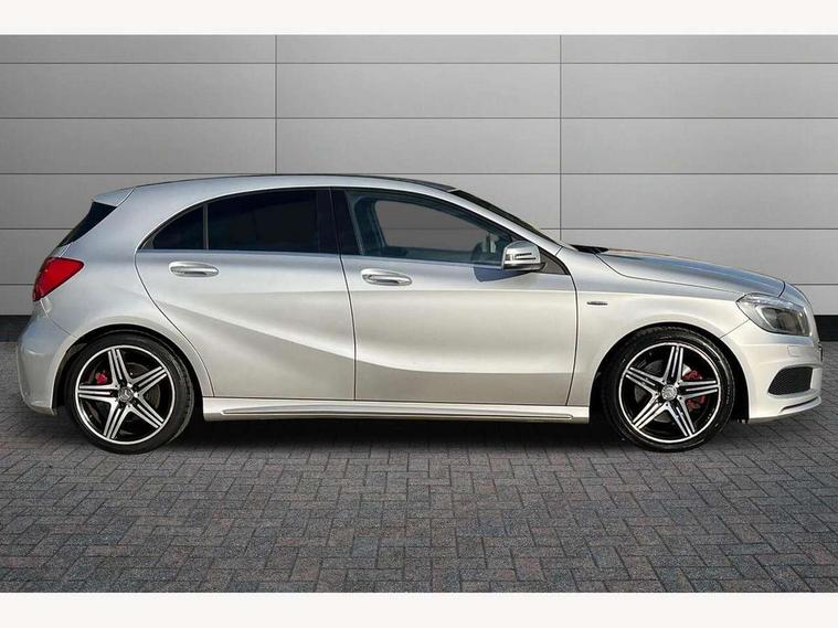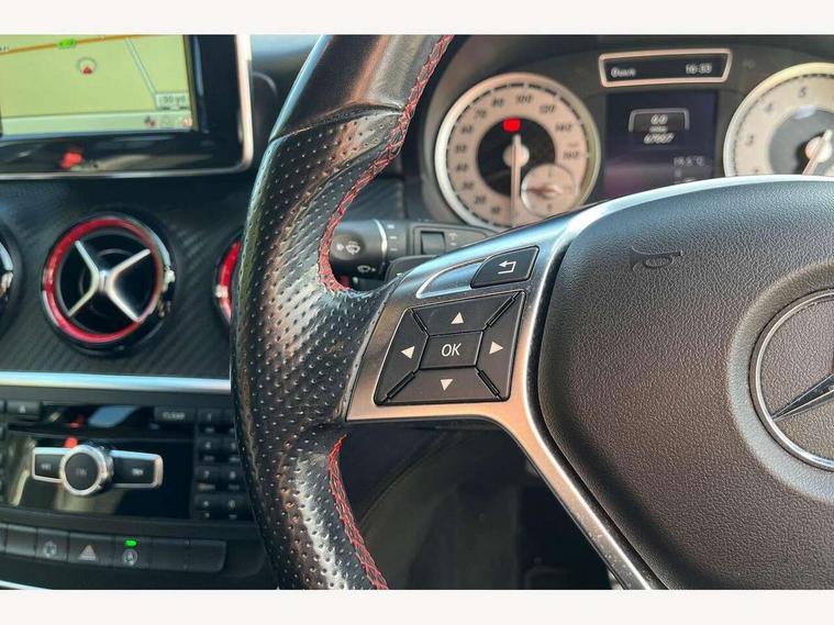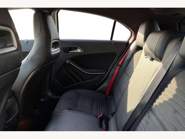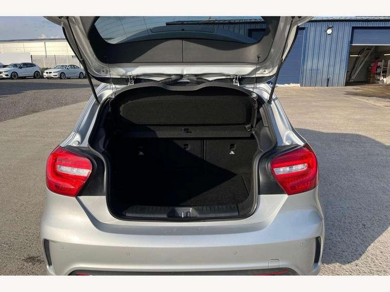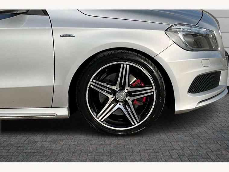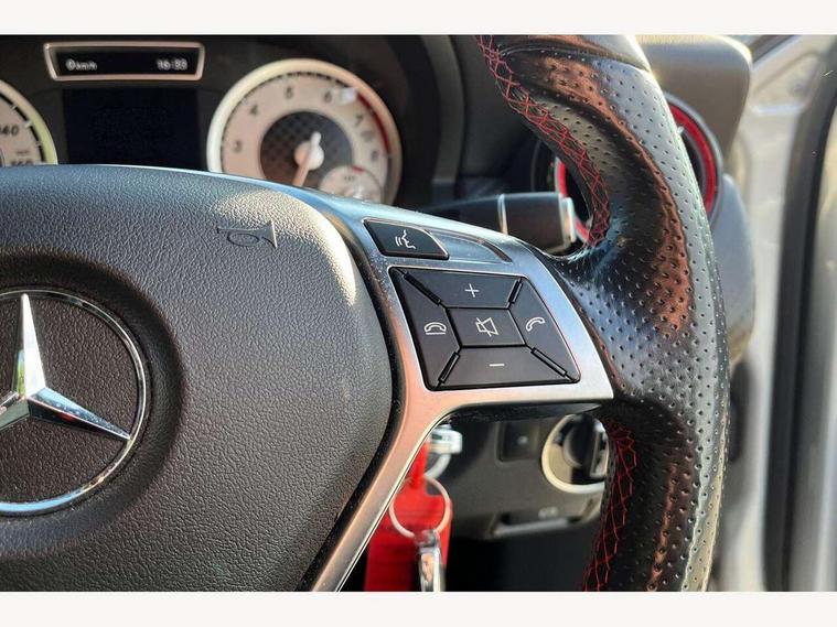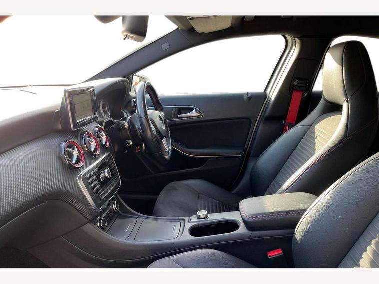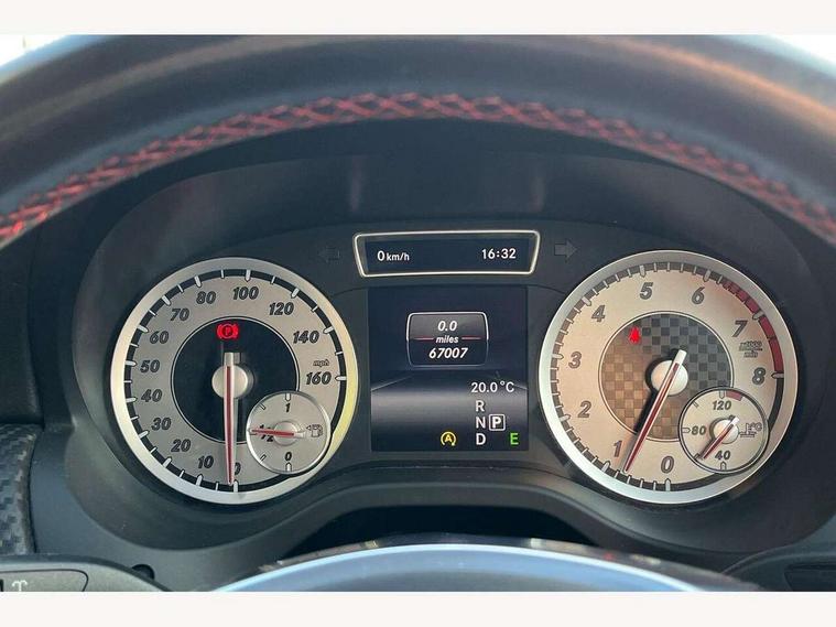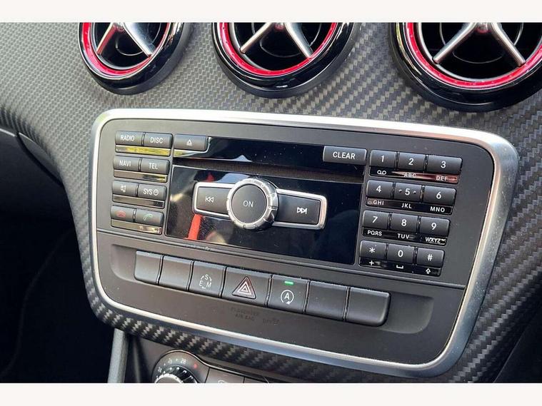 Attention assist, Bluetooth interface for hands free telephone, Bulb failure indicator, Collision prevention assist, External temperature gauge, Low fluid warning light, Service indicator (ASSYST PLUS), Speed sensitive variable PAS, Trip computer, Sports suspension, USB port, Adaptive brake lights, AMG body styling, Body colour bumpers/red strips, Body colour door handles, Body colour side skirt, Chrome beltline trim, Electric adjustable heated door mirrors, Electric front windows, Electric rear windows, Gloss black door mirrors, Headlamp assist, Heated rear window with timer, LED daytime running lights, LED rear lights, Privacy glass, Radiator grille with 1 louvre in diamond design, Rear wiper, Twin chrome exhaust tailpipes, 1/3 to 2/3 split folding rear seats, 12V power socket in centre console, 3 Spoke sports multifunction flat bottomed leather steering wheel, Ambient lighting, Auto Mercedes-Benz child seat recognition sensor, Black headlining, Centre console with cupholders, Footwell lights, Front centre armrest with storage compartment, Front head restraints, Front sport seats, Gearshift paddles on steering wheel, Height/reach adjustable steering column, Illuminated glovebox, Isofix rear child seat preparation, Leather gearshift, Load securing rings in luggage compartment, Luggage compartment cover, Luggage compartment lighting, Rear head restraints, Red stitching on steering wheel, Seat cushion angle adjustment, Sports pedals, Storage compartment under load area floor, Light and sight pack - A Class, 3 rear 3 point seatbelts, ABS with Brake Assist, Active bonnet, Adaptive brake system, Brake calipers with Mercedes-Benz lettering + perforated brake discs, Child proof door locks, Crash responsive emergency lighting, Drivers knee airbag, Dual stage driver/passenger airbags, Electronic parking brake, ESP with ASR, Front and rear seatbelt reminder, Front passenger seat occupancy sensor, Front side airbags, Hill start assist, Red painted brake calipers, Tyre pressure monitoring system, Warning triangle and first aid kit, Window airbags, Alarm system/interior protection/immobiliser, Remote central locking, Carbon effect trim, Chrome air vent surround with red insert, 18" 5 spoke AMG alloy wheels, Tirefit sealant with electric air pump,
