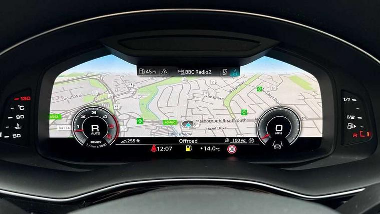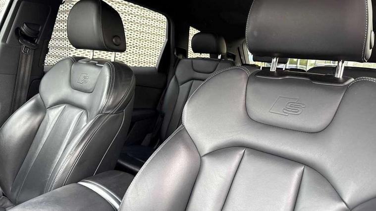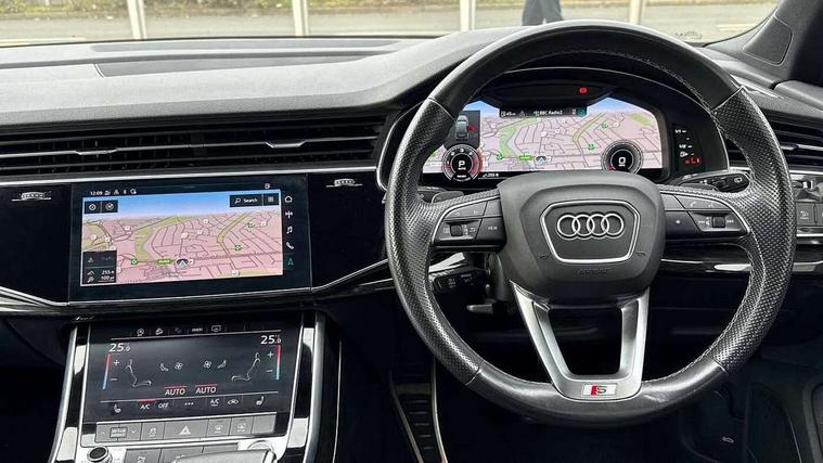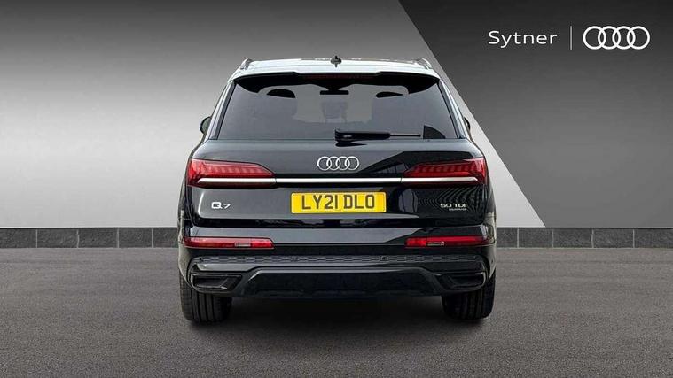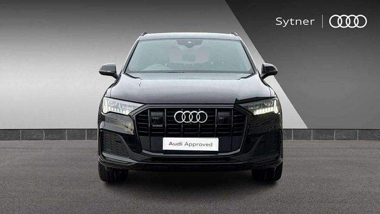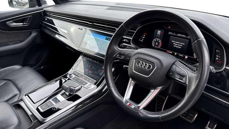 Audi connect safety and service (e-call), Audi drive select (Auto, Comfort, Dynamic, Efficiency, Individual, Off-road and All road), Audi phone box with wireless charging, Camera based traffic sign recognition, Electromechanical steering, MMI navigation plus with MMI touch screens includes 10.1" and 8.6" screens with haptic feedback, Natural voice recognition, Parking system plus with 360 degree display (front, rear and side sensors) - acoustic and visual park assist system, Power operated tailgate, Rear view camera, Smartphone interface includes wireless Apple carplay/Android Auto, Start/stop system, 48V Mild hybrid technology, Adaptive air sports suspension, Quattro all wheel drive with self locking centre differential, Audi music interface - front 2 USB-C ports with charger and data functions, Audi sound system with 6 channel amplifier, 180 watt amplifying capacity and 10 loudspeakers including subwoofer, DAB digital radio module, Audi matrix LED headlights with dynamic front and rear indicators, Auto dimming frameless rear view mirror, Black roof rails, Bumpers in contrast paint scandium grey finish includes door trim and wheel arch trim strips, inlays in door strip contain quattro embossing, Electrically adj heated/folding + automatically dimming exterior mirrors with memory + automatic kerb side function for passenger side exterior mirror, Heat insulating glass in windshield, Integrated LED indications in door mirrors, LED daytime running lights, LED rear tail lights, Privacy glass - dark tinted rear and rear side windows from B-pillar backwards, 4 zone deluxe automatic climate control, 7 seat layout with ISOFIX points for the front passenger seat and rear passenger seat, Black cloth headlining, Comfort front centre armrest, Folding rear seats, Front head restraints, Front/rear floor mats, Heated front seats, Illuminated door sill trims with S logo, LED interior ambient lighting, Luggage compartment cover, Luggage compartment sill protection in stainless steel, Rear head restraints, Stainless steel pedals, Sunvisors with illuminated vanity mirrors, Titanium black styling pack - Q7/SQ7, 3 point seatbelts on all rear seats, Audi pre sense front, Driver and front passenger, front side and curtain airbags, Electromechanical parking brake, Electronic Stabilisation Control (ESC) including ABS, ASR and EDL, Extended pedestrian protection measures, Hill hold assist, Seatbelt monitoring, Tyre pressure loss indicator, Warning triangle and first aid kit, Anti theft alarm, Anti-theft wheel bolts and wheel loosening detection, Keyless Go, Remote central locking, Polished oak trim with grey finish inlay, Tool kit, Tyre repair kit,