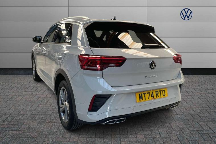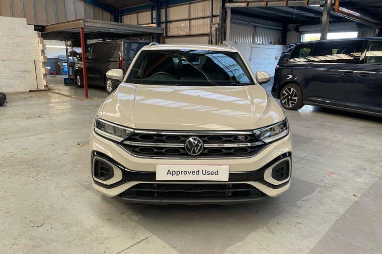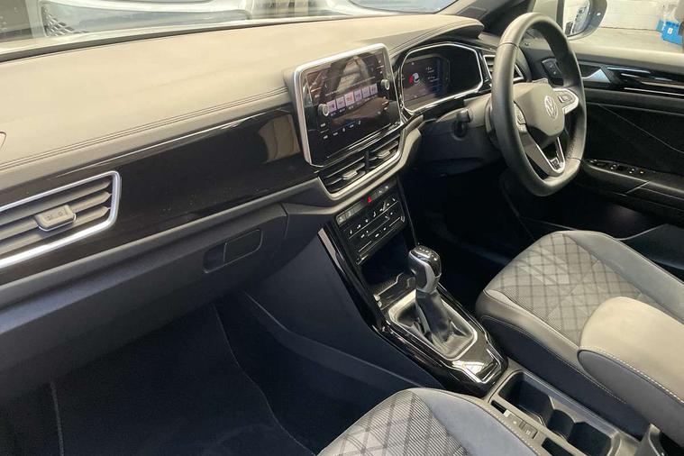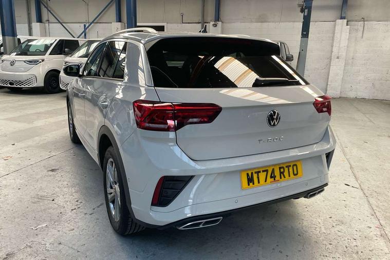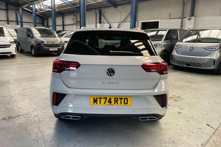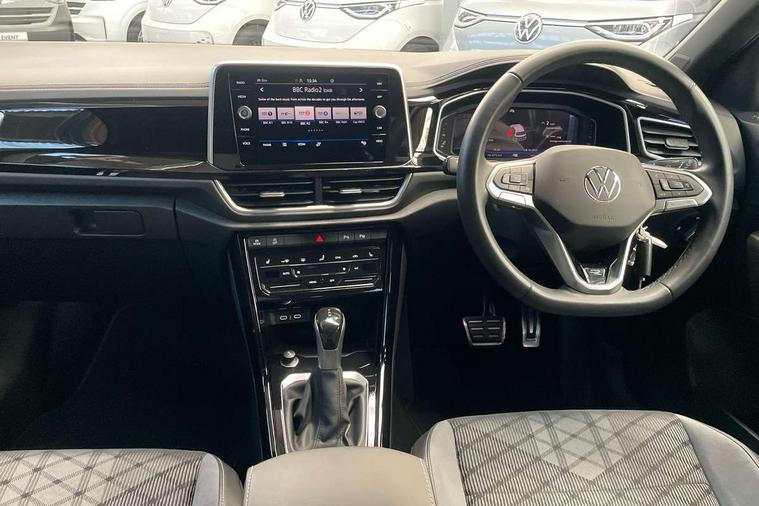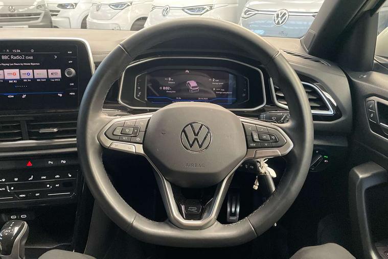 10.25" Digital cockpit pro, Advanced driver attention and drowsiness monitor, Emergency call service, Lane keeping system Lane Assist, Mobile phone interface, Modified key software - reduce switch off time for key status change to Long no motion, Online services, Park assist including front and rear parking sensors, Service interval indicator, Tailgate/trunk lid release from outside, Think blue trainer driver tips and journey analysis, Warning sound and light for front seatbelts unfastened, Wireless app connect, Wireless Smartphone charger, Battery regeneration during braking, Start/stop function with battery regeneration, DAB Digital radio, Diversity antenna for FM reception, Front and rear 6 speakers, Music playback - MP3, WMA and AAC files, Premium USB cable in choice of either Apple or Android smartphone compatibility, SD card slot, Simultaneous pairing of 2 compatible mobile devices, Title and cover art display, We Connect and We Connect Plus functionality, Auto dimming interior rear view mirror, Automatic hazard lights activation under emergency braking, Automatic headlight control with LED separate daytime running lights with coming/leaving home function, Electrically adjustable and heated door mirrors, Extended roof spoiler, Exterior mirrors aspherical on driver side, convex on front passenger side, External USB type C socket and charging sockets, Front windscreen wiper with intermittent wipe and 4 position delay, Heated rear window, LED 3rd brake light, LED rear combination lamps, LED rear number plate lights, Power windows with comfort operation and circuit breaker, R-Line design body coloured bumpers, Rain sensor, Rear exhaust tailpipe, Rear fog light on one side and reversing lights on both sides, Rear side wing doors, Rear wash/wipe with intermittent wipe setting, Remote electrically foldable door mirrors, puddle lights and reverse activated passenger's door mirror, 12V power socket in centre console, 3 rear head restraints, 3 seat bench in 2nd row, 4 load lashing points in luggage compartment, Air care climatronic air conditoning system with active combination filter and 2-zone temperature control, Black roof lining, Chrome plated radiator grille inserts, air vent surrounds and light switch surrounds, Door and side trim panel with leatherette insert, Front + rear carpet mats, Front centre armrest, Front cupholders x 2, Front footwell illumination, Front reading light, Front scuff plates with R Line logo, Front seat back storage pockets, Glove compartment door with light, Instrument lighting, white adjustable panel illumination, Interior ambient lighting and surround lighting, Interior light delay, Isofix child seat preparation, Leather gearshift handle, Load-through provision with cup holder when folded down ('Unsplit rear seat bench, split folding backrest, with centre armrest), Luggage compartment lighting, Single front passenger seat, Stainless steel pedals, Storage compartment in left and right luggage area, Storage compartment in rear doors, Storage compartments in driver and front passenger doors, Sunvisors with illuminated vanity mirrors, Variable boot floor, height adjustable and removable, Driver assistance pack without proactive passenger protection - T-Roc, 3 point height adj front seatbelts + pretensioners, 3 point seatbelts in outer rear with ECE label, ABS, Child locks on rear doors, City emergency braking and pedestrian monitoring, Driver and front passenger airbag with front passenger airbag deactivation, Driver and front passenger safety-optimised head restraints, Drivers seatbelt reminder, Electronic parking brake, Electronic Stability Control (ESC) inc EDL (Electronic Differential Lock) and ASR (Traction Control), Front and rear passengers curtain airbag system including front side airbags, Hill start assist, Predictive pedestrian protection, Rear disc brakes, Two tone horn, Tyre pressure loss indicator, Volkswagen roadside assistance, Trims for alloy wheels,