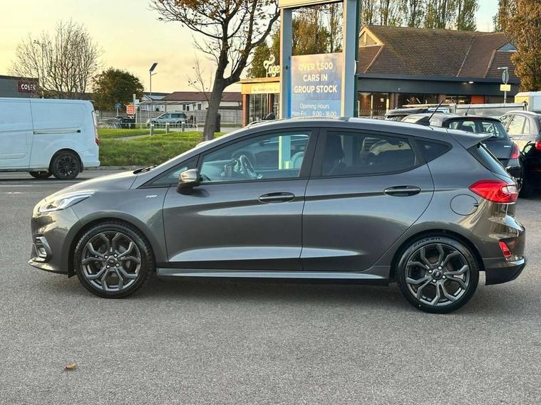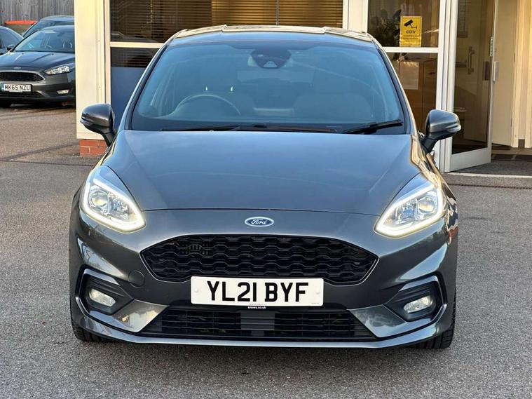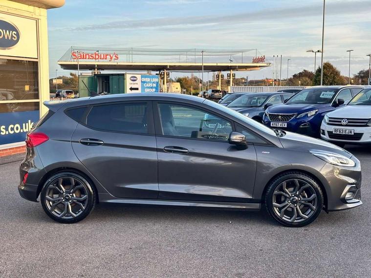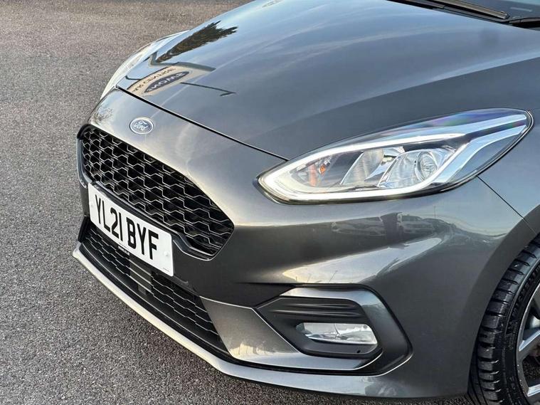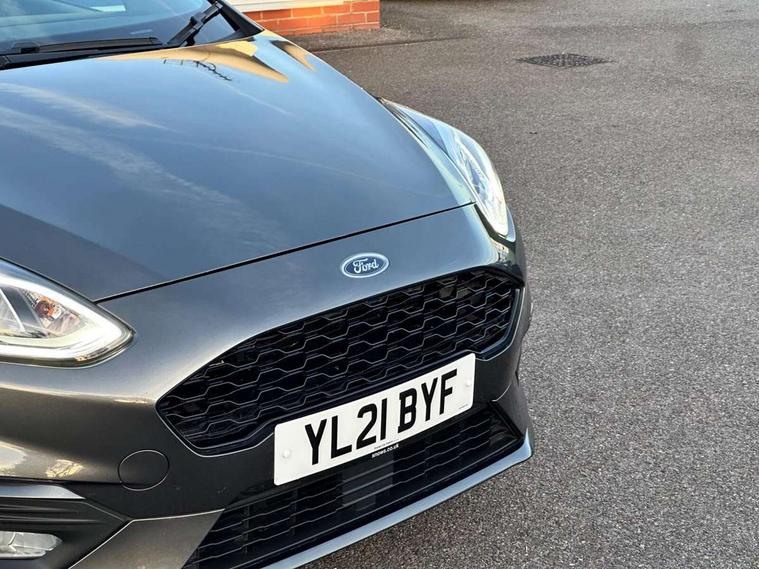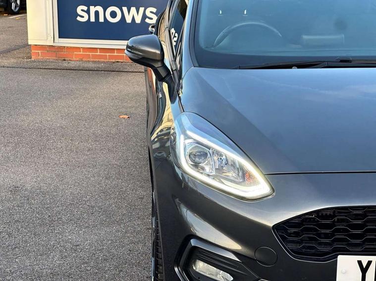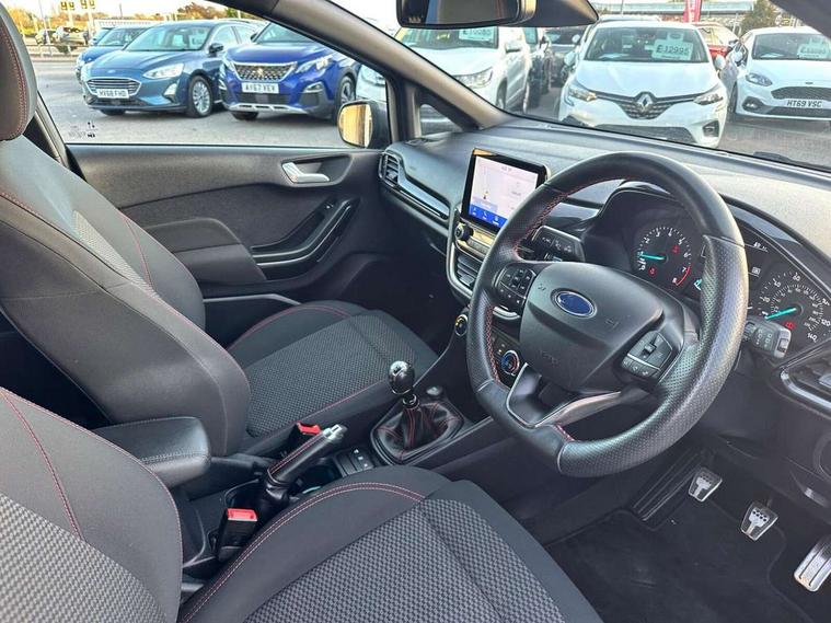 Bluetooth system, Electric power steering, Ford easy fuel, Ford SYNC 3 Navigation system incl 8" touchscreen, 7 speakers, FordPass connect, Apple carplay, android auto, voice control and emergency assistance, Rear parking distance sensors, Selectable drive modes (Normal, Sport, Track), Trip computer, Sports suspension, 2 USB ports, Auxiliary input socket, DAB Digital radio, Steering wheel mounted controls, Body colour bumpers, Body colour door handles, Body colour large rear spoiler, Body coloured electrically operated and heated door mirrors with side indicators, Cornering front fog lights, Electric front windows/one touch facility, Electric rear windows, LED Night signature to rear lights, Quickclear heated windscreen, Rain sensing wipers and auto dimming rear view mirror, Rear privacy glass, Rear wiper, Unique ST-Line upper grille & full bodystyling kit with ST-Line wing badges, 3 spoke flat bottomed leather steering wheel, 60/40 split folding rear seat, Adjustable head restraints, Black headlining, Boot carpet, Centre console with opening armrest, 2x cupholders, 12v and USB, Chrome inner door handles, Cloth upholstery, Footwell illumination, Front floor mats in velour, Front map reading lights, Front seat and rear pockets, Illuminated glovebox, Leather gaiter, Load area light, Manual 2 way passenger seat adjust, Manual 4-way driver seat adjust, Manual air conditioning, Overhead console with sunglasses holder, Pollen filter, Rake/reach adjustable steering wheel, Sensico wrapped steering wheel, Sports front seats, NCAP Pack - Fiesta, 3 point seatbelts on all rear seats, ABS+EBA, Curtain airbags, Driver and passenger airbags, Drivers knee airbag, Electronic stability control with hill start assist, Front passenger airbag deactivation, Front side airbags, Seatbelt warning, Two tone horn, Tyre pressure monitoring system, Keyless start with 'Ford Power' starter button, MyKey system, Remote central locking & engine immobiliser, Thatcham Cat.1 alarm, 17" 5 spoke alloy wheels with rock metallic finish,