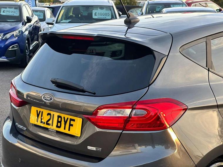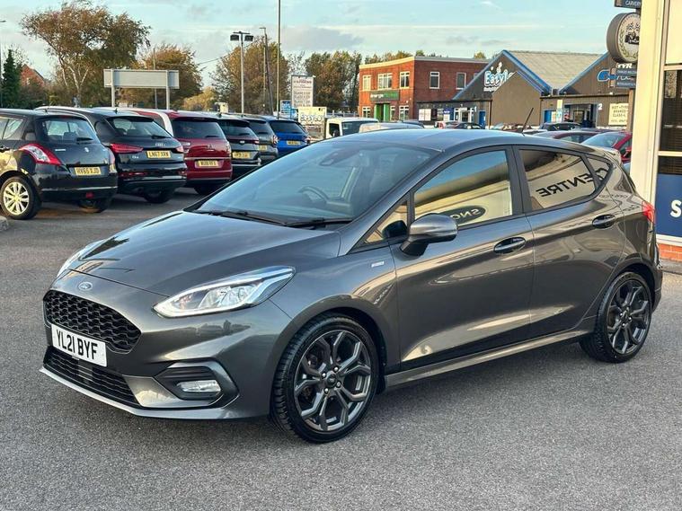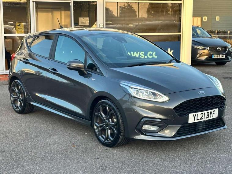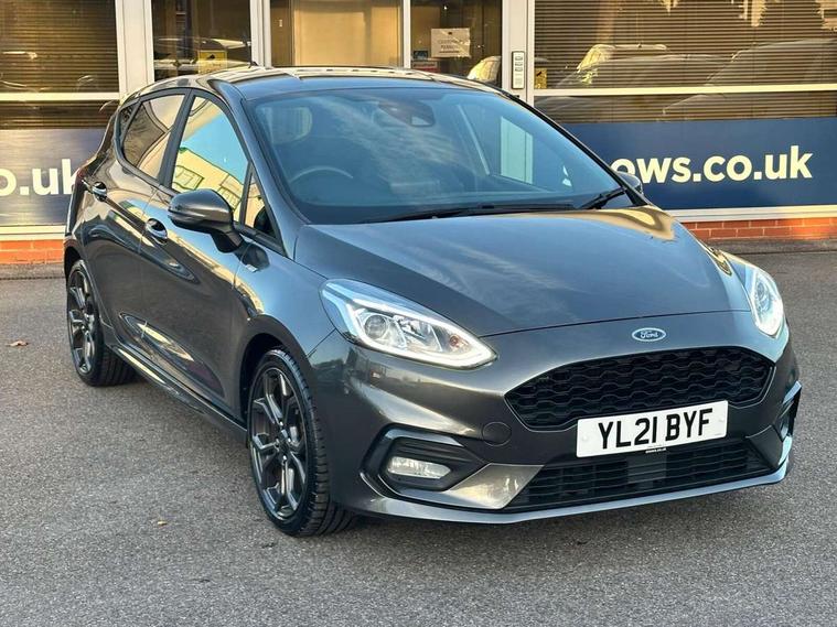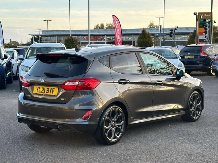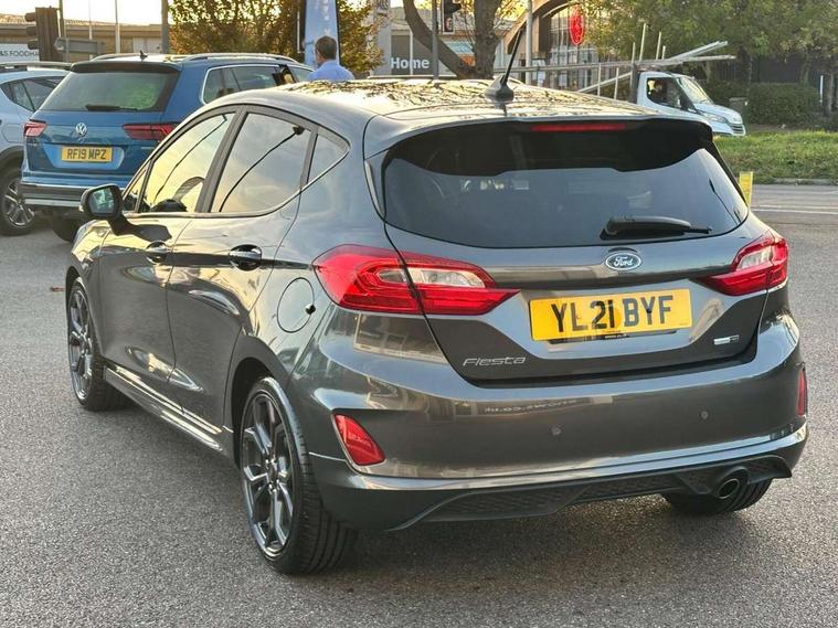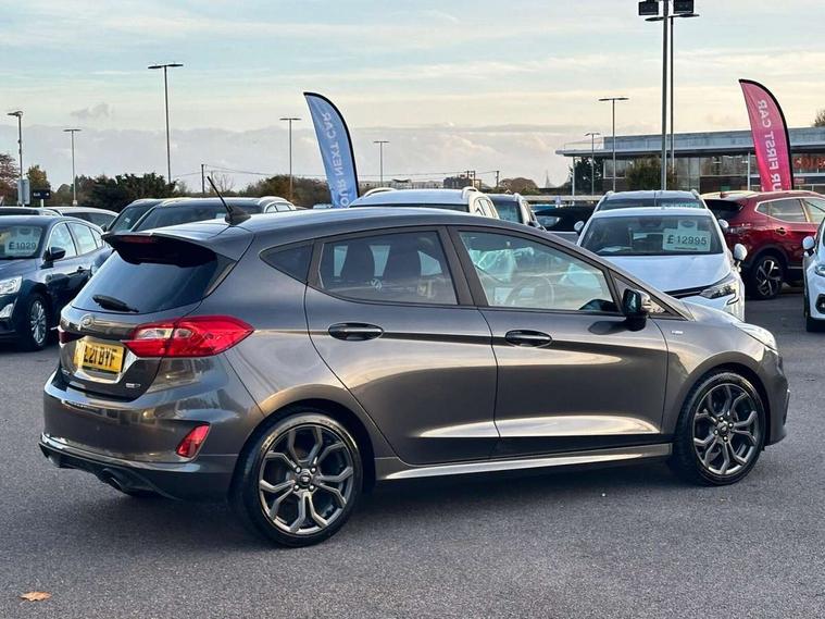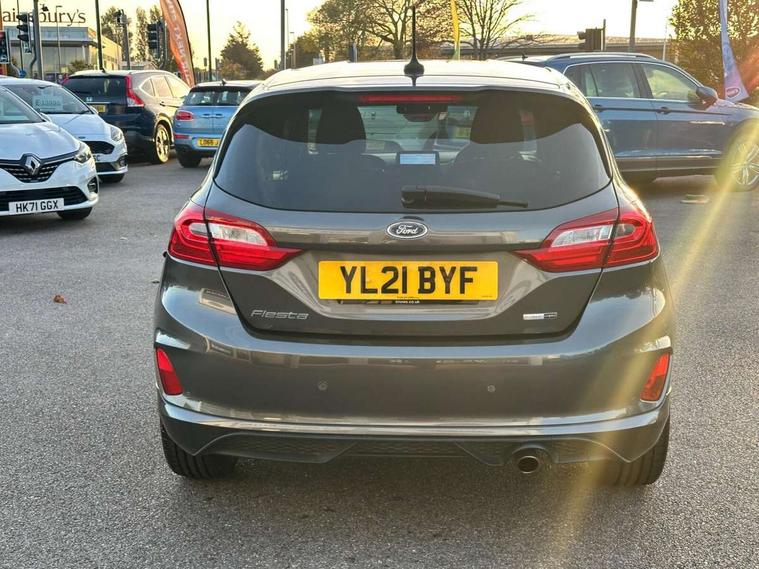 Bluetooth system, Electric power steering, Ford easy fuel, Ford SYNC 3 Navigation system incl 8" touchscreen, 7 speakers, FordPass connect, Apple carplay, android auto, voice control and emergency assistance, Rear parking distance sensors, Selectable drive modes (Normal, Sport, Track), Trip computer, Sports suspension, 2 USB ports, Auxiliary input socket, DAB Digital radio, Steering wheel mounted controls, Body colour bumpers, Body colour door handles, Body colour large rear spoiler, Body coloured electrically operated and heated door mirrors with side indicators, Cornering front fog lights, Electric front windows/one touch facility, Electric rear windows, LED Night signature to rear lights, Quickclear heated windscreen, Rain sensing wipers and auto dimming rear view mirror, Rear privacy glass, Rear wiper, Unique ST-Line upper grille & full bodystyling kit with ST-Line wing badges, 3 spoke flat bottomed leather steering wheel, 60/40 split folding rear seat, Adjustable head restraints, Black headlining, Boot carpet, Centre console with opening armrest, 2x cupholders, 12v and USB, Chrome inner door handles, Cloth upholstery, Footwell illumination, Front floor mats in velour, Front map reading lights, Front seat and rear pockets, Illuminated glovebox, Leather gaiter, Load area light, Manual 2 way passenger seat adjust, Manual 4-way driver seat adjust, Manual air conditioning, Overhead console with sunglasses holder, Pollen filter, Rake/reach adjustable steering wheel, Sensico wrapped steering wheel, Sports front seats, NCAP Pack - Fiesta, 3 point seatbelts on all rear seats, ABS+EBA, Curtain airbags, Driver and passenger airbags, Drivers knee airbag, Electronic stability control with hill start assist, Front passenger airbag deactivation, Front side airbags, Seatbelt warning, Two tone horn, Tyre pressure monitoring system, Keyless start with 'Ford Power' starter button, MyKey system, Remote central locking & engine immobiliser, Thatcham Cat.1 alarm, 17" 5 spoke alloy wheels with rock metallic finish,