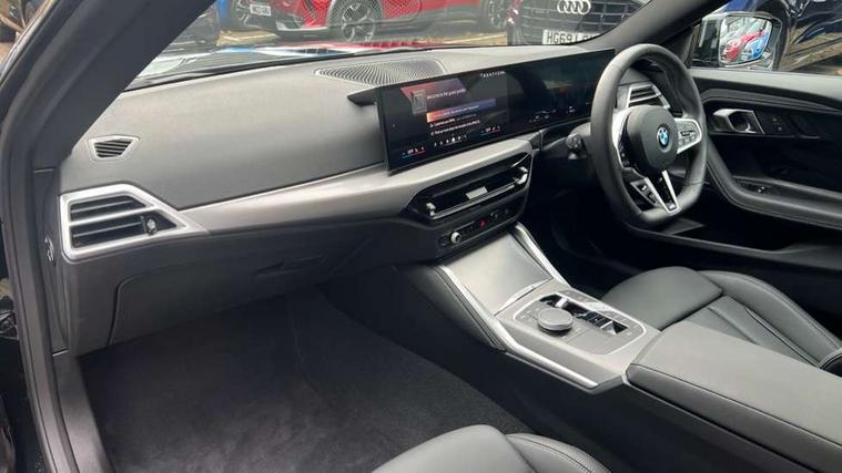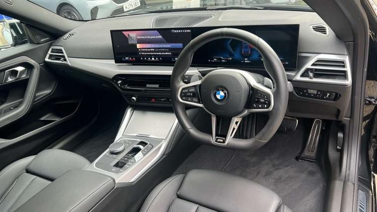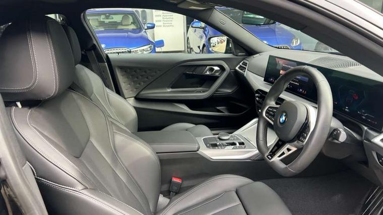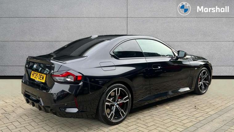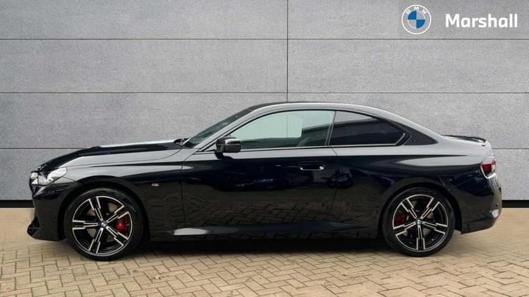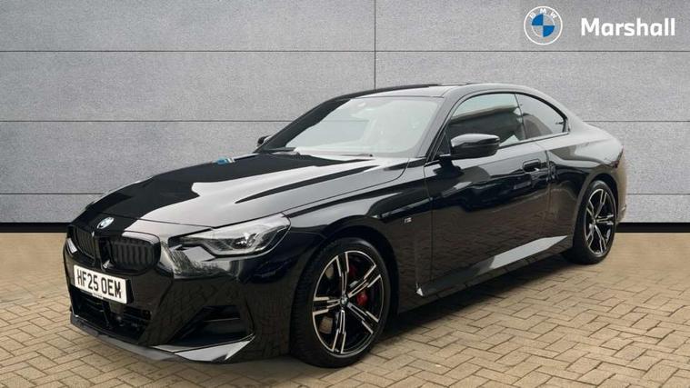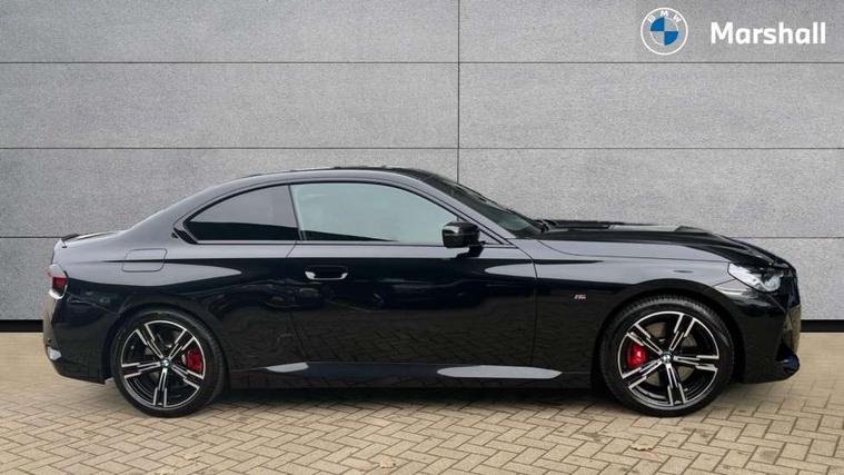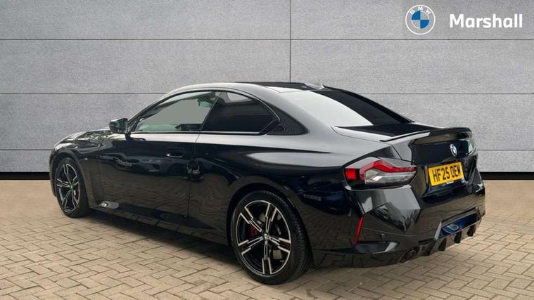 2 USB connections for charging and transferring data, Active guard plus, Attentiveness assist, Bluetooth with USB, BMW ConnectedDrive online services, BMW Intelligent Personal Assistant, BMW Live cockpit plus, BMW operating system 8 with variable, configurable widgets display information in real time, BMW Teleservices, Check Control warning system for monitoring of lights and door/luggage compartment open warning, Control Infotainment, Direct selection buttons, Drive off assistant, Eco pro mode, Electric power steering, eSim with 5G connectivity, Front and rear parking sensors, iDrive controller with turn and press function, Integrated owners handbook, Intelligent functions, Oil sensor for level and grade, Optimum shift indicator, Personal Profile, Smartphone integration, Touch operation on control display, Variable sport steering, Widescreen multi-media display, WiFi interface for wireless connection of mobile terminal devices, Aluminium lightweight construction, Balancer shaft, BMW TwinPower Turbo four-cylinder petrol engine, Double VANOS, Drive performance control with ECO PRO comfort + sport mode, Electronic differential lock, High precision injection, M sport suspension, Petrol Particulate Filter, Steptronic transmission with gearshift paddles, Twin scroll turbocharger with Valvetronic, DAB tuner, Acoustic windscreen wipers for reduced driving noise, Automatic windscreen wipers and automatic headlight, Body colour door handles flush with door surface, Body colour door mirrors, Body colour front and rear bumpers, Daytime running lights, Electric windows - front and rear, with open/close fingertip control and trap release, Exhaust tailpipes x2 - 90mm in left and right, Fading support, Front and rear bumper system with replaceable deformation elements, Front door sill finishers in black plastic with BMW designation, Front windscreen wipers with integrated washer jets, Green tinted heat protection glazing, High beam assistant, High gloss black sill, bumper trim sides and diffuser insert, High level third brake light, Indicators integrated int mirror housing, Interior rear-view mirror with automatic anti-dazzle function, LED registration plate light, LED technology rear tail lights, brake lights and turn indicators, Lightweight engineering, M high gloss shadowline, One piece kidney grille with hight gloss chrome surround, Rear boot, Rear fog lights, Reversing light in rear light cluster, Shark fin antenna, Single part LED rear lights with smoked glass components, Trailer stabilisation logic, Visible VIN plate, 12V power socket in front centre console with blanking plug, 2 cupholders in front centre console, 2 zone automatic air conditioning, Ambient lighting, Compartment in front of cupholder, Conditioned based service, English handbook, Folding rear seat head rests, Front and rear side armrests integrated into door trim, Front armrest, Front door pockets, Front head restraints, Heated front seats, Illuminated glove compartment with separate small compartment, M headliner Anthracite, M sport leather steering wheel, Manually adjustment steering wheel column, Rear seat backrest with manual 40:20:40 split folding, Rear seat centre foldable armrest with integrated cup holder, Single front passenger seat, Storage compartment between rear seats, Storage tray and compartment with cover in centre console, Sun visors with vanity mirrors and insert tab, Through loading system with 40/20/40 split folding 2 rear seat in 2nd row, Velour floor mats, Additional storage compartment pack without USB - 2 Series Coupe, Connected pack professional - 2 Series Coupe, 2 tone horn, Anti lock braking system (ABS) with cornering brake control, Automatic Stability Control (ASC), BMW emergency call, Brake drying, Child seat ISOFIX attachment for the two outer rear seats, Crash sensor activating of airbags, Unlocking doors, hazard warning lights, interior light, safety battery terminal, Deactivation of fuel pump in the event of a crash, Driver and front passenger airbags, Driver and front passenger side airbags, integrated in the door side seat backrest bolsters for all seat variants, Dynamic brake control, Dynamic stability control + (DSC+), Dynamic Traction Control - DTC, Electrically operated hand brake including automatic hold function and automatic release when driving off, Front and rear disc brakes, Front centre airbag between driver and front passenger seats, Front passenger airbag deactivation, Head airbags for all 4 outer seats, PC iBrake (Post crash approach control warning with light braking function), Seat belt security check for driver and front passenger, Seatbelt warning, Side impact protection, Three point seat belts on 4 seats including front belt stopper, pyrotechnic belt tensioners and belt force limiters, Tyre pressure monitoring system, Warning triangle and first aid kit, Alarm system (Thatcham 1) with remote control and electronic engine immobiliser, Central locking switch for all doors, fuel filler cap and luggage compartment, Deadlocking function system to all doors, Drive away locking system on all doors and luggage compartment, Locking wheel bolts, Start/Stop button (illuminated) in centre console with keyless engine start and Auto Start-Stop deactivation button, Two remote control key with integrated key - one button for open and close doors/fuel flap/tailgate and separate button for unlock luggage compartment, Electrically powered 12V compressor, Reduced rolling resistance tyres, Tyre repair kit,