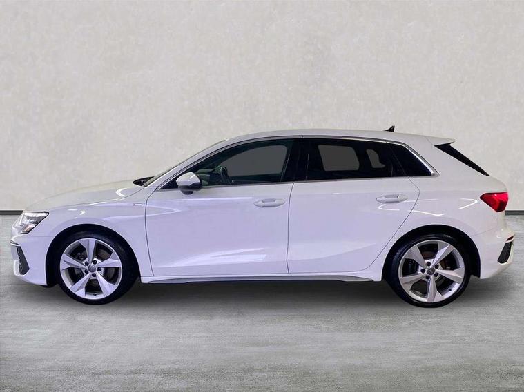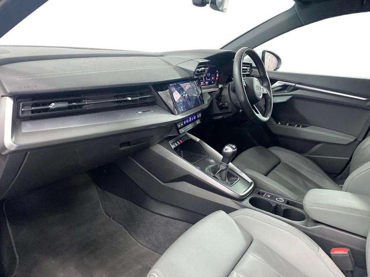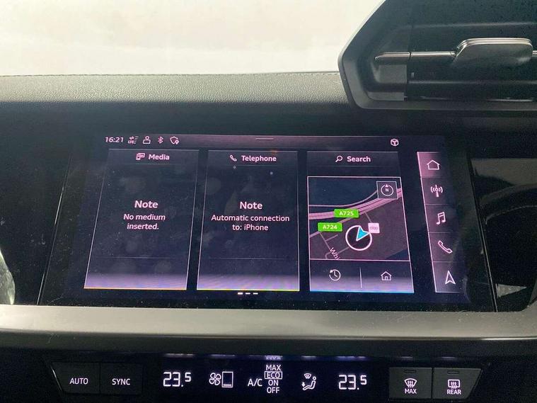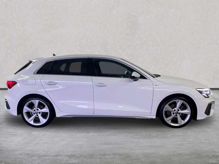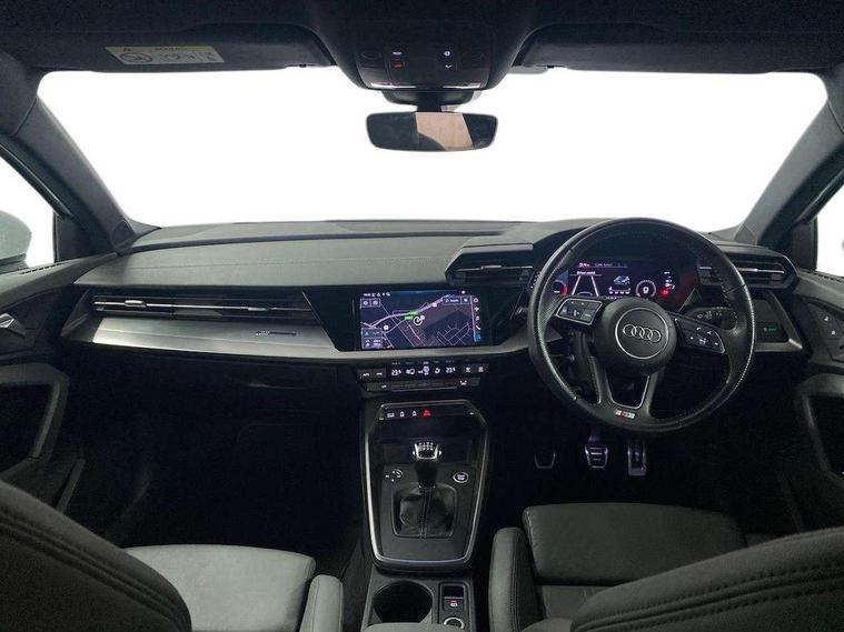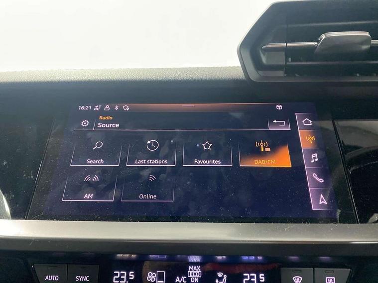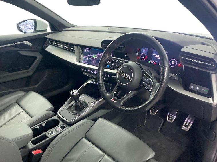 Audi connect emergency call and service, Audi drive select (Auto, Comfort, Dynamic, Efficiency and Individual), Audi smartphone interface, Audi Virtual Cockpit - 10.25" digital and colour instrument cluster, Automatic start/stop system with recuperation, Bluetooth interface, Collision avoidance assistant, Cruise control, Electromechanical power speed sensitive steering, Lane departure warning system, MMI Navigation Plus with high resolution 10.1" colour touch screen display, Rear parking sensors, Service indicator, Trip computer, Voice control system with natural language interaction, 1xUSB-A and 1xUSB-C connection, 6 passive loudspeakers, DAB Digital radio, Acoustic glass windscreen, Aluminium window trim, Auto dimming frameless rear view mirror, Body colour exterior mirrors, Electrically adjustable/heated/folding/dimming door mirrors with kerb view includes integrated LED indications + kerb view function for passenger side, Front electric windows, Illuminated aluminium inserts front door sills with S logo, LED daytime running lights, Light and rain sensors, Privacy glass - dark tinted rear window, rear door and side windows, Rear electric windows, Rear side air outlets in grained matt black, Rear wiper, S line bumpers, S roof spoiler, 12V socket and storage compartment in front centre console, 40/20/40 split folding rear seat bench with cupholder, Black cloth headlining, Dual zone electronic climate control, Front and rear centre armrest in leather, Front and rear headrests, Front/rear floor mats, Height and reach adjustable steering wheel, Interior lighting - glove compartment light and right hand side, Luggage compartment floor covering, Manual boot compartment lid, Manually adjustable front seats, Seat side bolsters, Stainless steel pedals and front footrest, Twin leather upholstery with front sports seats S embossed logo, Aluminium interior elements pack - A3 Sportback, S line styling pack - A3 Sportback, 3x3 point rear seat belts, Driver and front passenger airbag with passenger airbag deactivation, Electronic Stabilisation Control (ESC) including ABS, ASR and EDL, First aid kit with warning triangle and 2 safety vests, Hill hold assist, Pre-sense front with pedestrian and cyclist detection, Seatbelt monitoring, Tyre pressure loss indicator, Anti theft alarm, Anti-theft wheel bolts, Electronically operated child lock, Immobiliser, Remote control central locking, Accent surfaces in the dashboard and centre console in platinum grey silk effect paint finish, Dark spectrum aluminium inlays,