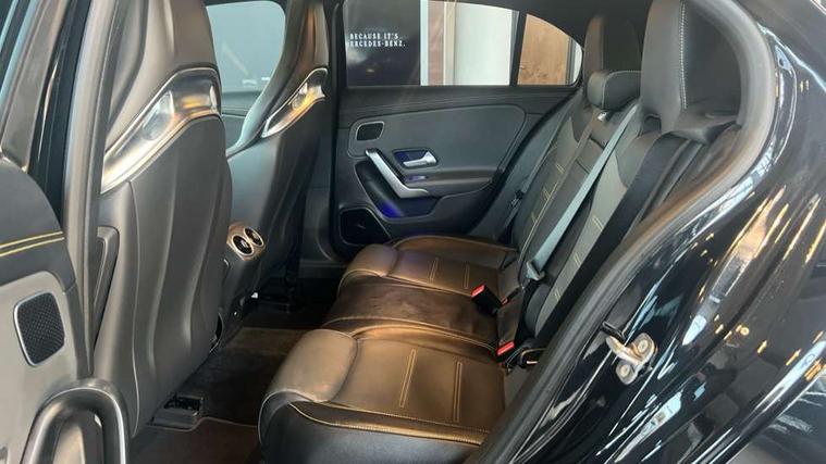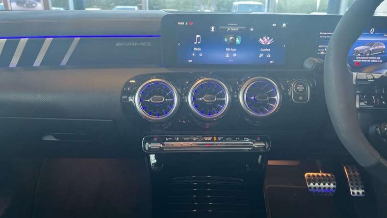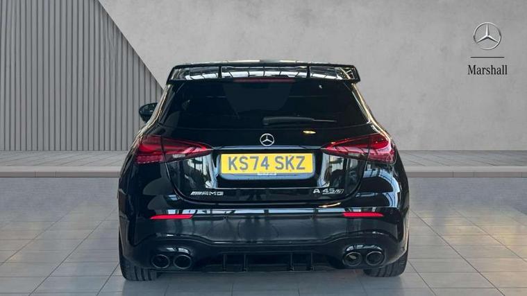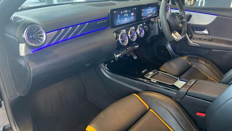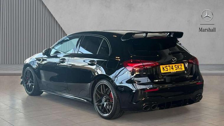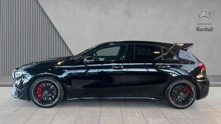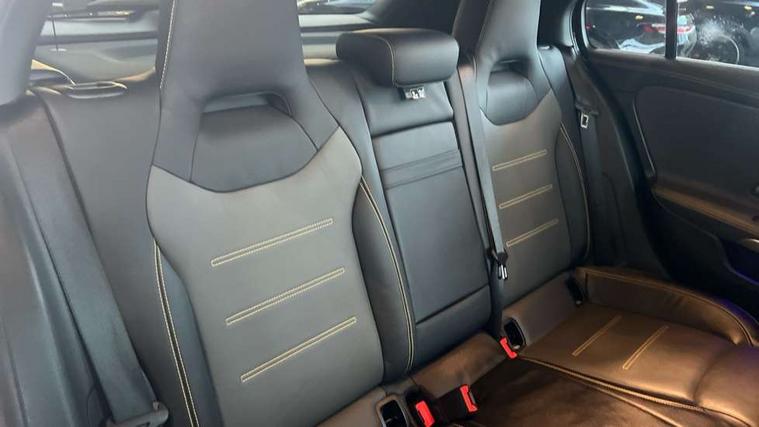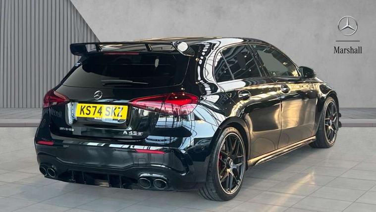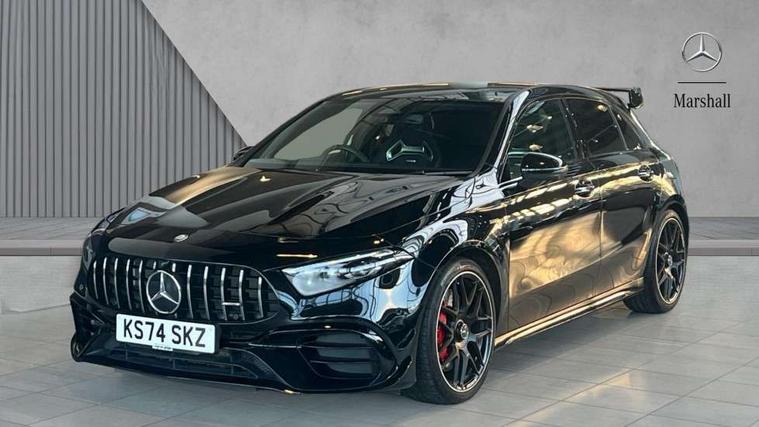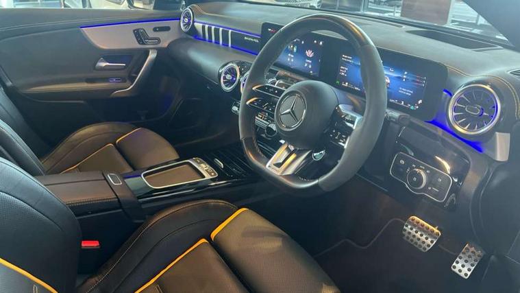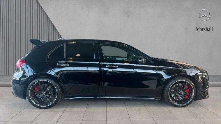 10.25 inch touchscreen central media display with AMG specific, AMG start up logo, visualisation of the AMG drive programs, vehicle and engine data, 10.25" Digital instrument cluster display screen, AMG DYNAMIC SELECT with drive modes(Slippery, Comfort, Sport, Sport+, Individual and Race) incl drift mode via steering wheel shift paddles+Race Start, AMG menu with sporty additional information - Gear indicator with yellow M symbol manual mode, Warm Up menu and Set Up menu, AMG speed sensitive steering with two sets of steering characteristics, Attention assist, Brake pad wear indicator warning light, Car wash mode, Direct steering, Dual bluetooth interfaces, ECO start/stop function, Engine start/stop button, Fingerprint scanner, Fluid level warning indicator for fuel, oil, coolant and washer fluid, Fluorescent jacket for driver, Hard-disk navigation, Head up Display, Hey Mercedes Voice activation, Lamp failure indicator, MBUX augmented reality for navigation, MBUX Interior assistant, Mercedes me connect including emergency call system, accident recovery, breakdown and maintenance management, Mercedes me remote services, Outside temperature gauge, Owners manual in English, Pre-installation of private car share, Preinstallation for Mercedes Benz link, Remote boot closing, Service indicator (ASSYST), Smartphone integration with Apple CarPlay and Android auto, Speed sensitive power steering, Tailgate, Traffic sign assist, Trip computer in multifunction display with current consumption indicator, Wireless charging, AMG performance 4MATIC+ with torque control, AMG suspension including AMG specific axles and sporty spring/damper setup, Suspension with adaptive damping system, Burmester surround sound system (590W) with Dolby atmos, speakers - 1 center+4 doors+2 in C pillars, tweeter, subwoofer, DSP amp, burmester lettering, DAB Digital radio, MBUX multimedia system, 4 Electric Front and Rear windows, Adaptive brake lights, AMG A45 S bodystyling -rear apron, four vertical fins, side sill panels, roof spoiler lip, specific front apron, diffuser look and S label on boot lid, AMG real performance exhaust sound system, AMG specific radiator grille in high gloss chrome with AMG lettering, Beltline strips in High gloss Black, Body colour bumpers, Body colour door handles with chrome inserts, Body colour side skirt, Electric adjustable and heated door mirrors with integrated LED side indicators, Headlamp assist automatic headlamp activation, Heat insulating dark tinted rear and rear side windows, Heated glass rear windscreen + timer control, LED daytime running lights, LED High level third brake light, LED tail lamp, Multibeam LED headlamps with adaptive highbeam assist and cornering function, Panoramic sliding sunroof, Privacy glass, Radio aerial, Rain sensing windscreen wipers with two sensitivity settings, Rear fog lights, Rear side wing doors, Rear windscreen wiper, Surround lighting with logo projection, Two round twin tailpipe trim elements each measuring 90 mm in diameter and AMG lettering plus ribbing on the inside of the pipe, Valve control dependent on drive program, Wider wheel arches for AMG wheels, Window line trim strip in black, 3 seat bench in 2nd row, 3 Spoke flattened lower section sporty design AMG Performance steering wheel in nappa leather/microcut microfibre, 40:20:40 split folding rear seats, Air conditioning - Two zone thermotronic luxury automatic climate control with display, AMG brushed stainless steel sports pedals with rubber studs, AMG centre console finished with trim in silver chrome, AMG floor mats, AMG performance seats, AMG sporty centre console with raised front section and integral control switched for manual transmission mode, AMG steering wheel buttons, Automatic child seat recognition sensor, Black air vents with surround in silver chrome, Black roof lining, Electrically adjustable front memory seats including lumbar support and backrest inclination, Front centre armrest with stowage, Front seat head restraints, Height/reach adjustable steering column, Illuminated AMG front door sills with changeable cover, Interior lighting - 64 colour Ambient lighting, Interior mirror with reading lamps in black and frameless, Rear armrest with 2 cupholders, Rear head restraints, Seat occupancy sensor for front passenger seat, Silver coloured aluminium gear shift paddles on steering wheel, Single front passenger seat, Stowage compartment in centre console with retractable cover, Sunvisors with illuminated vanity mirrors, Twin front cupholders, Aerodynamic pack - A Class, AMG Driver's pack - A Class, AMG night pack - A Class, AMG performance high-end seat pack - A Class, Light and sight package - A Class, Mirror package - A Class, Multi-contour seat pack - A Class, Parking pack with 360 degree camera - A Class, Seat comfort pack - A Class, USB pack plus - A Class, Winter pack - A Class, 3 rear 3 point seatbelts, 3 stage electronic stability programme, ABS with Brake Assist, Active bonnet, Adaptive brake assist with hold function and hill start assist, AMG high performance brake system with red painted brake callipers and black AMG lettering at the front, ventilated and perforated brake discs, Black seatbelts, Bonnet with power domes, Childproof locks manually operated for rear doors and electrically operated for rear power windows, Crash responsive emergency lighting, Driver and passenger head and side airbags, Drivers knee airbag, Dual stage driver/passenger airbags, Electronic parking brake, ESP curve dynamic assist, ESP with ASR, Exit warning, Front and rear seatbelt reminder, ISOFIX and top tether child seat fixing points in two outer rear seats, Tyre pressure monitoring system, Warning triangle and first aid kit, Window airbags, Alarm system/interior protection/immobiliser, Guard 360 degree vehicle protection, Keyless entry lock/unlock, Keyless Go, Remote central locking and crash sensor with emergency opening function, Aluminium AMG design black/silver interior trim, 19" AMG