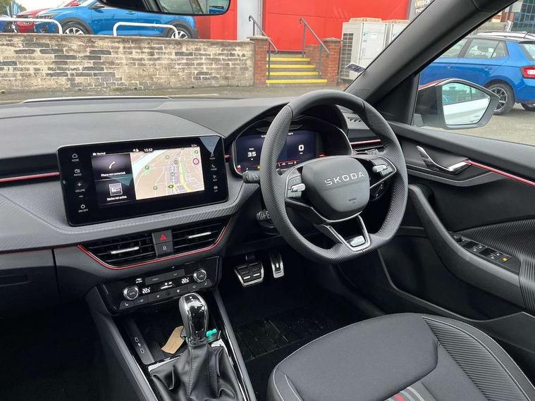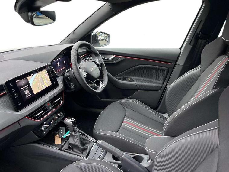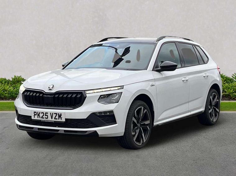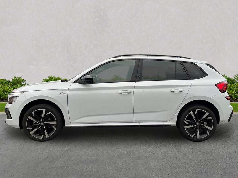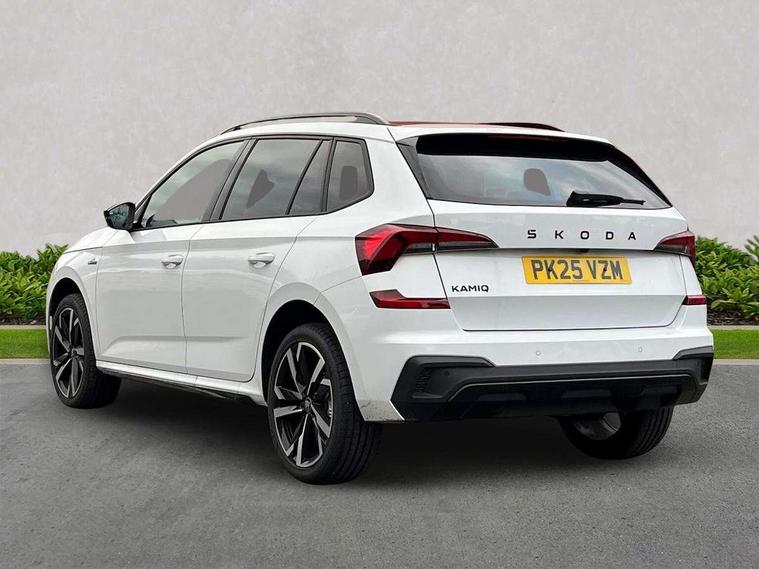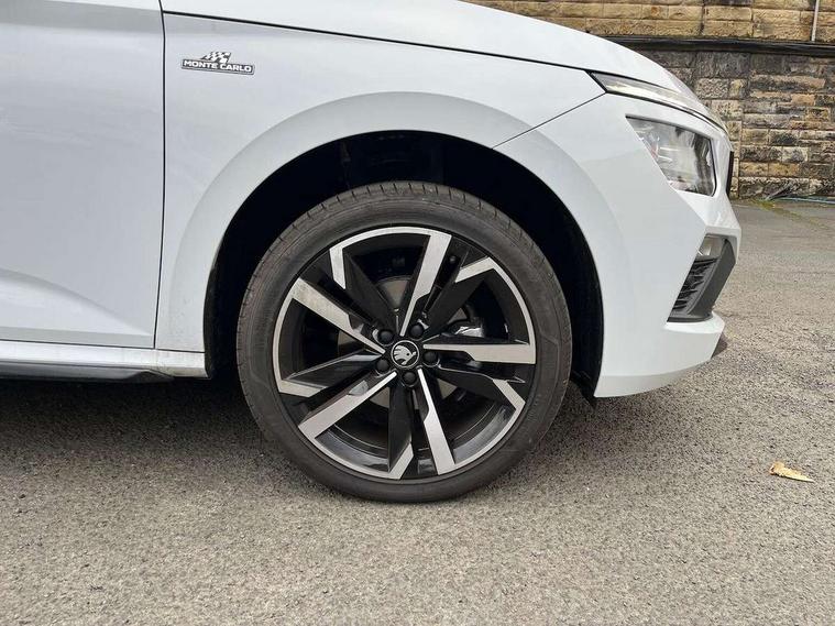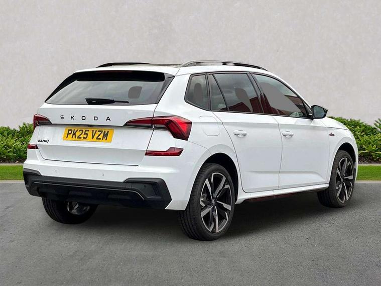 Advanced driver attention and drowsiness monitor, Bluetooth system, E-call, Front assist system, PAS, Rear parking sensors, Rear view camera, Service indicator, Speed limiter, Traffic sign recognition, Virtual cockpit with 10.25" display, Voice control system, Wireless smartlink, 4 USB C ports, 8 Speakers, 9.2" Skoda navigation display, DAB Digital radio, Auto dimming rear view mirror, Automatic headlight control with coming home and leaving home feature, Black door mirrors, Black radiator grille, Black rear diffuser, Black roof spoiler, Body colour bumpers, Body colour door handles, Boot lettering in black, Extended tailgate glass, Fixed panoramic sunroof with black roof rails, Front and rear electric windows, Heated rear window, LED daytime running lights, LED high beam, LED low beam, LED third brake light, Light sensors, Monte carlo plaque, Privacy glass, Rear side wing doors, Rear wiper, Ticket holder inside windscreen, 12V socket in luggage compartment, 3 seat bench in 2nd row, Aluminium pedals, Ambient lighting in white/red, Art leather carbon decor inserts, Art leather carbon door inserts, Black roof lining, Cargo elements, Chrome inner door handles, Driver and passenger sun visors with vanity mirror, Dual zone climate control, Front and rear roof lights, Front centre armrest, Front head restraints, Glove compartment with illumination, Height adjustable driver seat, Height adjustable front passenger seat, Ice scraper, Inner circulation control with pollen filter, ISOFIX on front passenger seat, Isofix preparation for back seats, Leather gearknob and handbrake lever, Manual lumbar support for front seats, Monte Carlo cloth upholstery, Net package and top tether hooks in boot space, Net under rear shelf, Pocket on the back of both front seats include mobile phone pockets, Rake/reach adjustable steering wheel, Reading lights, Rear centre armrests, Red hotstamping, Single front passenger seat, Sports seats, Textile floor mats, Third rear headrest, Top tether for front passenger seat, Umbrella in driver's door, Light and view plus package - Kamiq, 3x3 point rear seatbelts, Airbags - driver and front passenger, Disc brakes, ESP, Extended and predictive pedestrian/cyclist protection, Front passenger airbag deactivation switch, Front side airbags with curtain airbags, Hill hold control, Manual leather parking brake, Manual rear child locks, One tone horn, Seatbelt reminder for driver an co-driver, Traction control, Tyre pressure monitor, Anti-theft alarm system with interior monitoring, backup horn, towing protection and remote central locking with SAFE system, Anti-theft wheel bolts, Electronic engine immobilizer, 18" Ursa black diamond cut alloy wheels,