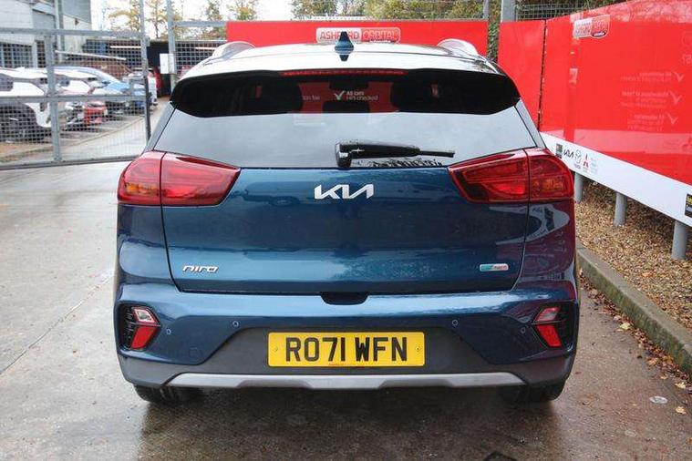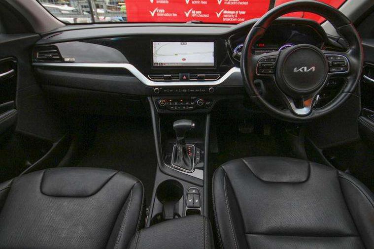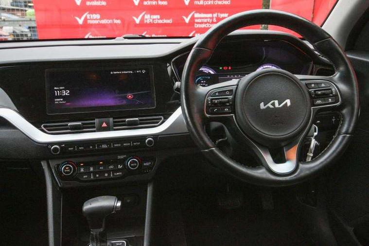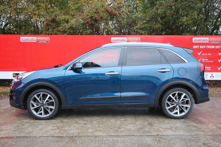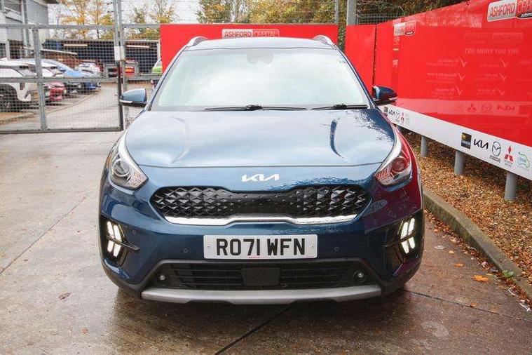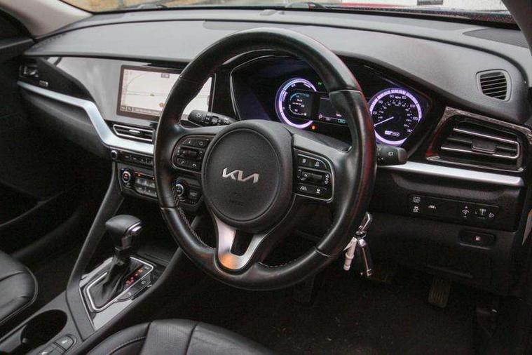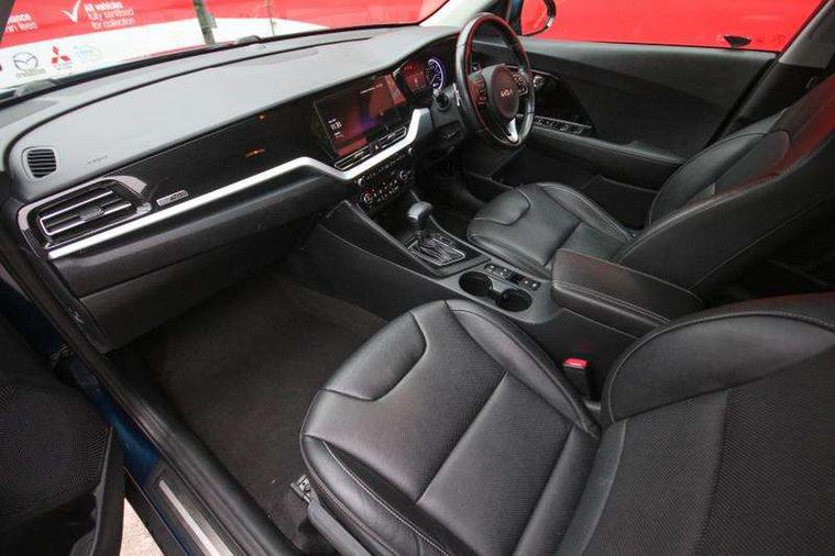 10.25" Touch screen satellite navigation with european mapping and traffic messaging channel, 7" full supervision cluster with TFT colour display, Adaptive smart cruise control function (SCC) with stop and go, Apple car play/Android Auto with voice control, Digital clock, Drive mode selector, Driver attention warning, Emergency stop signalling system, Forward collision avoidance assist, Front parking sensors, Kia connected services featuring TomTom live, Lane Following Assist (LFA), Lane keep assist, Motor driven power steering, Rear parking sensors, Reversing camera, Speed limiter, Trip computer with distance/fuel consumption/average speed, UVO connect, Wireless Smartphone charger, 'Shark fin' mobile antenna, 6 speakers, Bluetooth with music streaming, DAB Radio with MP3, Steering wheel mounted controls, USB connection located in centre console, USB port, All round electric windows with drivers and front passenger auto up/down function, Auto dimming rear view mirror, Automatic defog system, Automatic headlight control system, Black beltline mouldings, Black side sills, Black wheel arch mouldings, Body colour bumpers, Body coloured/high gloss door mirrors, Chrome door handles, Driver's side wide angle mirror, Electrically folding/adjustable/heated door mirrors with LED indicators, LED daytime running lights, LED fog lights, LED rear combination lights, Manual headlight levelling, Matt black radiator grille, Privacy glass - Rear windows and tailgate, Projector headlamps, Rain sensing front wipers, Rear spoiler, Rear wiper, Roof rails, Solar glass, Waistline black paint, Welcome and follow-me home light functionality, 3 x passenger assist grips, 60/40 split/folding 2nd row of seats, 8 way electric adjustable drivers seat, All-round height adjustable headrests, Aluminium door scuff plates, Bulb type overhead console lamp with sunglasses case, Centre console storage box, Centre room lamp, Cupholders in rear armrest, Driver/passenger sunvisors with illuminated vanity mirrors, Drivers seat power lumbar support, Dual zone automatic air conditioning, Front and rear door storage, Front/rear centre armrests, Headlining in Light grey, Heated front seats, Heated steering wheel, High gloss black lower console trim, High gloss black steering wheel trim, Illuminated ignition key hole, Interior door lock/unlock function, ISOFIX Child seat top tethers and anchor fixings, Leather trimmed door armrests, Leather trimmed steering wheel, Leather trimmed steering wheel and gearshift, Leather upholstery, Luggage area lamp, Luggage area load cover, Luggage net with hooks, Paddle shifts, Passenger seat height adjuster, Satin finish inner door handles, Seatback pocket - driver, Seatback pocket - front passenger, Tilt/telescopic adjustable steering wheel, Under floor storage box, Ventiliation ducts to rear compartment, Towing pack - Niro, 3 point seatbelts on all seats, ABS, Automatic unlocking of doors in case of impact, Drivers knee airbag, Electric parking brake with auto hold function, Electronic stability control, Front passenger airbag cut-off switch, Height adjustable front seatbelts, Hill start assist control (HAC), Traction control, Twin curtain airbags with roll over sensor, Twin front and side airbags, Tyre pressure monitoring system, Alarm system and engine immobiliser, Deadlocks, Locking wheel nuts, Remote central door locking with fold away key, Speed sensitive auto door locking, Visible vehicle identification number, High gloss black centre fascia, High gloss black door inserts, 18" Alloy wheels, Tyre mobility kit,
