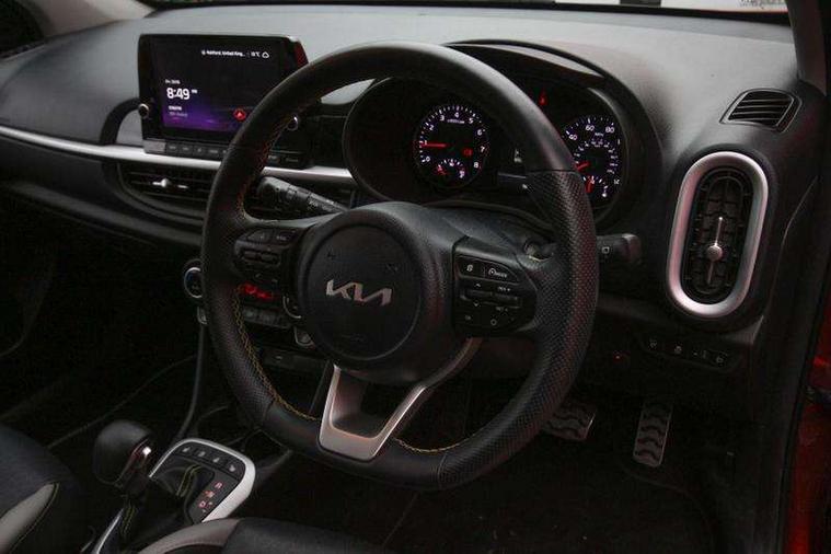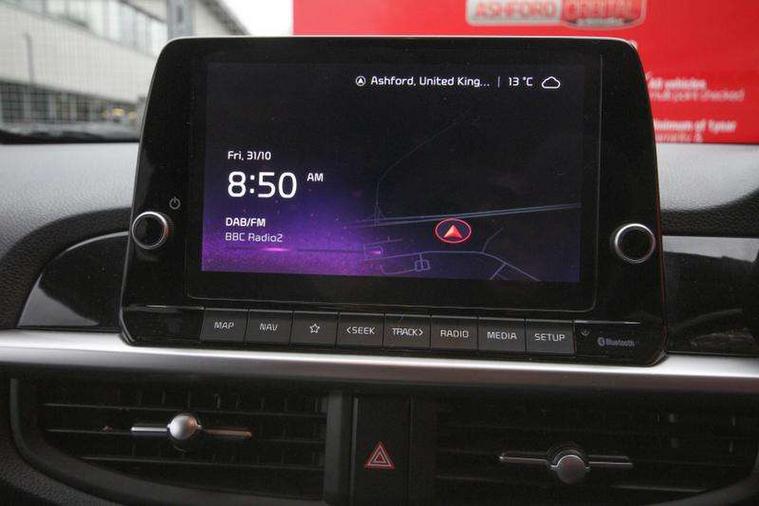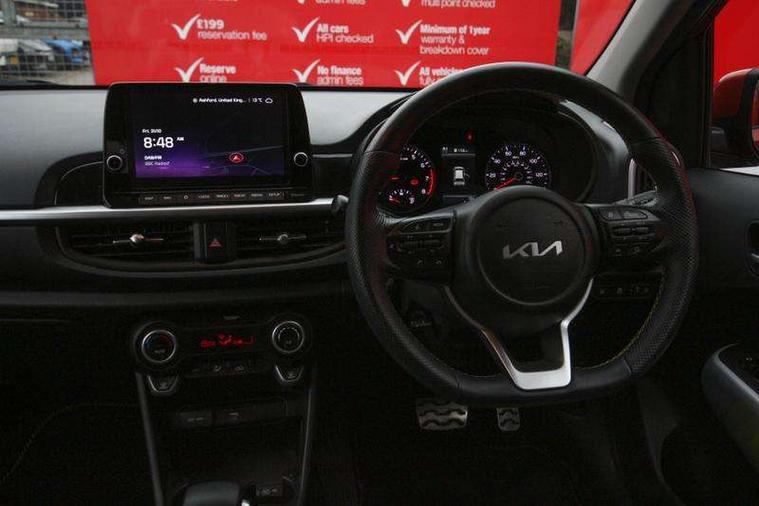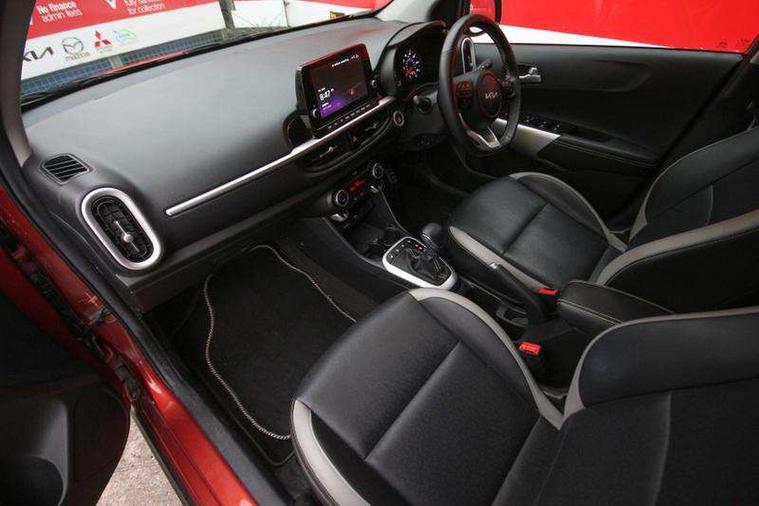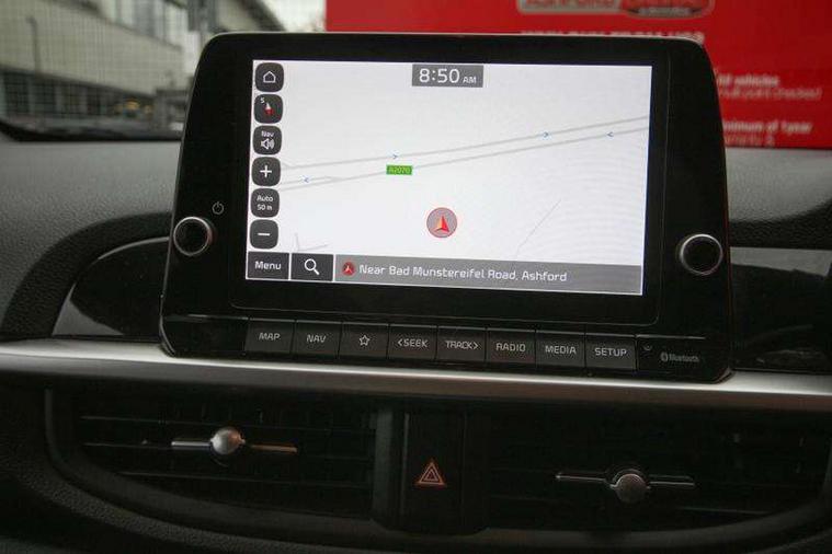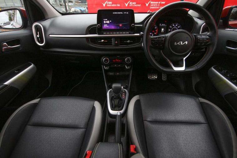 8" touch screen satellite naviagtion with RDS and DAB with telematics, Apple car play/Android Auto with voice control, Cruise control + speed limiter, Emergency call service, Emergency stop signalling system, External temperature gauge, Kia Connect (UVO), Motor driven power steering, Rear parking sensors, Reversing camera system with dynamic guidelines (Integrated into centre fascia screen), Tachometer, Trip computer, Wireless Smartphone charger, 6 speaker audio system, Bluetooth with music streaming, Steering wheel mounted controls, USB ports for connection of a media device, Automatic headlight control system, Bi-function projection headlights, Black beltline mouldings, Black grille with silver surround, Black side sill moulding, Black wheel arch cladding, Body colour B pillars, Body colour bumpers, Body coloured mirrors and chrome exterior handles, Day/night rear view mirror, Electric adjustable/heated/folding door mirrors with LED indicators lights, Front and rear bumpers with silver skid plates and twin exhaust, Front and rear electric windows with drivers's auto up/down function, Front fog lights, Headlamp levelling, Heated rear window, High mount brake light, LED daytime running lights, LED rear fog lights, LED rear lights, Privacy glass - Rear windows and tailgate, Rain sensor, Rear side wing doors, Rear wash/wipe, Speed variable front wipers, Tinted glass, Visible VIN plate, Welcome and follow-me home light functionality, 1 x rear coat hook, 12V power point front, 3 seat bench in 2nd row, 3 x passenger assist grips, 60/40 split/folding 2nd row of seats, All round height adjustable headrests, Automatic air conditioning, Centre Console with Storage Box and Sliding Armrest, Cupholders in centre console, D-cut steering wheel with green stitching, Driver and front passenger sunvisors with driver's side illuminated vanity mirrors, Driver seat height adjust, Dual Height Luggage Area Floor, Faux leather upholstery, Front cabin lights, Glovebox, Heated front seats, Heated steering wheel, ISOFIX Child seat top tethers and anchor fixings, Leather trimmed steering wheel and gearshift, Luggage area light, Luggage area parcel shelf, Metal pedals, Passenger front seatback pockets, Satin chrome interior door handles, Silver and green accents on door armrests, lower centre console trim and air vents, Single front passenger seat, Slide/reclining front seats, Tilt adjustable steering wheel, Advanced Driver Assistance Pack - Picanto, 3x3 point rear seatbelts, ABS/EBD, Automatic unlocking of doors in case of impact, Dual front airbags, ESC + BAS + VSM + HAC, Front passenger airbag cut-off switch, Front seatbelt height adjusters, Front seatbelt pretensioners + load limiters, Hill hold control, Knee airbags, Rear child proof door locks, Seatbelt warning, Side impact protection, Torque vectoring brake based and straight line stability (SLS), Traction control, Twin curtain airbags, Twin front side airbags, Tyre pressure monitoring system, Anti theft alarm, Engine immobiliser, Locking wheel nuts, Smart key with engine start/stop button, 16" alloy X-Line wheels, Tyre mobility kit,
