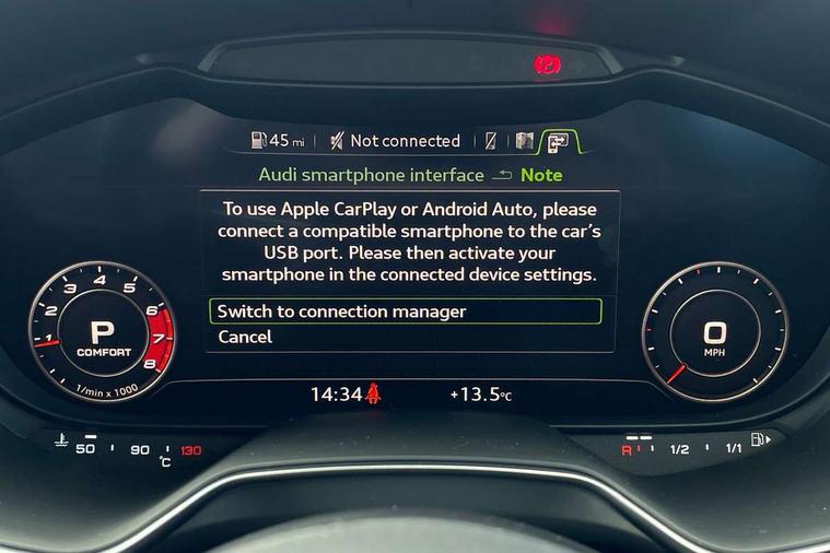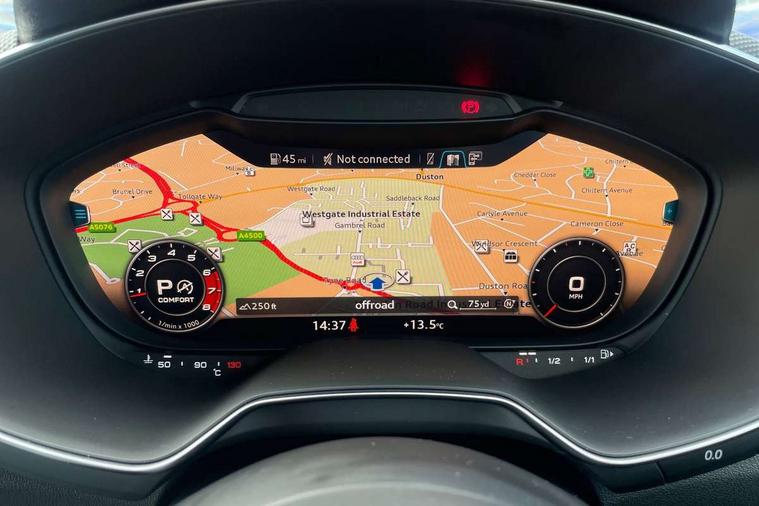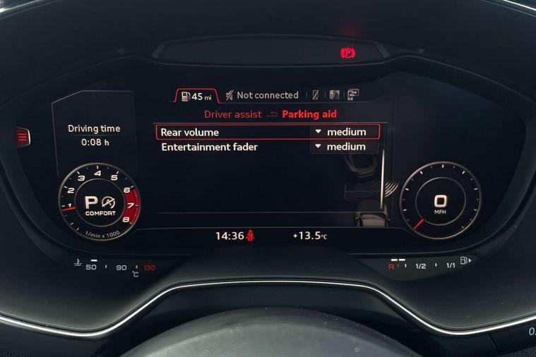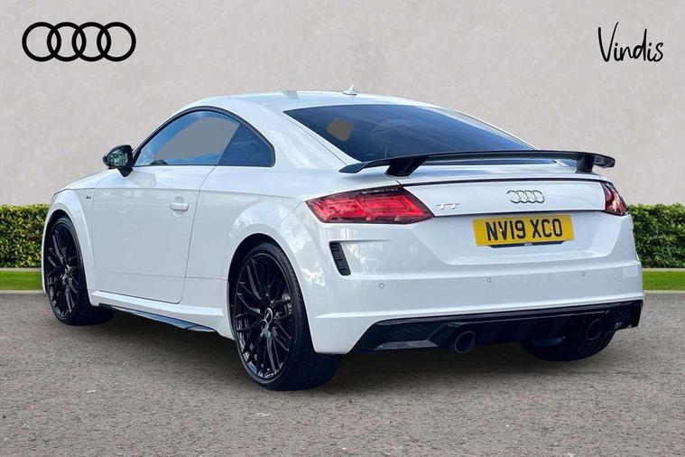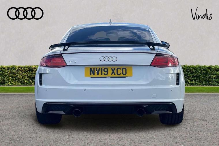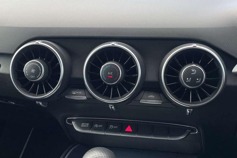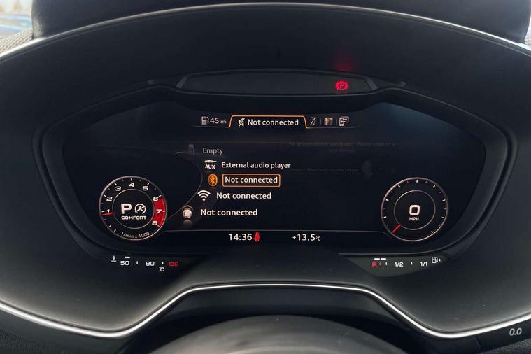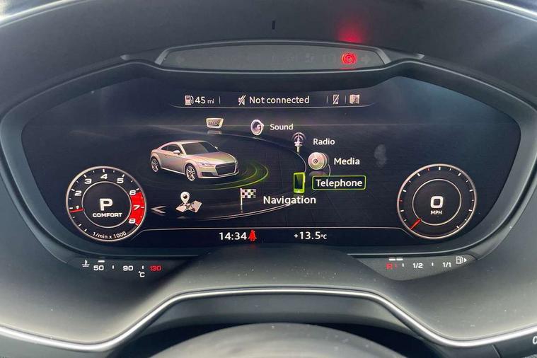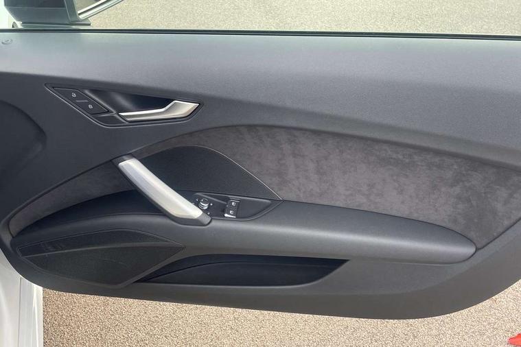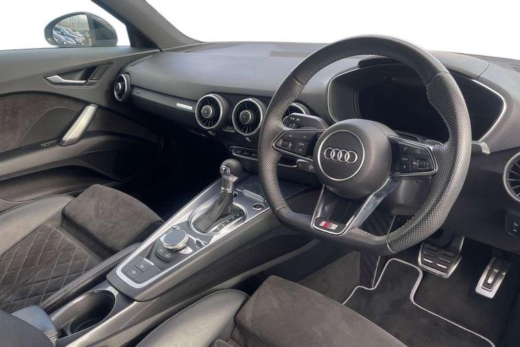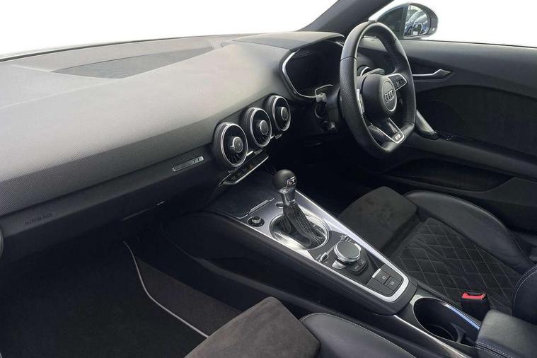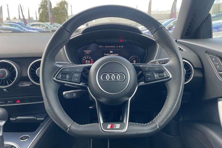 Audi drive select with 4 Pre configured modes, Audi virtual cockpit - 12.3" high-resolution LCD display with fully customisable instrument cluster, Cruise control + speed limiter, MMI touch panel, Mobile phone preparation with bluetooth interface, Progressive power assisted steering, Rear parking sensors, Service interval indicator, Start/Stop system with energy recuperation, TP memo, S line sports suspension, 8 Speakers, AM/FM radio, Audi music interface, Bluetooth audio streaming, DAB Digital radio, MMI Radio with CD player and SD/XC card slot, Auto dimming rear view mirror, Auto headlight range control, Black chrome tailpipe, Black door mirrors, Dark privacy glass from B-pillar backwards, Dynamic rear indicators, Electric front windows, Front fog lights, Green tinted heat insulating glass, Headlight wash system, LED daytime running lights, Light and rain sensors, S Line body styling, S Line front and rear bumpers, S line rear diffuser with platinum grey insert, S line sill plates, Sunband for windscreen, 12V socket, 3 spoke flat bottomed high multi-function leather sport steering wheel with gearshift paddles, 4 way electric lumbar support for driver and front passenger, Black headlining, Chrome slate grey interior trim, Door sill trims with S line logo, Extended aluminium look with stainless steel pedals, Front centre armrest, Front super sports seats, Heated front seats, Height adjustable driver's seat, Height adjustable front head restraints, Height/reach adjust steering wheel, ISOFIX child seat mounting for front passenger seat with airbag deactivation, Perforated leather gearknob, Rear top tether child seat ISOFIX attachment, S Line badge on steering wheel, Split folding rear seat, Top tether anchor plate for isofix child seat, Black styling pack - TT, Non smoking pack - TT/TT RS, 3 point front seat belts, ABS, ASR traction control, Brake energy regeneration, Curtain airbags, Driver and front passenger airbag with front passenger airbag deactivation, EDL traction control, Electromechanical parking brake, ESP, First aid kit, Front side airbags, Head airbags, Hill hold assist, Seatbelt warning, Tyre pressure warning, Warning triangle, Anti theft alarm, Anti theft wheel bolts, Immobiliser, Keyless Go, Remote central locking, Matt brushed aluminium inlays, Piano black finish inlay, Tool kit, Tyre repair kit,