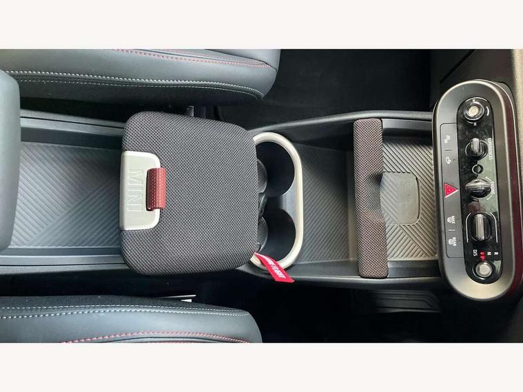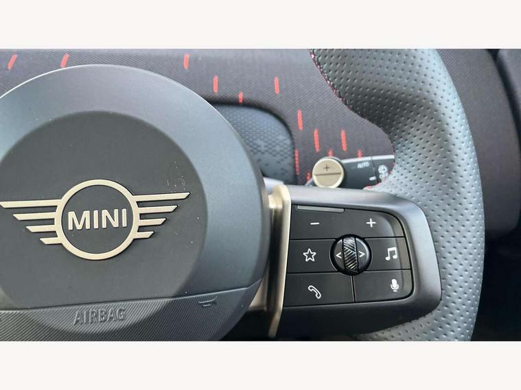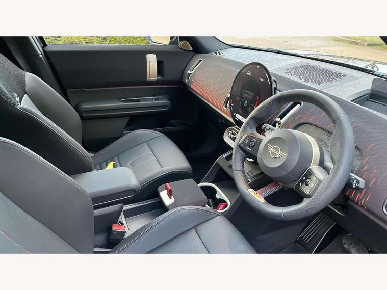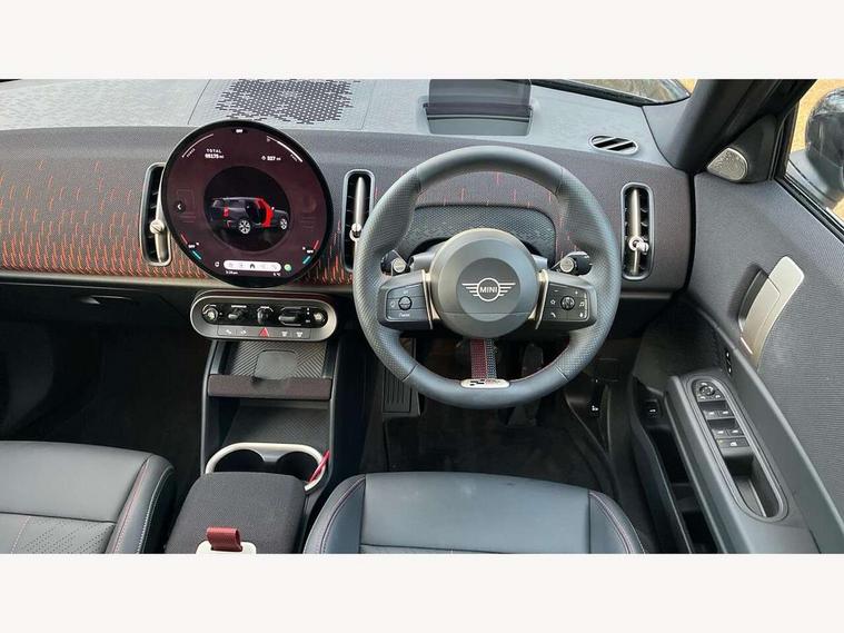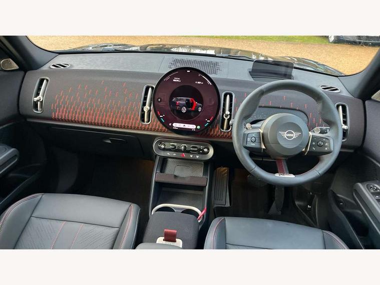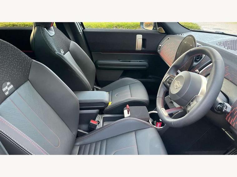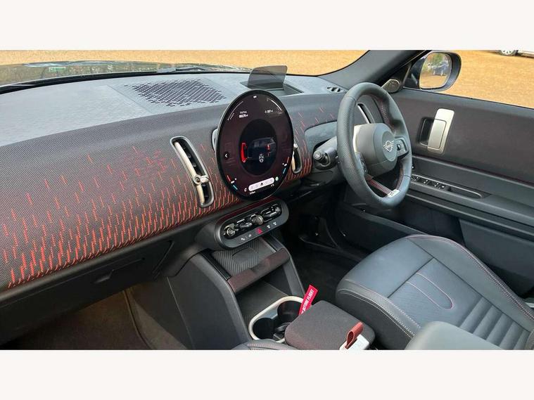 Bluetooth connection, Circular OLED Screen, Compatible mobile phone bluetooth with audio streaming, Cruise Control (DCC), Digital dashboard display, Driving assistant, Driving Assistant Plus Preparation, E-call, Electro-mechanical speed dependant steering assistance, MINI Experience Modes, MINI Head up display, Mini navigation system, MINI TeleServices, Parking assistant in camera and ultrasound based assistance system, rear view camera, parking aid and distance control, Adaptive suspension, Double clutch sports transmission, Larger capacity fuel tank, 6 speakers, DAB Digital radio, Personal eSim, Auto tailgate, Electric adjustable heated door mirrors, Front and rear apron, Front and rear electric windows, Heated rear window, High beam assistant, High gloss hexagonal patterned grille surround, Interior rear-view mirror with automatic anti-dazzle function, LED daytime running lights, LED headlights with extended contents including Adaptable light signatures, LED rear lights, LED third brake light, Rain sensor with auto headlights, Rear roof spoiler with airblades, Rear side wing doors, Rear window wiper, Roof rails, 3 Seat sliding rear bench in 2nd row, Anthracite headliner, Auto air conditioning, Driver and front passenger seat heating, Floor mats, Front armrest, Front headrests, Heated steering wheel, Height and length steering column adjustment, JCW Front sports seats, Lidded storage box in Black/Red knit, Luggage compartment separating net, Perforated Vescin steering wheel, Rear headrests, Seat adjustment for rear seats, Single front passenger seat, Sunvisors with vanity mirrors, Vescin/Cloth upholstery, Wireless charging tray, Interior and exterior mirror package - Mini Countryman, 3x3 point rear seat belts, 6 Airbags - front, side, head and seat belt tensioners, ABS, Brake calipers in Black with JCW badge, DSC - Dynamic Stability Control, Electronic handbrake, Electronic Stability Programme (ESP), Front ISOFIX (iSize), Hill descent control, Hill hold assist, Hill start assist, JCW Sport Brakes, Manual rear child locks, Traction control, Tyre pressure monitoring system, Warning triangle, Alarm system with tilt sensor, monitoring doors, bonnet interior and tailgate, Auto drive away locking, Comfort access system, Deadlocking function, Electronic vehicle immobiliser, Locking wheel bolts, Remote control locking, Start/stop toggle with keyless go, JCW Black/Red dashboard knit, MINI Mobility Kit,