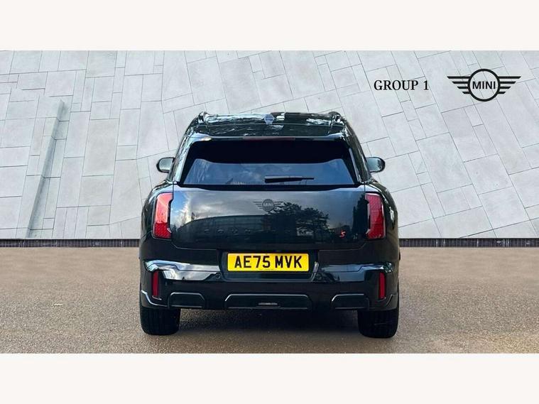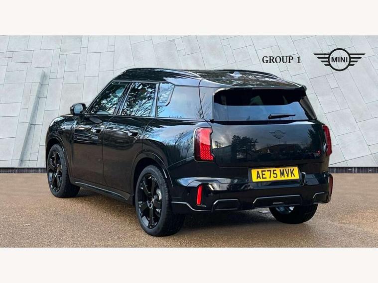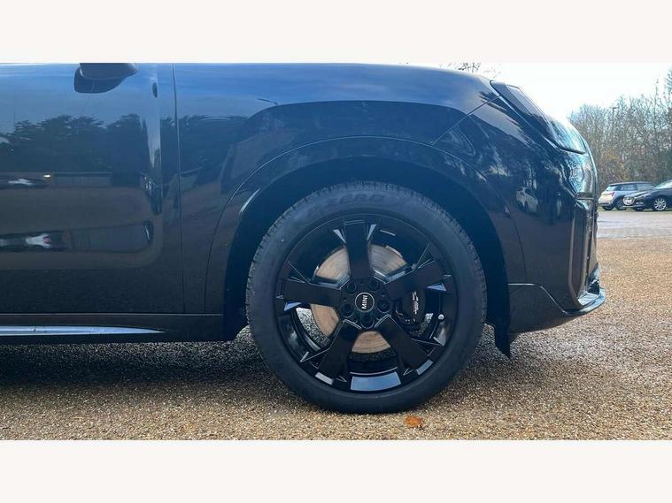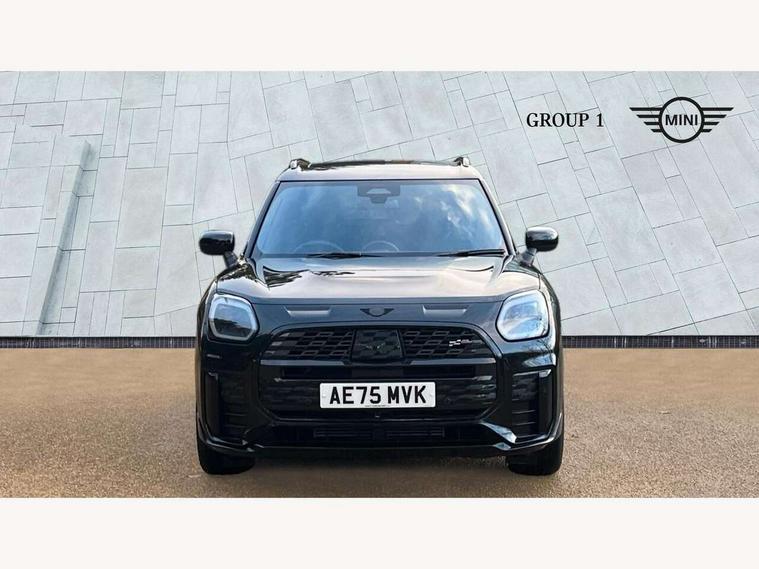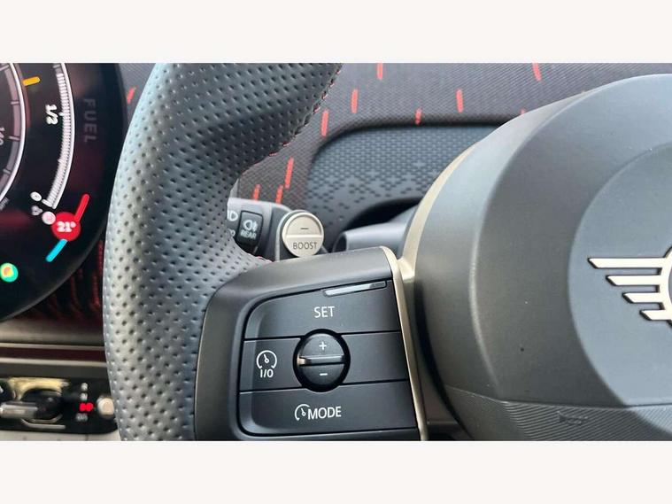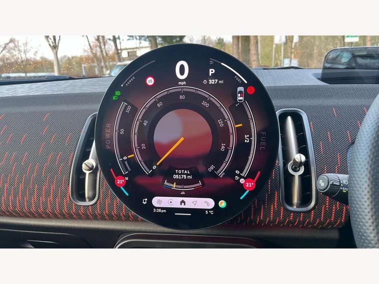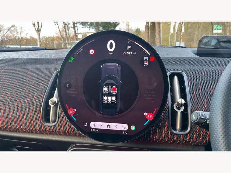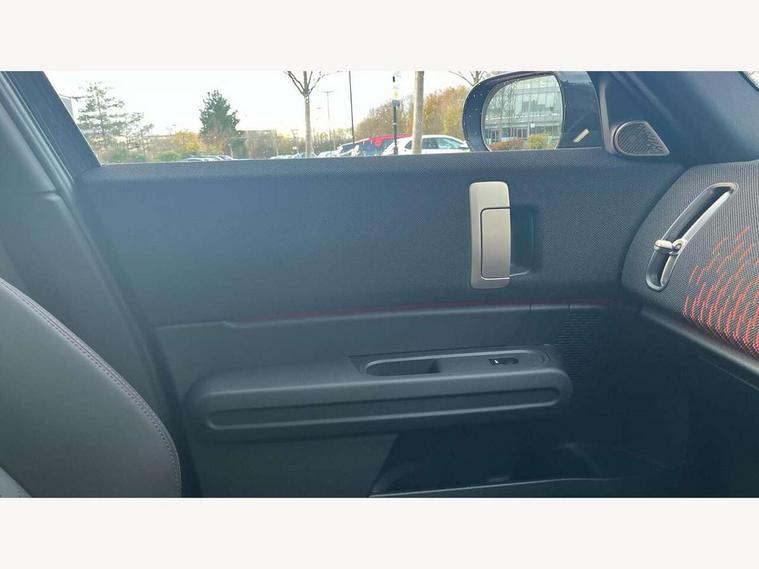 Bluetooth connection, Circular OLED Screen, Compatible mobile phone bluetooth with audio streaming, Cruise Control (DCC), Digital dashboard display, Driving assistant, Driving Assistant Plus Preparation, E-call, Electro-mechanical speed dependant steering assistance, MINI Experience Modes, MINI Head up display, Mini navigation system, MINI TeleServices, Parking assistant in camera and ultrasound based assistance system, rear view camera, parking aid and distance control, Adaptive suspension, Double clutch sports transmission, Larger capacity fuel tank, 6 speakers, DAB Digital radio, Personal eSim, Auto tailgate, Electric adjustable heated door mirrors, Front and rear apron, Front and rear electric windows, Heated rear window, High beam assistant, High gloss hexagonal patterned grille surround, Interior rear-view mirror with automatic anti-dazzle function, LED daytime running lights, LED headlights with extended contents including Adaptable light signatures, LED rear lights, LED third brake light, Rain sensor with auto headlights, Rear roof spoiler with airblades, Rear side wing doors, Rear window wiper, Roof rails, 3 Seat sliding rear bench in 2nd row, Anthracite headliner, Auto air conditioning, Driver and front passenger seat heating, Floor mats, Front armrest, Front headrests, Heated steering wheel, Height and length steering column adjustment, JCW Front sports seats, Lidded storage box in Black/Red knit, Luggage compartment separating net, Perforated Vescin steering wheel, Rear headrests, Seat adjustment for rear seats, Single front passenger seat, Sunvisors with vanity mirrors, Vescin/Cloth upholstery, Wireless charging tray, Interior and exterior mirror package - Mini Countryman, 3x3 point rear seat belts, 6 Airbags - front, side, head and seat belt tensioners, ABS, Brake calipers in Black with JCW badge, DSC - Dynamic Stability Control, Electronic handbrake, Electronic Stability Programme (ESP), Front ISOFIX (iSize), Hill descent control, Hill hold assist, Hill start assist, JCW Sport Brakes, Manual rear child locks, Traction control, Tyre pressure monitoring system, Warning triangle, Alarm system with tilt sensor, monitoring doors, bonnet interior and tailgate, Auto drive away locking, Comfort access system, Deadlocking function, Electronic vehicle immobiliser, Locking wheel bolts, Remote control locking, Start/stop toggle with keyless go, JCW Black/Red dashboard knit, MINI Mobility Kit,