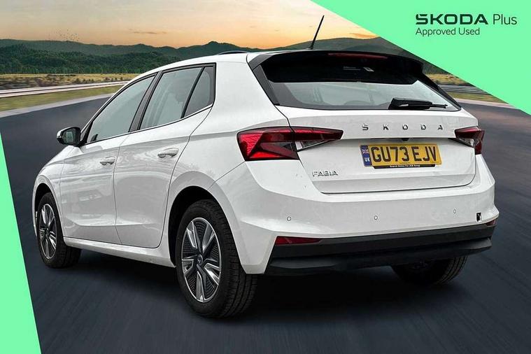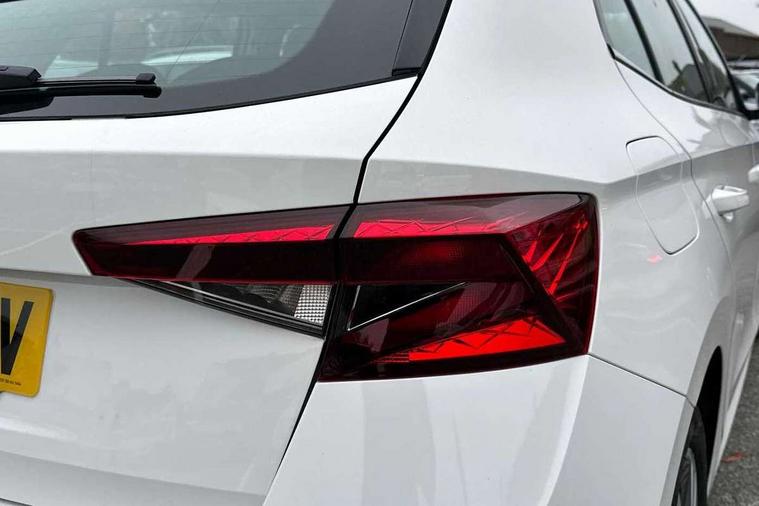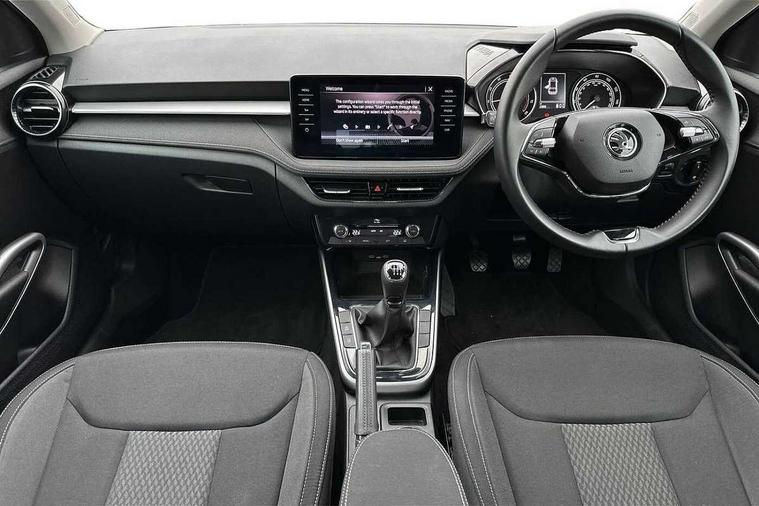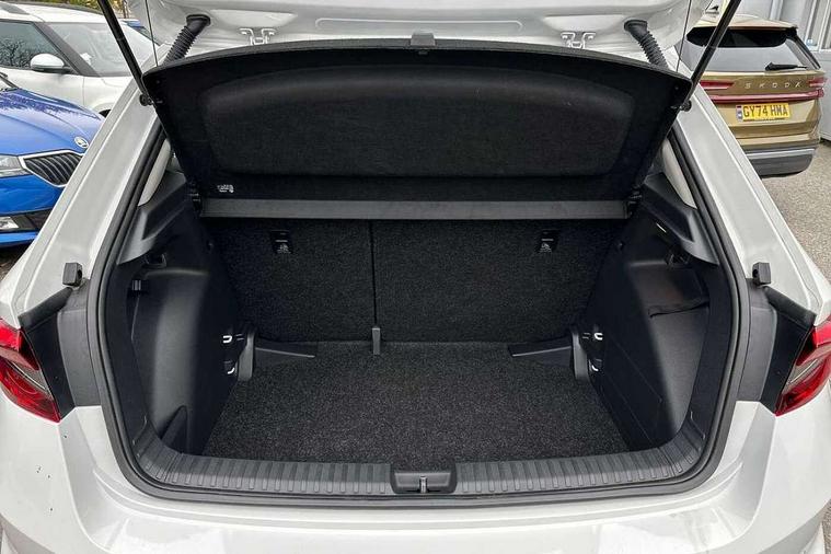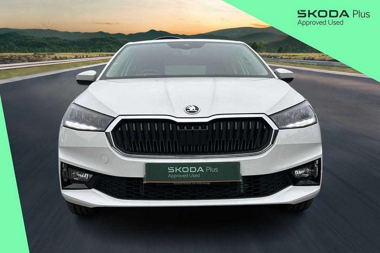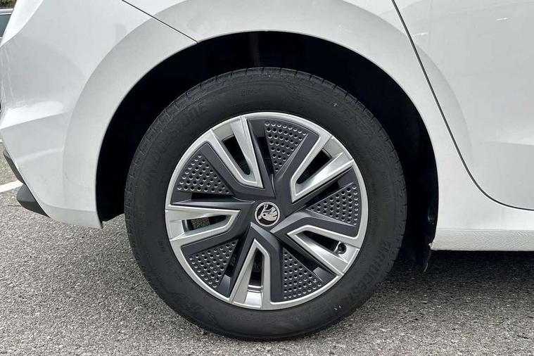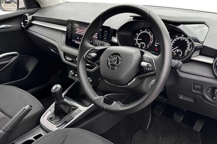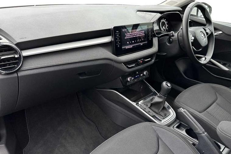 Bluetooth connection, Driver alert system - DAS, Electromechanical power steering, Exterior temperature gauge, Service interval indicator, 2x USB-C in the front (for data transmission and charging), 6 Speakers (4 in front and 2 in rear), Auxiliary socket for external MP3 player, DAB digital radio reception, Web radio, Auto dimming rear view mirror, Basic rear light, Body colour door mirrors, Body coloured bumpers, Chrome window surround, Door mirror integrated indicators, Electrically adjustable and heated door mirrors, Front and rear electric windows, Front window wiper intermittent control, Headlight range control - Automatic, Ice scraper in fuel cap, LED daytime running lights with coming and leaving home feature, Rear LED fog light, Rear side wing doors, Rear window wiper with washing nozzles, Roof mounted spoiler, SKODA tailgate lettering in chrome, Third brake light, 3 rear headrests, Backrest split and folding, Central console with fixed cup holder and storage box, Chrome handbrake release button, Comfort seats, Fabric upholstery, Front centre armrest, Gearshift knob/handle in leather, Hand brake lever handle in leather, Height adjustable front headrests, Height adjustable front seats, Height adjustable steering wheel, ISOFIX and TopTether anchorage points to the outer rear seats, ISOFIX and TopTether on the front passenger seat, Luggage compartment lighting, Manually adjustable lumbar support in front seats, Pollen filter, Rear seat bench unsplit, Removable cup holder, Single front passenger seat, Storm grey headlining, Sun visors with mirror and airbag label on passenger side, Textile floor mats, Ticket holder, Umbrella in drivers door, Ambient lighting pack 2 - Fabia Hatchback, 3-point height adjustable front seats belts with pretensioner and force limiter, Automatic warning lights in case of crash, Driver and passengers airbag with switch off function, e-Call+, ESC including ABS, MSR, ASR, EDS, HBA and XDS, Front and rear seat belt warning, FRONT ASSIST (AEB City and AEB Inter Urban), Front side airbags, Head airbags, One tone horn, Pedestrian protection, Three rear 3-points safety seat belts with pretensioner and force limiter including stop function for outer rear seat belts, Tyre pressure monitoring system, Anti-theft alarm system including immobiliser, interior monitoring, backup horn, and towing protection, Chrome edged air vents, Satin black door and side trim panel in front, Anti-theft wheel bolts protection, Super-low rolling resistance tyres,