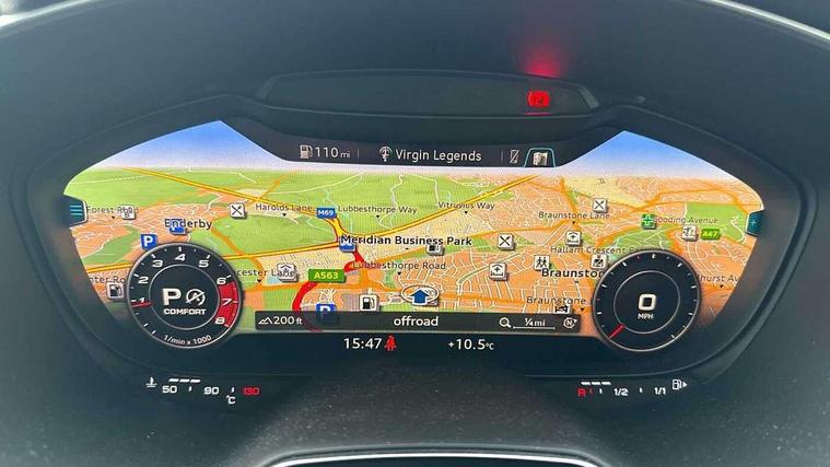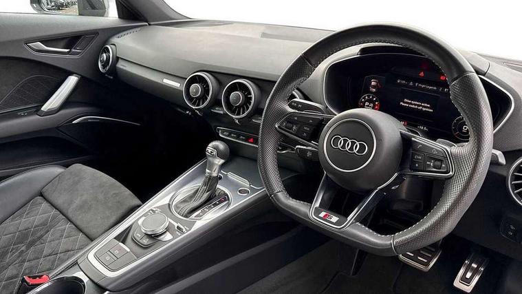 Audi drive select with 4 Pre configured modes, Audi virtual cockpit - 12.3" high-resolution LCD display with fully customisable instrument cluster, Cruise control + speed limiter, MMI touch panel, Mobile phone preparation with bluetooth interface, Progressive power assisted steering, Service interval indicator, Start/Stop system with energy recuperation, TP memo, S line sports suspension, AM/FM radio, Audi music interface, Bluetooth audio streaming, DAB Digital radio, MMI Radio with CD player and SD/XC card slot, Auto dimming rear view mirror, Auto headlight range control, Black chrome tailpipe, Black door mirrors, Dark privacy glass from B-pillar backwards, Dynamic rear indicators, Electric folding door mirrors, Electric front windows, Front fog lights, Green tinted heat insulating glass, Headlight wash system, LED daytime running lights, LED headlights with LED rear lights + dynamic rear indicators, Light and rain sensors, Sunband for windscreen, 12V socket, 3 spoke flat bottomed high multi-function leather sport steering wheel with gearshift paddles, 4 way electric lumbar support for driver and front passenger, Air conditioning, Black headlining, Extended aluminium look with stainless steel pedals, Front centre armrest, Front super sports seats, Heated front seats, Height adjustable driver's seat, Height adjustable front head restraints, Height/reach adjust steering wheel, ISOFIX child seat mounting for front passenger seat with airbag deactivation, Perforated leather gearknob, Rear head restraints, Rear top tether child seat ISOFIX attachment, Split folding rear seat, Top tether anchor plate for isofix child seat, Black styling pack - TT, Non smoking pack - TT/TT RS, 3 point front seat belts, ABS, ASR traction control, Brake energy regeneration, Curtain airbags, Driver and front passenger airbag with front passenger airbag deactivation, EDL traction control, Electromechanical parking brake, ESP, First aid kit, Front side airbags, Head airbags, Hill hold assist, Seatbelt warning, Tyre pressure warning, Warning triangle, Anti theft alarm, Anti theft wheel bolts, Immobiliser, Keyless Go, Remote central locking, Matt brushed aluminium inlays, Tool kit, Tyre repair kit,