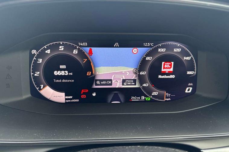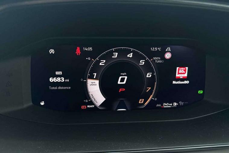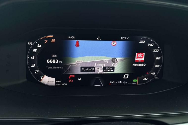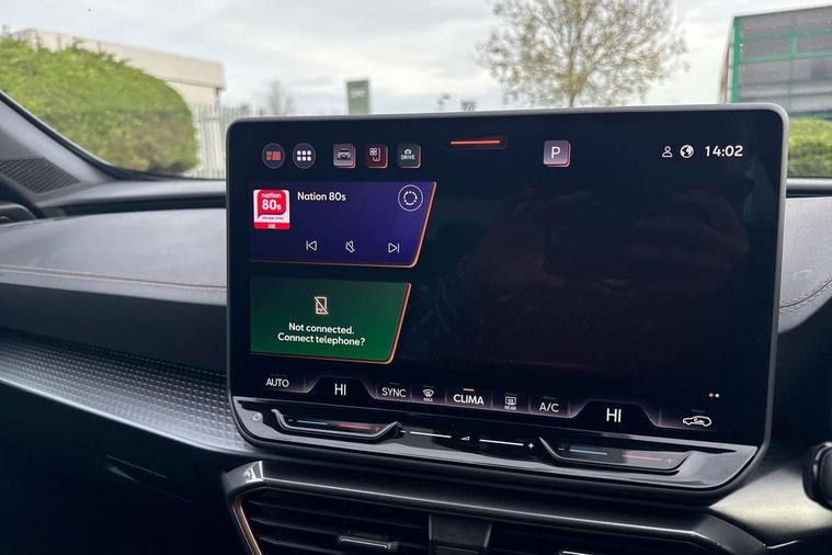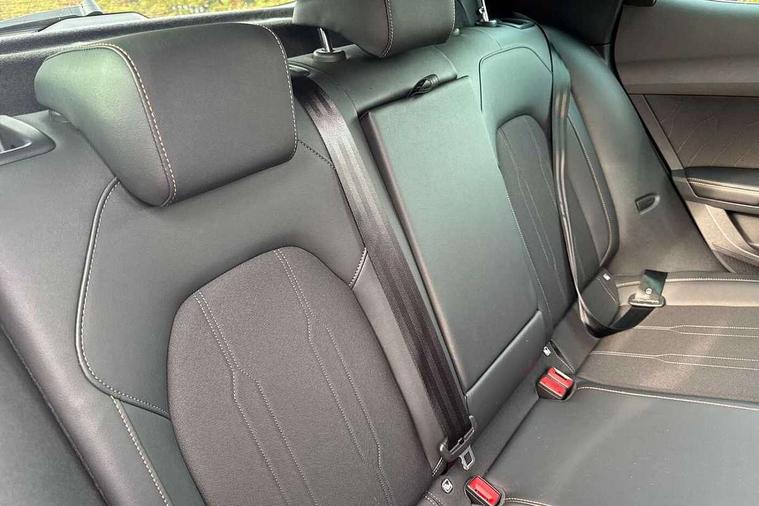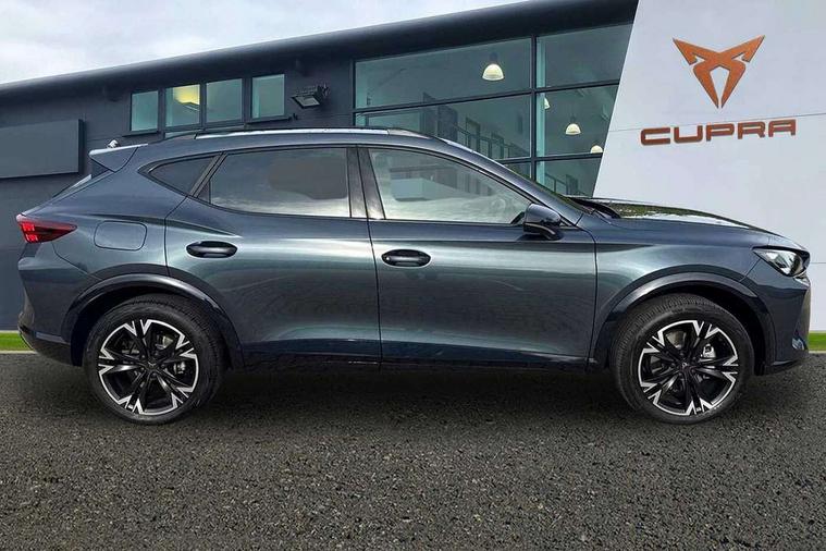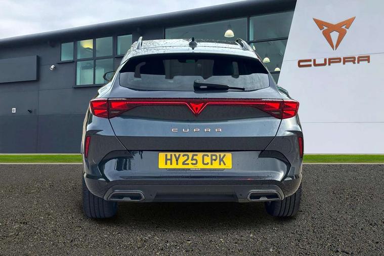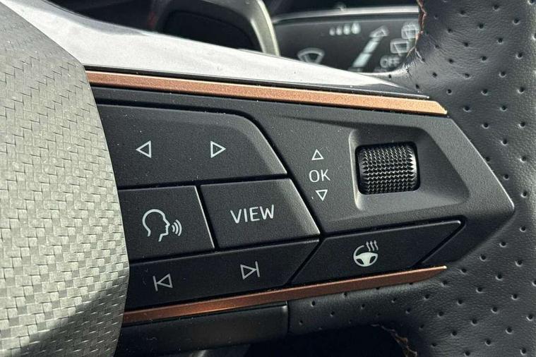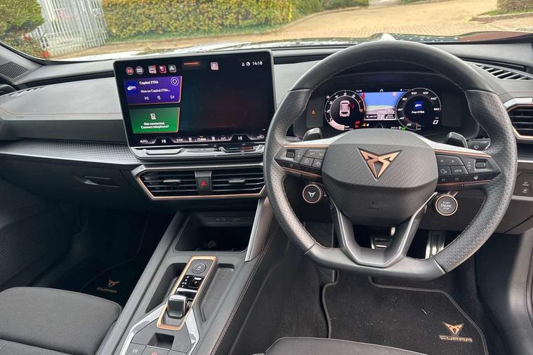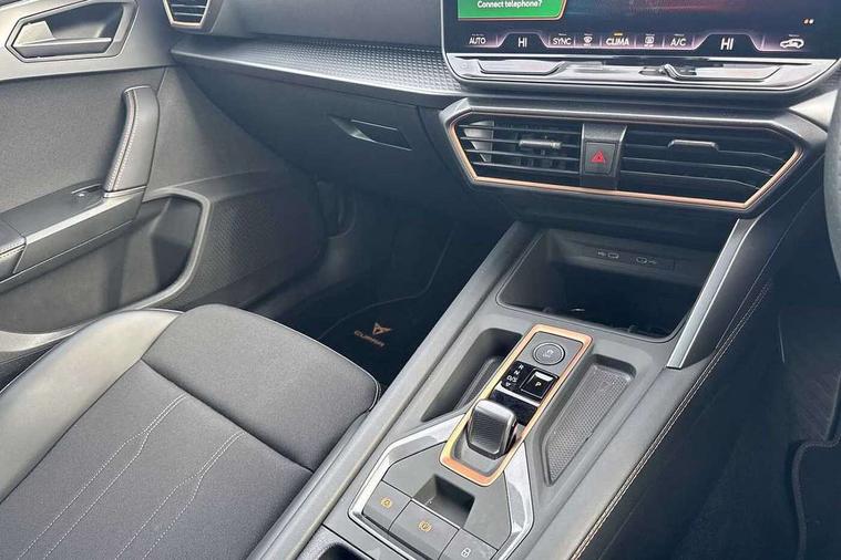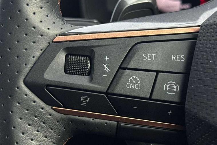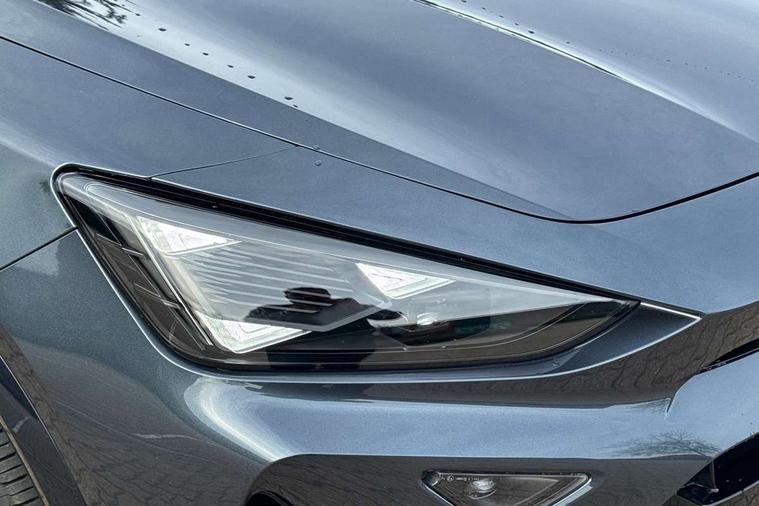 10.25" digital cockpit and configurable dashboard, Adaptive cruise control with follow-to-stop and speed limiter, Advanced driver alert system, Driving profile selection, Dynamic road sign display, Emergency steering support with turn assist, Forward collision warning with automatic braking, Front and rear parking sensors, Full link phone integration, Lane assist, Progressive steering, RPM, trip computer, outside temp gauge, instrument light brightness, low fuel warning light, lights on reminder, gearshift indicator, Service interval indicator, Start/stop system with regenerative braking, Voice control system, Wired Android Auto, Wireless apple carplay, Wireless phone charger, CUPRA sport suspension, Electronic locking differential and dynamic traction support, 2 front and 2 rear USB type C sockets, 7 speakers, Media system with navigation, 12.9" touchscreen display, voice control, DAB, steering wheel mounted controls, Auto dimming rear view mirror, Body colour door handles, Body coloured bumpers, Dark grey wing mirror, Daytime running light with automatic headlight control and coming home feature, Door panel ambient lighting, Dynamic headlight range control, Electric front/rear windows, Electrically adjustable, heated and folding door mirrors, Gloss black roof rails and window surrounds, High beam assist, LED 3rd brake light, LED front fog lamps with cornering function, LED Headlights, LED Taillights with dynamic indicator, Rain sensing wipers, Rear diffuser with black simulated exhaust pipes, Rear fog lights, Rear side wing doors, Rear wash/wipe, Tinted rear windows, Welcome lights (within exterior mirror housing), 12V socket, 2 front and 2 rear reading lights, 3 seat bench in 2nd row, 60/40 split rear bench seat with armrest and mechanical seat release, Black headlining, Black interior roof lining, Cupra sports pedals, Dust/pollen filter, Front and rear head restraints, Front centre armrest, Heated supersports multifunction leather steering wheel with satellite buttons and gear shift paddles, Height/reach adjust steering wheel, Illuminated aluminium doorsteps, Illuminated interior front door sills, Illuminated sunvisor with mirror, Interior ambient lighting, Isofix, Manually adjustable height and lumbar support for front seats, PVC/Cloth upholstery with copper stitching + Sport seats, Satellite steering wheel, Single front passenger seat, Storage pockets on rear of front seats, Three zone climate control with control panel in rear, Variable luggage/load compartment floor, 3 point seatbelts on all rear seats, ABS, Brake control system - ESC and brake booster, Child proof door locks, Driver and front passenger airbags with front passenger airbag de-activation, Electronic parking brake, Front and rear disc brakes, Front side curtain airbags, Hill hold control, Public e-call, Seat belt reminder for front and rear seats, Tyre pressure monitoring system, Anti theft alarm system, Central locking system Keyless Go, Locking wheel bolts, Copper and aluminium interior detailing, 18" Sonora machined silver alloy wheels,