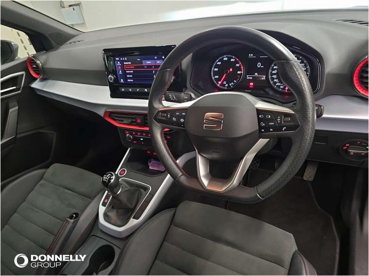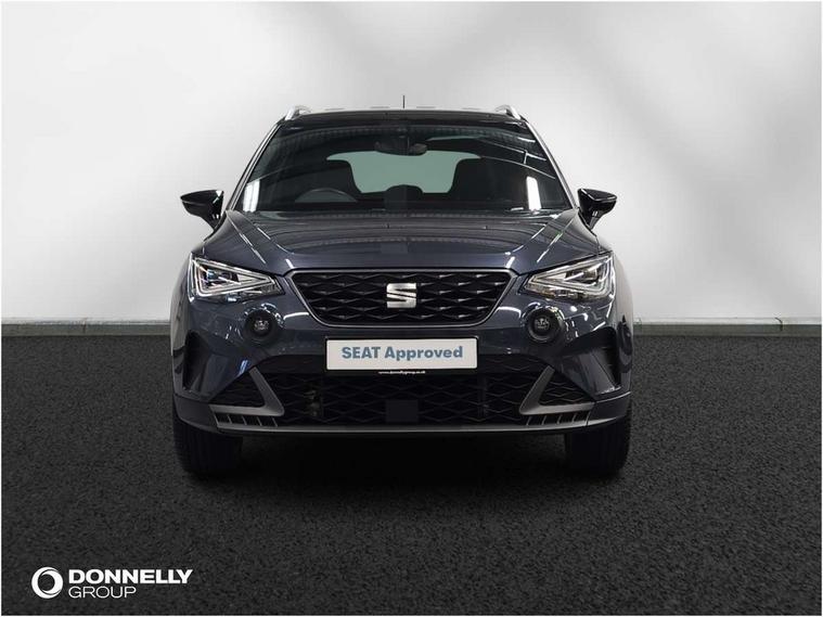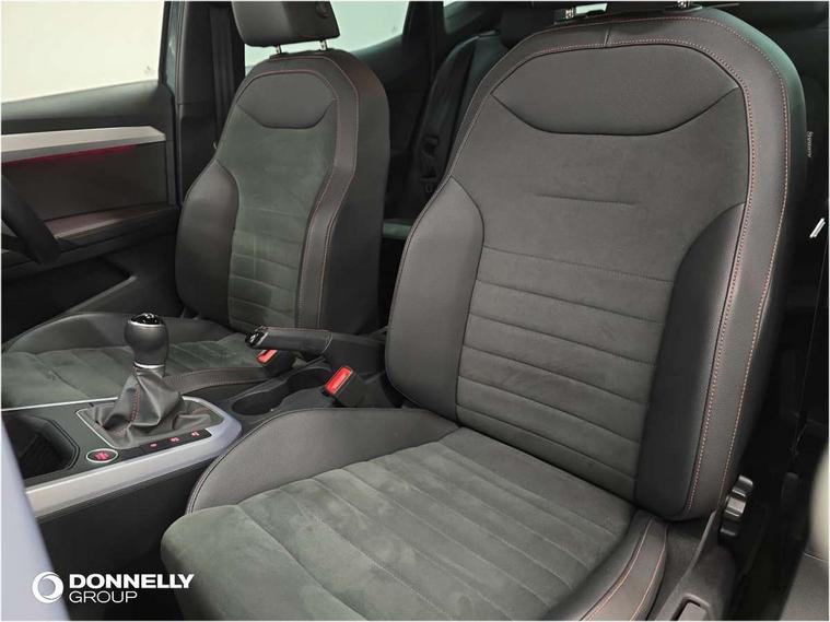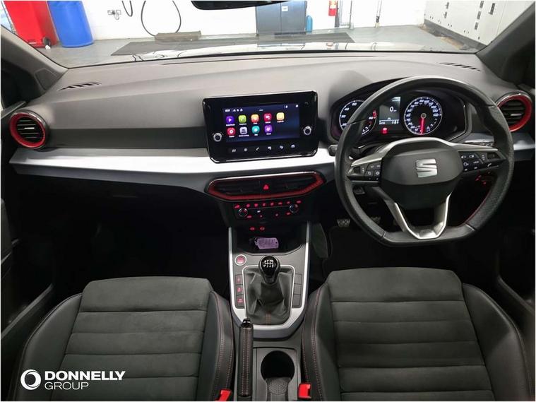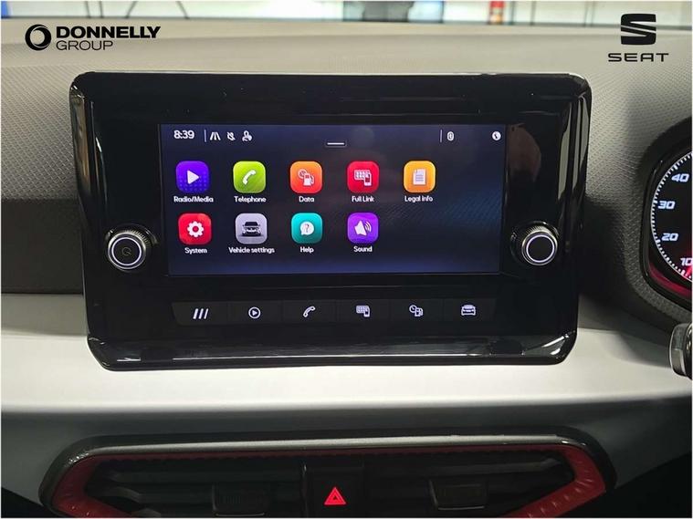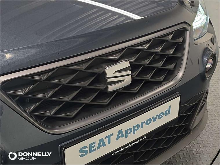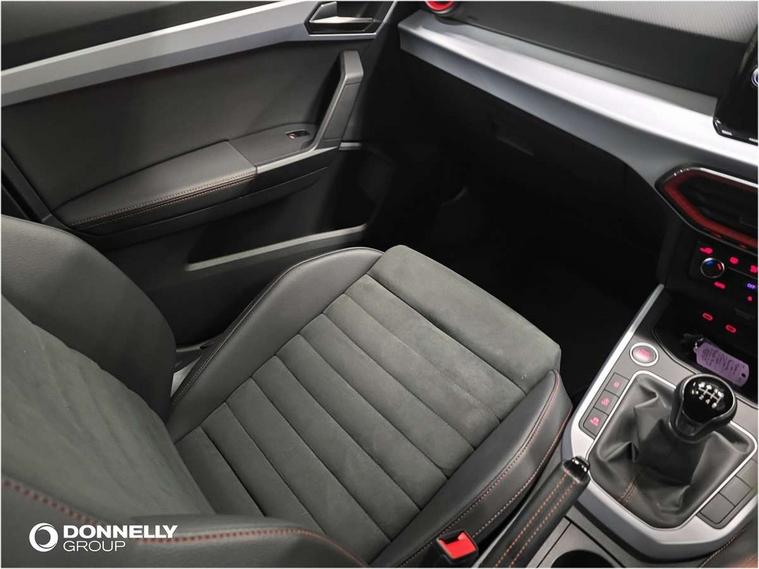'Lights On' Reminder warning buzzer, Analogue cockpit with physical dials, Digital clock, E-call, Electric speed sensitive power steering, Full Link Smartphone Integration with Mirror Link, Apple Car Play, Google Android Auto with USB Type C cable for Apple and Android compatibility, Lane keeping system, Low fuel warning light, Outside temperature display, Rear parking sensor, RPM counter, Seat connect with safety, service and remote, SEAT Drive profile - Four different models normal-sport-eco-individual, steering response, throttle response, Trip computer, Wireless phone charger, Bluetooth interface for hands free and audio streaming, DAB digital radio and AM/FM radio, Media system with 8.25" colour touchscreen with USB port (type c), Steering wheel mounted audio controls, Anti theft roof antenna, Automatic activation of hazard warning lights, Body coloured bumpers, Body coloured door handle inserts, Chrome roof rails and window surrounds, Dark tinted rear windows, Dimming rear view mirror, Electric front/rear windows, Electrically adjustable and heated door mirrors, Front fog lights with cornering function and rear fog light, FULL LED automatic headlights with dynamic headlight range control, coming and leaving home, LED daytime running lights, LED rear tail lights and licence plate lights, Protective side mouldings, Rear side wing doors, Rear spoiler, Rear window wash/wipe, Roof colour door mirrors, Third brake light, Twin exhaust pipe styling hidden exhaust pipe, Visible VIN plate, Windshield wiper with intermittent control and potentiometer, 2 cupholders, 3 seat bench in 2nd row, 60/40 split folding rear seat, Aircare filter, Black interior roof, Double boot floor, Driver sunvisor with covered mirror + card holder, Dual zone climate control, Front comfort seats, Front courtesy light with 2x front and 2x rear reading lights, Gear shift indicator, Height adjustable front seats, Height/reach adjustable steering column, Illuminated boot, Instrument lighting with brightness control, Interior ambient lighting, Interior light in footwell, central console and door panel, ISOFIX points in outer rear seats with top tether anchorage points, Microsuede cloth upholstery, Passenger sunvisor with vanity mirror, Perforated flat bottomed leather steering wheel/gear knob/handbrake with red stitching and FR logo, Single front passenger seat, Two front and three rear height adjustable headrests, Interior chrome pack - Arona, 3 point seatbelts on all rear seats, ABS, Active front headrests, Child locks on rear doors, Driver and front passenger airbags with front passenger airbag de activation, front side and curtain airbags, Electronic stability control, Emergency Brake Assist (EBA) and front assist, Front and rear seatbelt reminder, Hill hold control, Multi-Collision braking, Tiredness recognition system, Traction control, Tyre pressure monitoring system, Alarm with back-up horn, Electronic engine immobiliser, KESSY Keyless entry and go, Locking wheel bolts, Remote central locking + deadlocks, Tow away protection, Titan black dashboard,