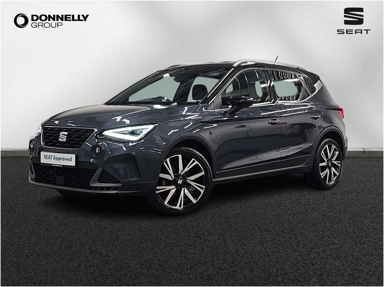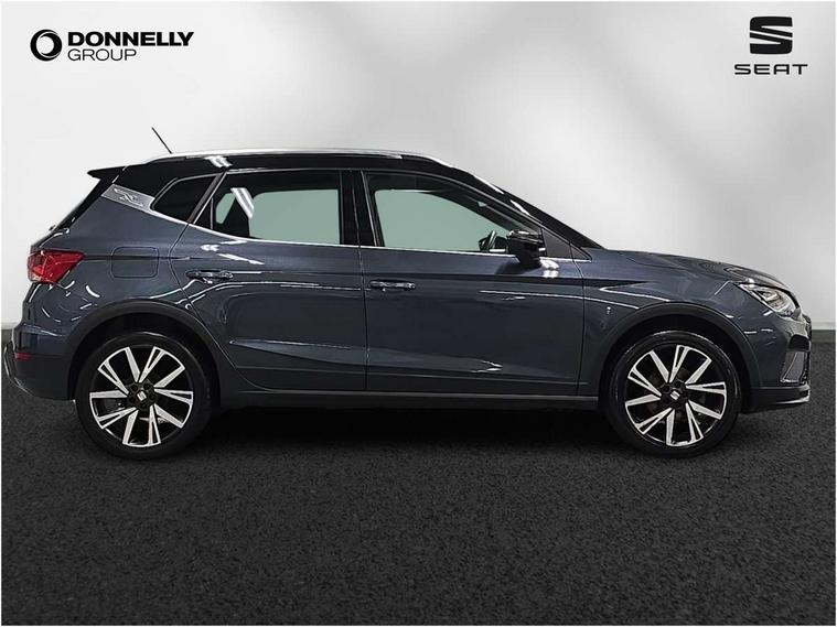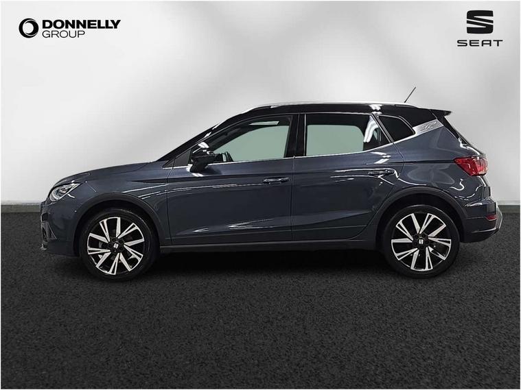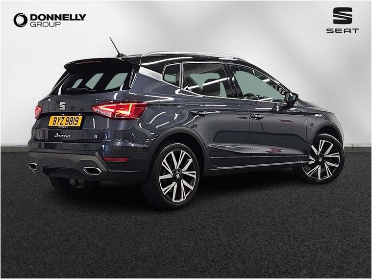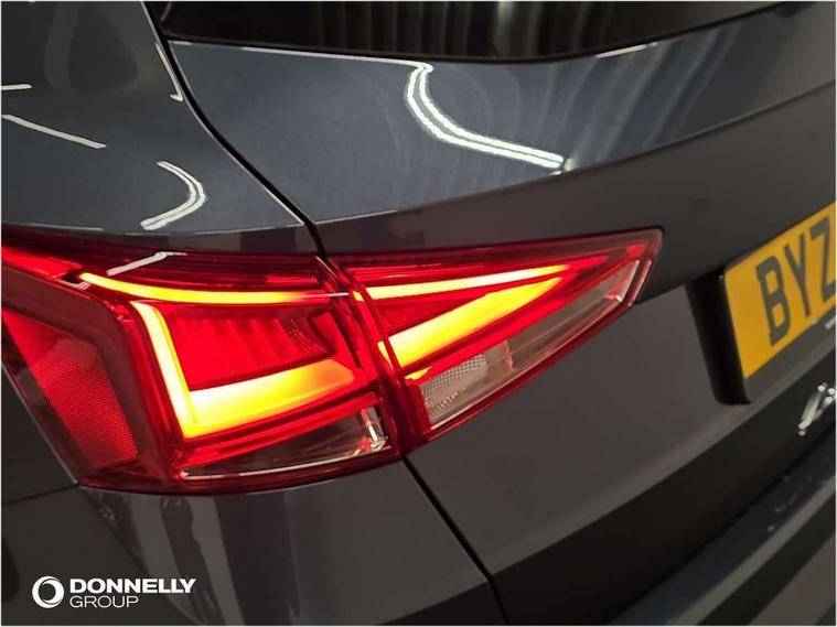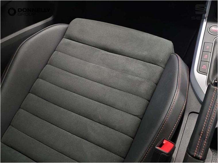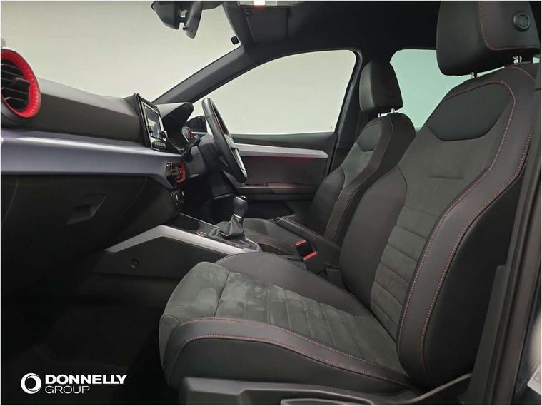 'Lights On' Reminder warning buzzer, Analogue cockpit with physical dials, Digital clock, E-call, Electric speed sensitive power steering, Full Link Smartphone Integration with Mirror Link, Apple Car Play, Google Android Auto with USB Type C cable for Apple and Android compatibility, Lane keeping system, Low fuel warning light, Outside temperature display, Rear parking sensor, RPM counter, Seat connect with safety, service and remote, SEAT Drive profile - Four different models normal-sport-eco-individual, steering response, throttle response, Trip computer, Wireless phone charger, Bluetooth interface for hands free and audio streaming, DAB digital radio and AM/FM radio, Media system with 8.25" colour touchscreen with USB port (type c), Steering wheel mounted audio controls, Anti theft roof antenna, Automatic activation of hazard warning lights, Body coloured bumpers, Body coloured door handle inserts, Chrome roof rails and window surrounds, Dark tinted rear windows, Dimming rear view mirror, Electric front/rear windows, Electrically adjustable and heated door mirrors, Front fog lights with cornering function and rear fog light, FULL LED automatic headlights with dynamic headlight range control, coming and leaving home, LED daytime running lights, LED rear tail lights and licence plate lights, Protective side mouldings, Rear side wing doors, Rear spoiler, Rear window wash/wipe, Roof colour door mirrors, Third brake light, Twin exhaust pipe styling hidden exhaust pipe, Visible VIN plate, Windshield wiper with intermittent control and potentiometer, 2 cupholders, 3 seat bench in 2nd row, 60/40 split folding rear seat, Aircare filter, Black interior roof, Double boot floor, Driver sunvisor with covered mirror + card holder, Dual zone climate control, Front comfort seats, Front courtesy light with 2x front and 2x rear reading lights, Gear shift indicator, Height adjustable front seats, Height/reach adjustable steering column, Illuminated boot, Instrument lighting with brightness control, Interior ambient lighting, Interior light in footwell, central console and door panel, ISOFIX points in outer rear seats with top tether anchorage points, Microsuede cloth upholstery, Passenger sunvisor with vanity mirror, Perforated flat bottomed leather steering wheel/gear knob/handbrake with red stitching and FR logo, Single front passenger seat, Two front and three rear height adjustable headrests, Interior chrome pack - Arona, 3 point seatbelts on all rear seats, ABS, Active front headrests, Child locks on rear doors, Driver and front passenger airbags with front passenger airbag de activation, front side and curtain airbags, Electronic stability control, Emergency Brake Assist (EBA) and front assist, Front and rear seatbelt reminder, Hill hold control, Multi-Collision braking, Tiredness recognition system, Traction control, Tyre pressure monitoring system, Alarm with back-up horn, Electronic engine immobiliser, KESSY Keyless entry and go, Locking wheel bolts, Remote central locking + deadlocks, Tow away protection, Titan black dashboard,