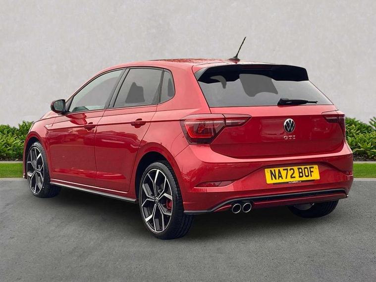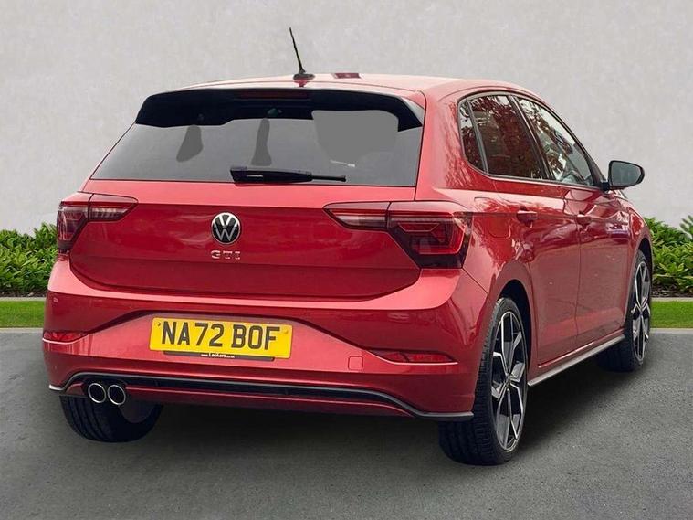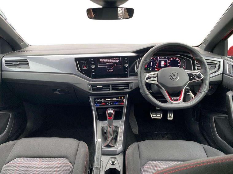 Adaptive cruise control with follow-to-stop and speed limiter, Bluetooth mobile phone interface, Digital Cockpit Pro with 10.25" Display, Driver alert system, Dynamic road sign display, Eco mode, Emergency call service, Power assisted speed sensitive steering, Preparation for We connect and We connect plus, Speedo and rev counter, electronic odometer, trip, service interval display and fuel gauge, Travel Assist - Lane keeping system and traffic jam assist, Travel assist including emergency assist, Trip computer, Warning signal and warning light for front and rear seatbelts not fastened, Washer fluid level indicator, Wireless app connect, Adaptive chassis control, Front wheel drive, Heavy duty rear axle, Rear shock absorpion sports version, Sports select suspension lowered by 15mm, Start-stop system with battery regeneration (recuperation - energy recovery during braking), DAB Digital radio, Diversity antenna for FM reception, Front and rear 6 speakers, Body colour bumpers, Body colour door handles, Electric front windows, Front scuff plates in aluminium with GTI logo, Heat insulating darkened glass in side and rear windows, Heat insulating glass windscreen, Power folding adjustable/heated exterior mirrors and front passenger exterior mirror lowering function, Rear electric windows, Rear fog light, Rear side wing doors, Rear windscreen washer and wiper with interval delay, Sport bumpers with air intakes with honeycomb structure, Third brake light, Twin chrome exhaust tailpipes, 12V power socket in centre console, 2 USB-C ports in the front, 2 USB-C charging sockets on the center console in the rear, 3 rear head restraints, 60/40 split folding rear seat and rear seat bench not split, Air care climatronic air conditoning system with active combination filter and 2-zone temperature control, Black roof lining, Ceramique headliner, Chrome plated radiator grille inserts, air vent surrounds and light switch surrounds, Door and side trim panel, Driver and front passenger seat height adjustment, Driver/passenger sunvisors with illuminated vanity mirrors, Front + rear carpet mats, Front centre armrest, Front footwell illumination, Front seat backrest storage pockets, GTI sports gearshift knob in aluminium leather, Handbrake lever handle in leather, Isofix child seat preparation easy-fit (for two outer rear seats, and front passenger seat) compatible with I-size, LED interior light with switch off delay and dimmer, 2 reading lights front and rear, Luggage compartment cover, Luggage compartment floor, Luggage compartment lighting, Single front passenger seat, Stainless steel pedals, Standard pedal cluster, Three spoke leather wrapped multifunction sports steering wheel with shifting paddles, IQ LED matrix headlights pack - Polo, Light and sight pack - Polo GTI, Sports suspension pack - Polo, 3 point height adj front seatbelts + pretensioners, 3x3 point rear seatbelts, ABS, Driver and front passenger airbag with front passenger airbag deactivation, Drivers and front passengers safety optimised head restraints, ESC (Electronic stability control) + EDL (Electronic Differntial lock) and ASR (Traction control), Extended and predictive pedestrian/ cyclist protection, Front and rear disc brakes with red brake calipers, Front curtain and side airbags with center airbag, Hill hold control, Manual child lock in rear doors, Two tone horn, Tyre pressure loss indicator, Alarm with interior protection, Anti-theft alarm system with interior monitoring, backup horn, and towing protection, Anti-theft wheel bolts, Electronic engine immobiliser, Chrome applications on rotary light, mirror adjustment, window regulator switches, outlet with frame in black, Low rolling resistance tyres,