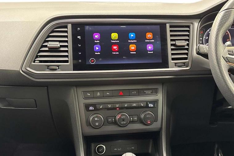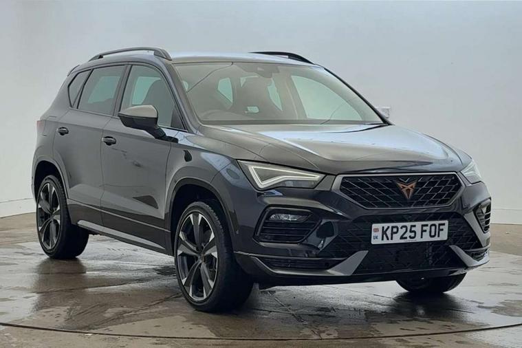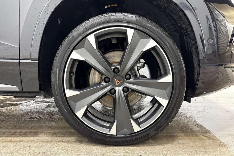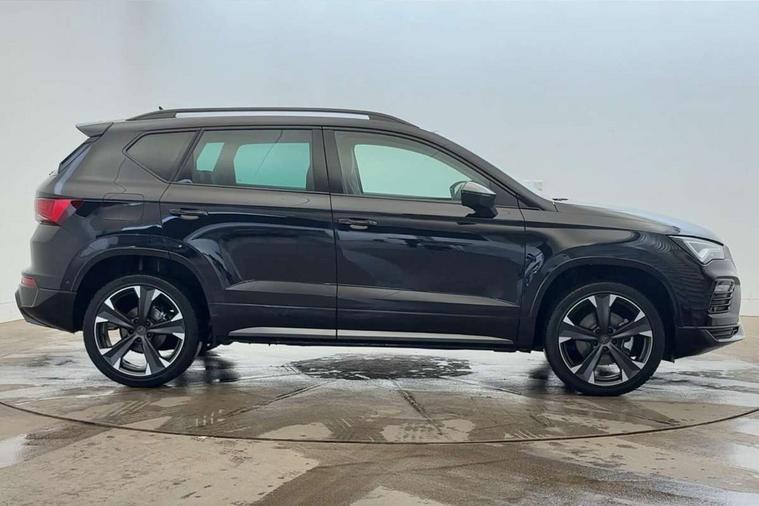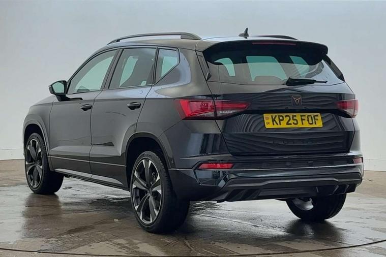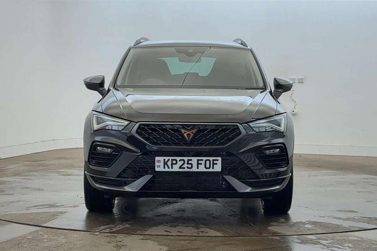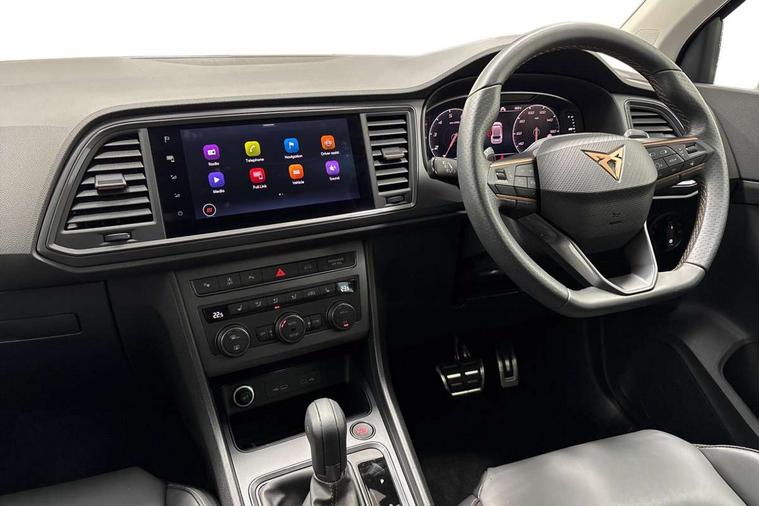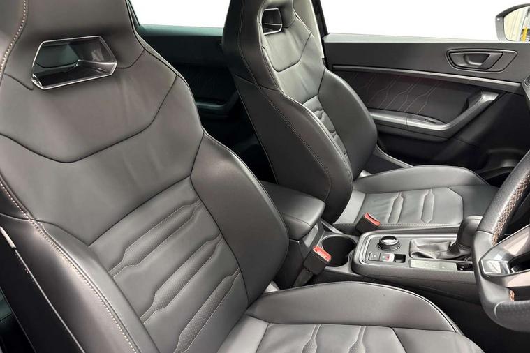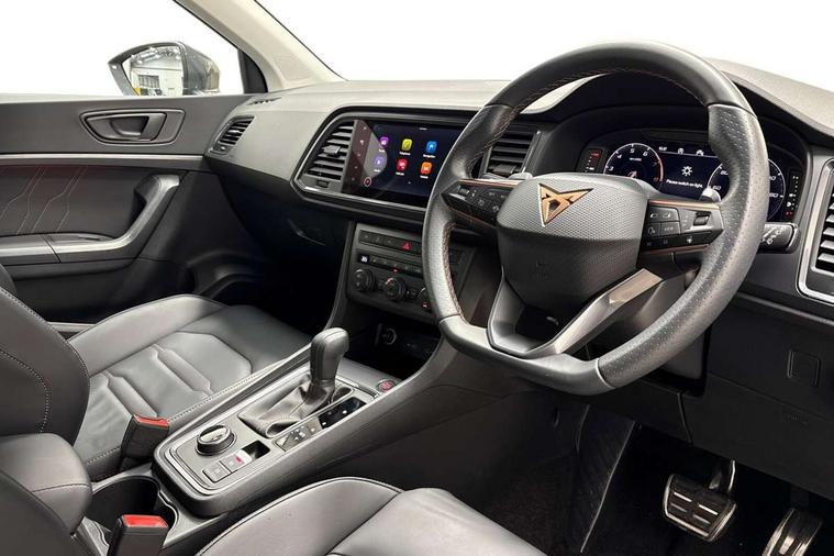Cruise control system with speed limiter, Digital cockpit, Driving profile selection and conventional shock absorber, E-call, Electric tailgate with virtual pedal, Outside temperature gauge, Progressive power assisted steering, Rear view camera, Self parking functionality (includes front and rear parking sensors), Trip computer, wired and wireless full link smartphone integration, Wireless phone charger, Front and rear shock absorption, chassis with increased ride height, Steering wheel mounted audio/phone controls, Body colour bumpers with dark aluminium diffusor, Body coloured wheel arch surrounds, Dark tinted rear windows, Daytime running lights, Door mirrors with welcome CUPRA light silhouette, Dynamic headlight range control with self adjusting whilst driving, Electric adjustable/heated/folding door mirrors, Front and rear electric windows, Front grille frame in chrome, Full LED headlamps with lens and LED front fog lamps with cornering function, Gloss black door mirrors, Gloss black roof rails, Gloss black side mouldings, Gloss black side window trim, Illuminated aluminium front door sill, LED rear tail lights with dynamic indicators, Rear fog lights, Rear side wing doors, Rear spoiler, Rear wash/wipe, Specific CUPRA design front bumper, Standard rear exhaust tailpipes, Third brake light, 12v socket in front, 3 seat bench in 2nd row, 60/40 split folding rear seat, Aluminium pedals, Cupra steering wheel emblem, Dual zone climate control, Electric driver seat with memory function, Front and rear head restraints, Front centre armrest, Front seat back storage pockets, Grey roof lining, Heated front seats, Heated steering wheel, Height adjustable driver and passenger seat with lumbar adjustment, ISOFIX points in outer rear seats with top tether anchorage points, Leather sport bucket seats, Leather steering wheel and gear knob, Multicoloured ambient lighting with LED interior illumination, Pedal cluster, Rear armrest and easy back seat release mechanism from boot, Single front passenger seat, Sports steering wheel, Steering wheel mounted gearshift paddles, Storage compartment in roof console for sunglass, Storage compartment under driver's seat, Convenience pack - Ateca, Interior lighting pack - Ateca, Navigation system plus pack with DAB - Ateca, Safety and driving pack - Ateca, 3x3 point rear seatbelts, ABS, Traction control system (TCS), Electronic stability control (ESC) and Electronic differential lock system (XDS), Airbags - Driver and front passenger airbag with deactivation, front side, two curtain and driver's knee airbags, Black brake callipers with CUPRA logo, Electric parking brake with auto hold function, Front and rear seatbelt reminder, Front assist with autonomous emergency braking, Hill hold control, Manual rear child locks, Single tone horn, Tiredness recognition system, Tyre pressure monitoring system, Alarm, Keyless entry, Locking wheel bolts, 19" Sport machined alloy wheels 36/3 in black/silver,