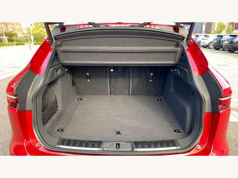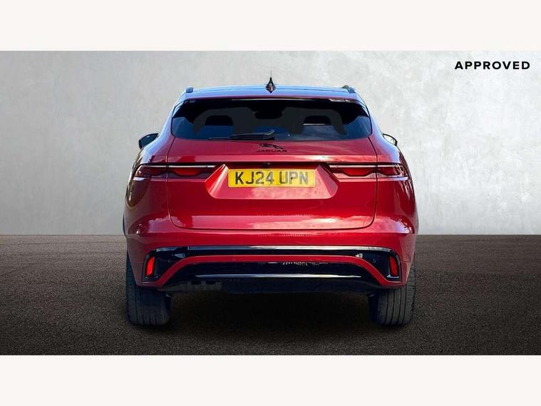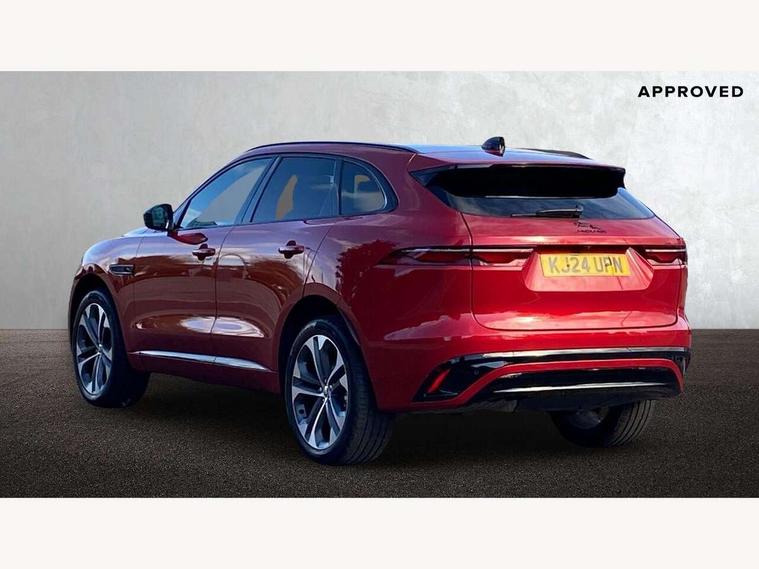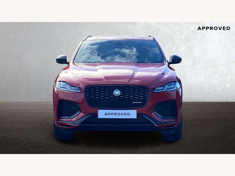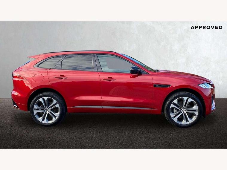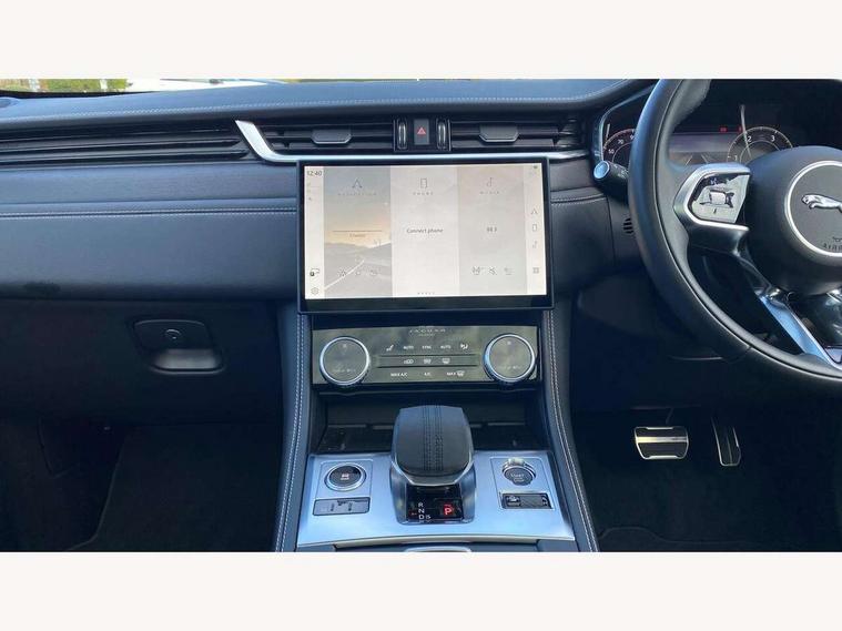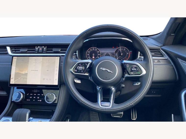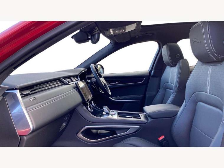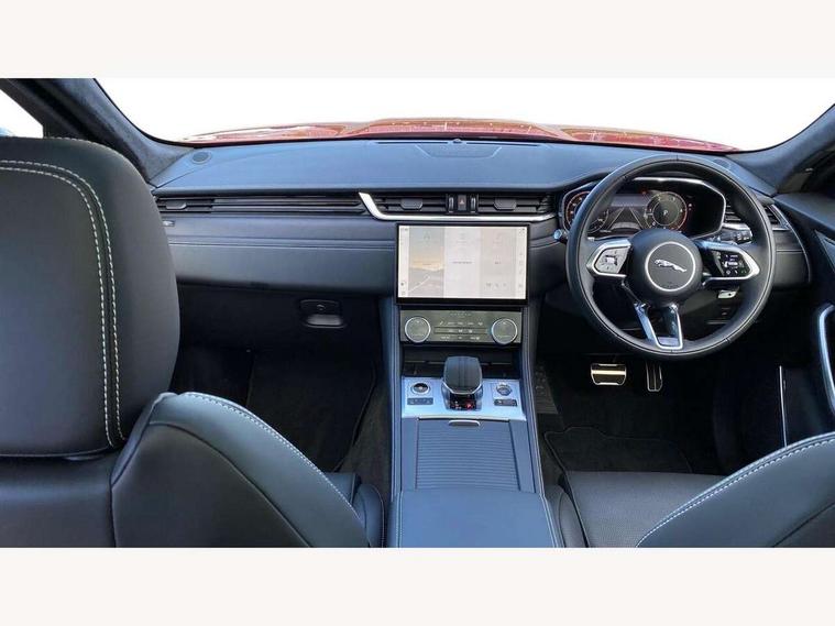 11.4" touchscreen, Adaptive cruise control with steering assist, Android Auto, Apple car play, Blind spot assist, Bluetooth connectivity, Clear exit monitor, Driver alert system, Driver condition monitor, eCall emergency call system, Eco driving style assistant, Electric power assisted steering, InControl remote, Interactive driver display digital with 12" TFT display, Jaguar Toggle shift selector, Lane departure warning system, Lane keep assist, Outside temperature gauge, Personalisation profile management, Pivi pro connected navigation system with app interface and media storage, Pro services and wifi hotspot, Push button starter, Rear collision monitor, Rear traffic monitor, Service interval indicator, Speed proportional steering, Start up sequence with movement in dials and lighting, Traffic sign recognition with adaptive speed limiter, Trip computer, Voice control system, Wireless device charging, 8 speed automatic transmission, Adaptive dynamics, All terrain progress control, All Wheel Drive (AWD), Configurable dynamics, Open differential with torque vectoring by braking, AM/FM radio, Bluetooth streaming, DAB Radio (Digital Audio Broadcasting), Dynamic volume control, InControl apps, InControl protect, iPod integration, 3 flash lane change indicators, AHBA and animated directional indicators, Approach Illumination, Auto dimming rear view mirror, Automatic headlights, Electric heated/power fold memory door mirrors with approach lights and auto dimming driver side, Electric windows with one touch open/close and anti trap, F-Pace and R Dynamic badge, Green tinted glass, Heated front windscreen + heated washer jets, Heated rear window with timer, Illuminated metal tread plates with Jaguar script, Jaguar script and leaper, LED High level third brake light, LED tail lights, Metal load space scuff plates, Non acoustic front windscreen, Privacy glass (rear side windows and rear screen), R Dynamic badge on side door, Rain sensor windscreen wipers, Rear fog lights, Rear metal tread plates, Rear side wing doors, Rear wiper, Trailer stability assist, Variable front intermittent wipers, 12V power point front, 3 rear headrests, 3 seat bench in 2nd row, Additional power sockets - Two additional USB sockets in rear centre console and one 12V socket in trunk, Air distribution speed, Bright metal foot pedals, Centre armrest console, Centre console with side storage, Configurable cabin lighting, Deletion loadspace storage rails, Door sill tread plates, Ebony suede cloth headlining, Electrically adjustable steering column, Fold flat front seats, Front centre armrest with storage compartment, Front door storage space, Glovebox finisher with jaguar script, Heated steering wheel, Hooks in loadspace, Illuminated glovebox, Interior front door handles with separate locking switches, ISOFIX on outer rear seats, Jaguar sense, Leather steering wheel, Luggage tie downs in loadspace, Mist sensing, Multifunction steering wheel, Overhead lighting console, Overhead stowage for sunglasses, Passive front head restraints, Premium carpet mats, Rear air vents, Rear armrest with twin cupholders, Rear centre headrest, Rear door storage space, Reversible boot floor, Satin chrome gearshift paddles, Shopping bag hook, Single front passenger seat, Sunvisors with illuminated vanity mirrors, Twin front cupholders with cover, Online Pack with data plan - F-Pace, 355mm front brakes and 325mm rear brakes, 3x3 point rear seatbelts, ABS, All surface progress control (ASPC), Brake pad warning light, DSC - Dynamic Stability Control, Electric parking brake (EPB), Emergency brake assist, Front airbags with passenger seat occupant detector, Front and rear seatbelt reminder, Front side airbags, Full length side window curtain airbag, Hill launch assist, Power operated child locks, Traction control, Tyre pressure monitoring system, Immobiliser, Keyless entry, Keyless Start, Locking wheel nuts, Perimeter alarm, Remote central locking, Valet mode,