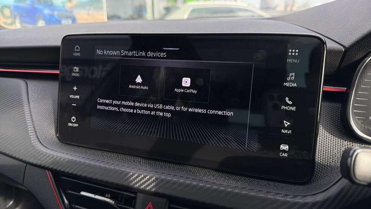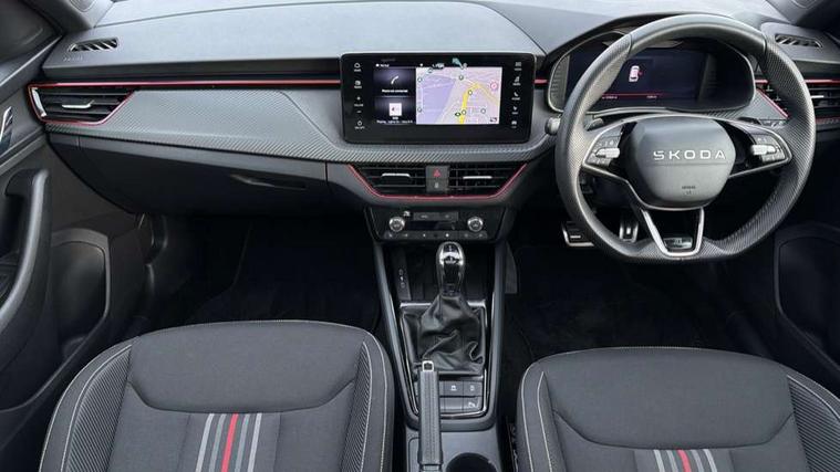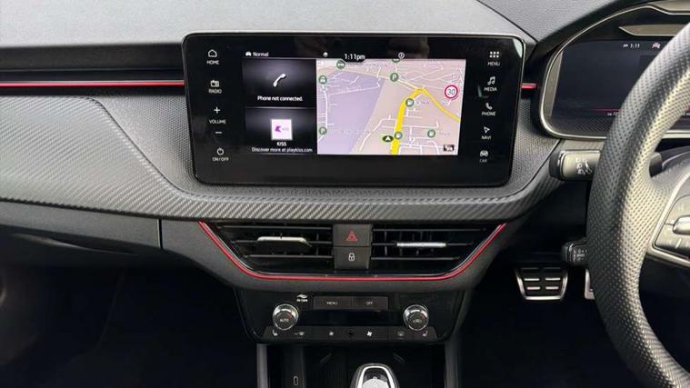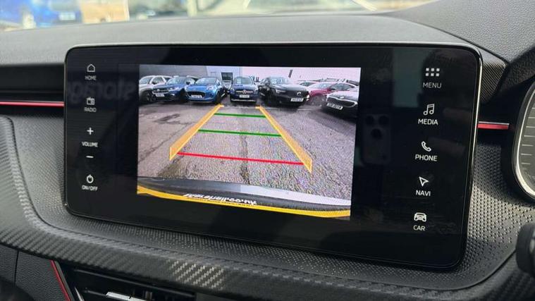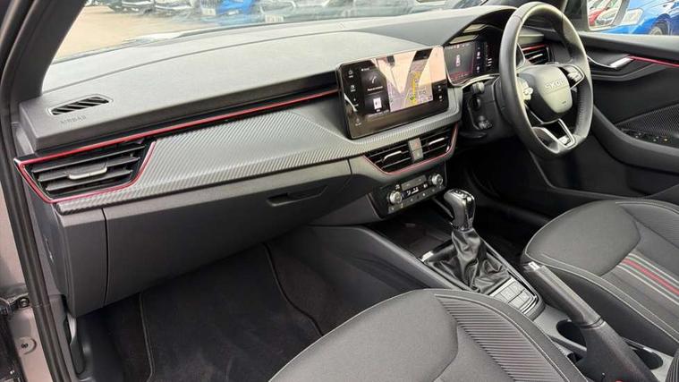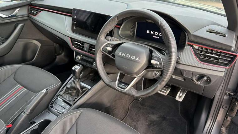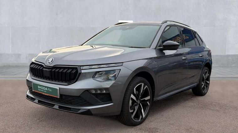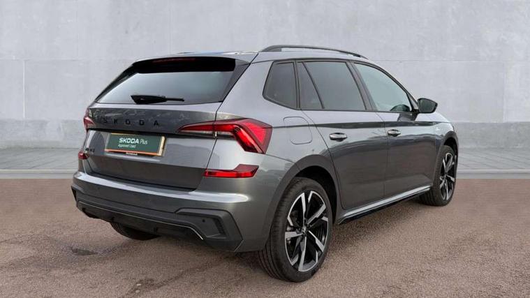Advanced driver attention and drowsiness monitor, Bluetooth system, E-call, Front assist system, PAS, Rear parking sensors, Rear view camera, Service indicator, Speed limiter, Traffic sign recognition, Virtual cockpit with 10.25" display, Voice control system, Wireless smartlink, 4 USB C ports, 8 Speakers, 9.2" Skoda navigation display, DAB Digital radio, Auto dimming rear view mirror, Automatic headlight control with coming home and leaving home feature, Black door mirrors, Black radiator grille, Black rear diffuser, Black roof spoiler, Body colour bumpers, Body colour door handles, Boot lettering in black, Extended tailgate glass, Fixed panoramic sunroof with black roof rails, Front and rear electric windows, Heated rear window, LED daytime running lights, LED high beam, LED low beam, LED third brake light, Light sensors, Monte carlo plaque, Privacy glass, Rear side wing doors, Rear wiper, Ticket holder inside windscreen, 12V socket in luggage compartment, 3 seat bench in 2nd row, Aluminium pedals, Ambient lighting in white/red, Art leather carbon decor inserts, Art leather carbon door inserts, Black roof lining, Cargo elements, Chrome inner door handles, Driver and passenger sun visors with vanity mirror, Dual zone climate control, Front and rear roof lights, Front centre armrest, Front head restraints, Glove compartment with illumination, Height adjustable driver seat, Height adjustable front passenger seat, Ice scraper, Inner circulation control with pollen filter, ISOFIX on front passenger seat, Isofix preparation for back seats, Leather gearknob and handbrake lever, Manual lumbar support for front seats, Monte Carlo cloth upholstery, Net package and top tether hooks in boot space, Net under rear shelf, Pocket on the back of both front seats include mobile phone pockets, Rake/reach adjustable steering wheel, Reading lights, Rear centre armrests, Red hotstamping, Single front passenger seat, Sports seats, Textile floor mats, Third rear headrest, Top tether for front passenger seat, Umbrella in driver's door, Light and view plus package - Kamiq, 3x3 point rear seatbelts, Airbags - driver and front passenger, Disc brakes, ESP, Extended and predictive pedestrian/cyclist protection, Front passenger airbag deactivation switch, Front side airbags with curtain airbags, Hill hold control, Manual leather parking brake, Manual rear child locks, One tone horn, Seatbelt reminder for driver an co-driver, Traction control, Tyre pressure monitor, Anti-theft alarm system with interior monitoring, backup horn, towing protection and remote central locking with SAFE system, Anti-theft wheel bolts, Electronic engine immobilizer, 18" Ursa black diamond cut alloy wheels,