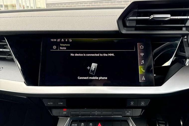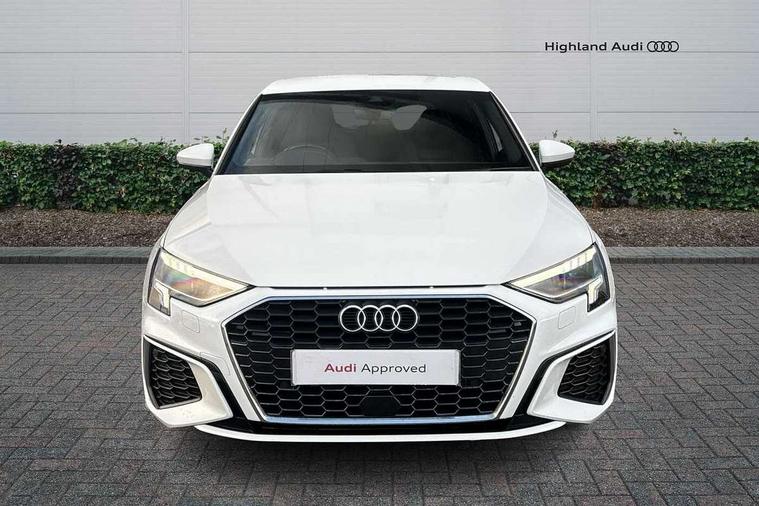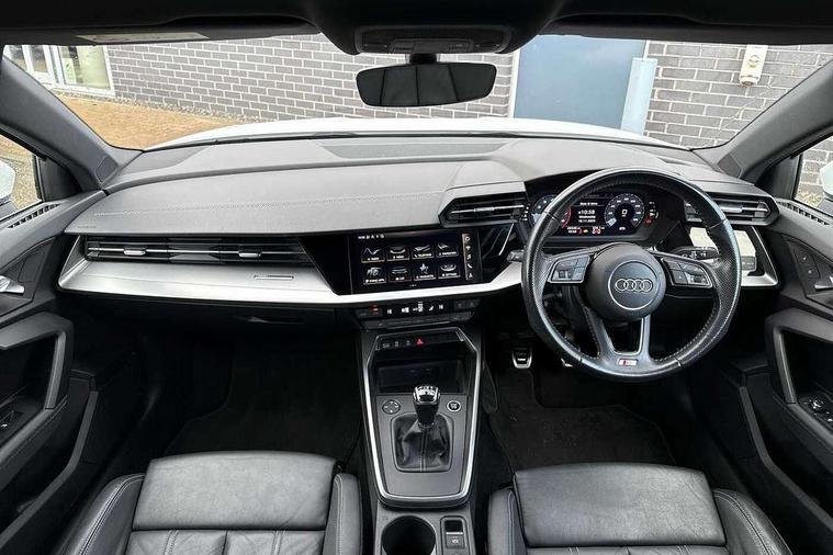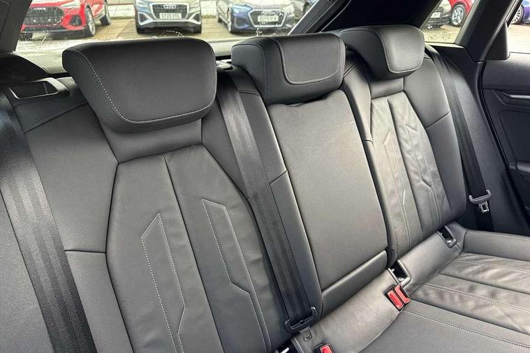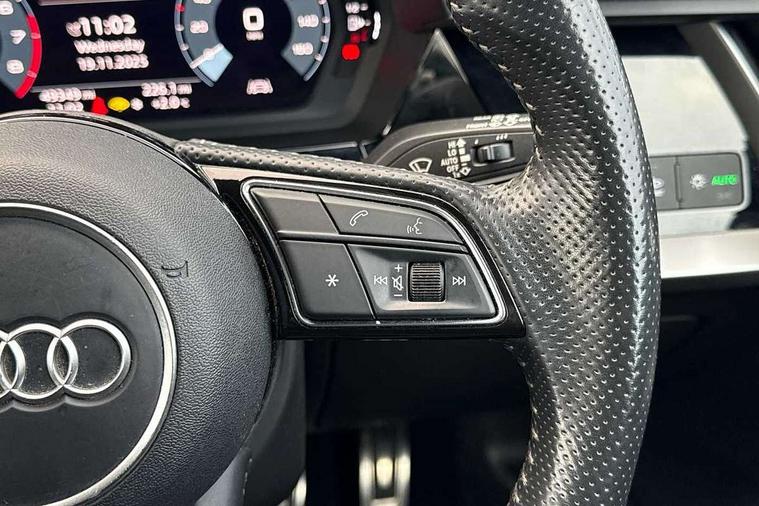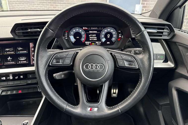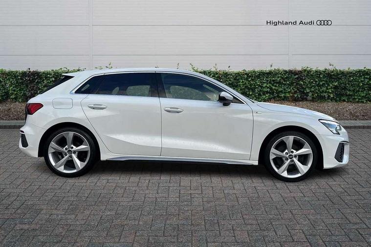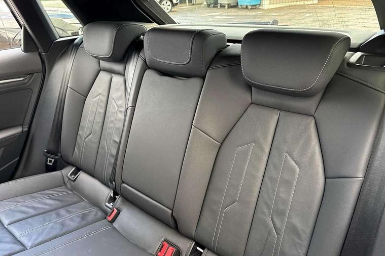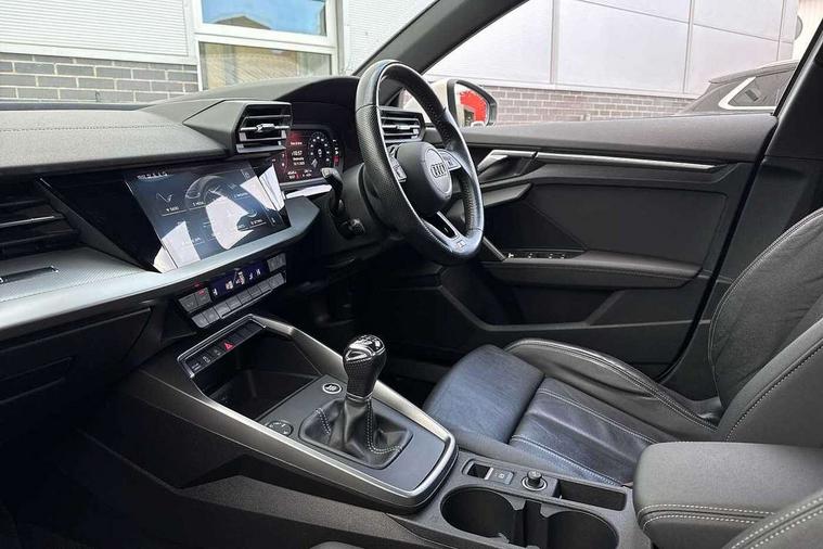 Audi connect emergency call and service, Audi drive select (Auto, Comfort, Dynamic, Efficiency and Individual), Audi smartphone interface, Audi Virtual Cockpit - 10.25" digital and colour instrument cluster, Automatic start/stop system with recuperation, Bluetooth interface, Collision avoidance assistant, Cruise control, Electromechanical power speed sensitive steering, Lane departure warning system, MMI Navigation Plus with high resolution 10.1" colour touch screen display, Rear parking sensors, Service indicator, Trip computer, Voice control system with natural language interaction, 1xUSB-A and 1xUSB-C connection, 6 passive loudspeakers, DAB Digital radio, Acoustic glass windscreen, Aluminium window trim, Auto dimming frameless rear view mirror, Body colour exterior mirrors, Electrically adjustable/heated/folding/auto dimming door mirrors with integrated LED indications + kerb view function for passenger side, Front electric windows, Illuminated aluminium inserts front door sills with S logo, LED daytime running lights, Light and rain sensors, Privacy glass - dark tinted rear window, rear door and side windows, Rear electric windows, Rear side air outlets in grained matt black, Rear wiper, S line bumpers, S roof spoiler, 12V socket and storage compartment in front centre console, 40/20/40 split folding rear seat bench with cupholder, Black cloth headlining, Dual zone electronic climate control, Front and rear centre armrest in leather, Front and rear headrests, Front/rear floor mats, Height and reach adjustable steering wheel, Interior lighting - glove compartment light and right hand side, Luggage compartment floor covering, Manual boot compartment lid, Manually adjustable front seats, Seat side bolsters, Stainless steel pedals and front footrest, Twin leather upholstery with front sports seats S embossed logo, Aluminium interior elements pack - A3 Sportback, S line styling pack - A3 Sportback, 3x3 point rear seat belts, Driver and front passenger airbag with passenger airbag deactivation, Electronic Stabilisation Control (ESC) including ABS, ASR and EDL, First aid kit with warning triangle and 2 safety vests, Hill hold assist, Pre-sense front with pedestrian and cyclist detection, Seatbelt monitoring, Tyre pressure loss indicator, Anti theft alarm, Anti-theft wheel bolts, Electronically operated child lock, Immobiliser, Remote control central locking, Accent surfaces in the dashboard and centre console in platinum grey silk effect paint finish, Dark spectrum aluminium inlays,