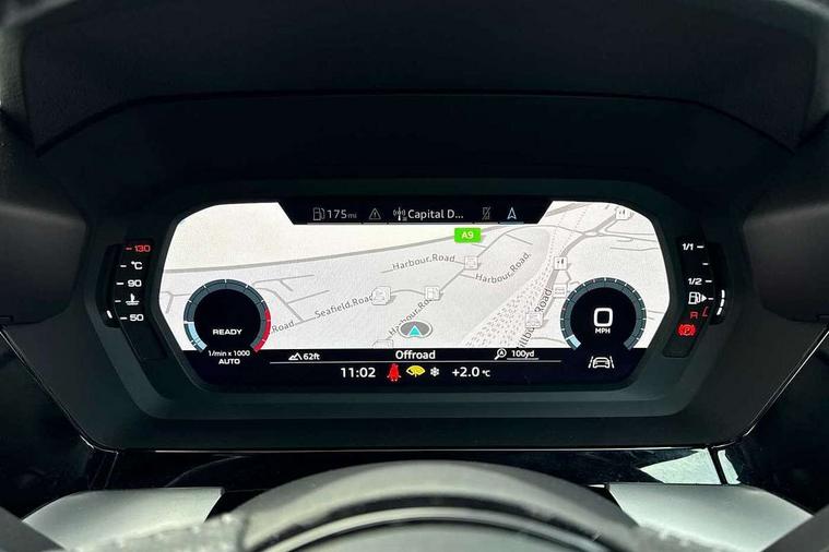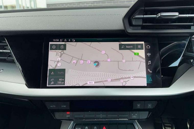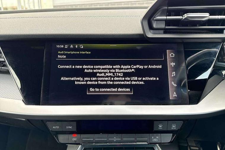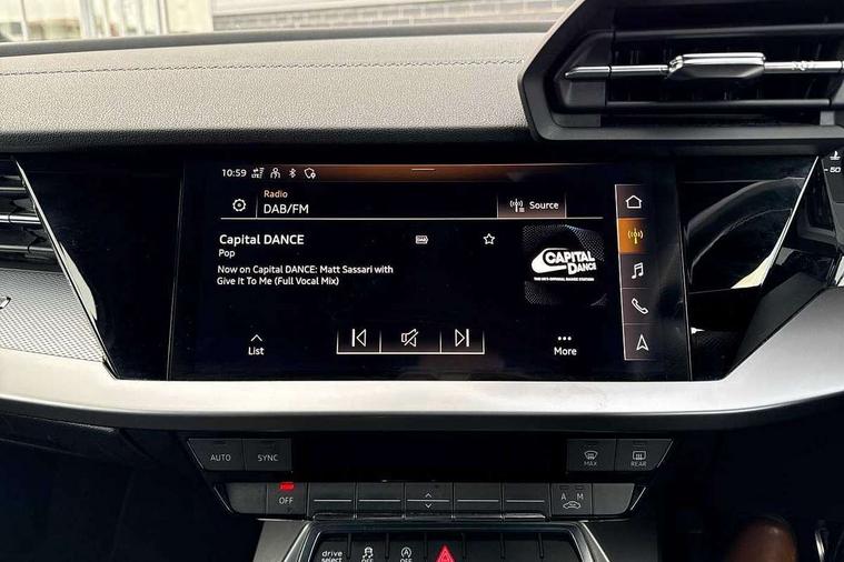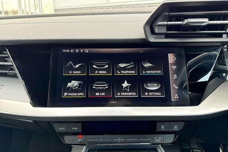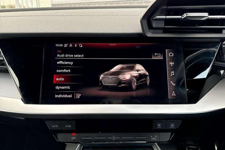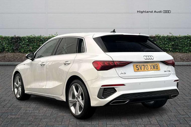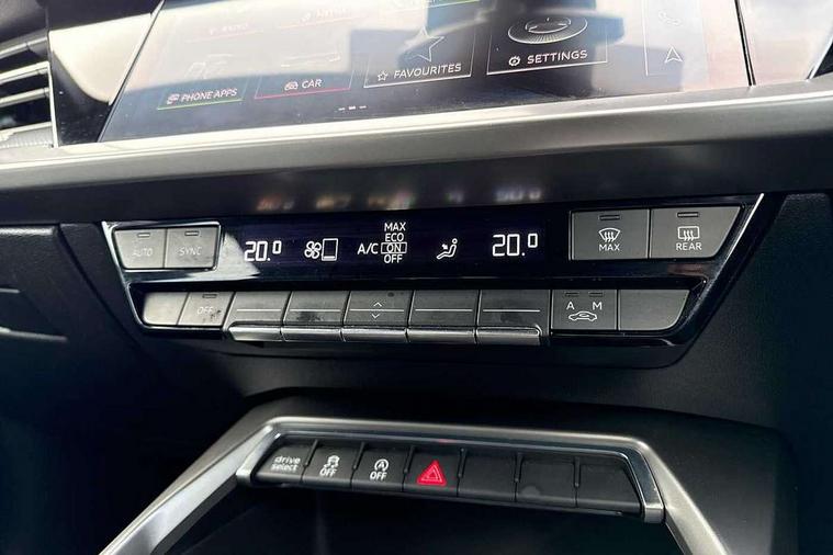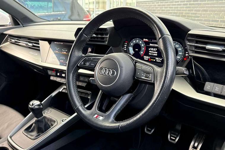 Audi connect emergency call and service, Audi drive select (Auto, Comfort, Dynamic, Efficiency and Individual), Audi smartphone interface, Audi Virtual Cockpit - 10.25" digital and colour instrument cluster, Automatic start/stop system with recuperation, Bluetooth interface, Collision avoidance assistant, Cruise control, Electromechanical power speed sensitive steering, Lane departure warning system, MMI Navigation Plus with high resolution 10.1" colour touch screen display, Rear parking sensors, Service indicator, Trip computer, Voice control system with natural language interaction, 1xUSB-A and 1xUSB-C connection, 6 passive loudspeakers, DAB Digital radio, Acoustic glass windscreen, Aluminium window trim, Auto dimming frameless rear view mirror, Body colour exterior mirrors, Electrically adjustable/heated/folding/auto dimming door mirrors with integrated LED indications + kerb view function for passenger side, Front electric windows, Illuminated aluminium inserts front door sills with S logo, LED daytime running lights, Light and rain sensors, Privacy glass - dark tinted rear window, rear door and side windows, Rear electric windows, Rear side air outlets in grained matt black, Rear wiper, S line bumpers, S roof spoiler, 12V socket and storage compartment in front centre console, 40/20/40 split folding rear seat bench with cupholder, Black cloth headlining, Dual zone electronic climate control, Front and rear centre armrest in leather, Front and rear headrests, Front/rear floor mats, Height and reach adjustable steering wheel, Interior lighting - glove compartment light and right hand side, Luggage compartment floor covering, Manual boot compartment lid, Manually adjustable front seats, Seat side bolsters, Stainless steel pedals and front footrest, Twin leather upholstery with front sports seats S embossed logo, Aluminium interior elements pack - A3 Sportback, S line styling pack - A3 Sportback, 3x3 point rear seat belts, Driver and front passenger airbag with passenger airbag deactivation, Electronic Stabilisation Control (ESC) including ABS, ASR and EDL, First aid kit with warning triangle and 2 safety vests, Hill hold assist, Pre-sense front with pedestrian and cyclist detection, Seatbelt monitoring, Tyre pressure loss indicator, Anti theft alarm, Anti-theft wheel bolts, Electronically operated child lock, Immobiliser, Remote control central locking, Accent surfaces in the dashboard and centre console in platinum grey silk effect paint finish, Dark spectrum aluminium inlays,
