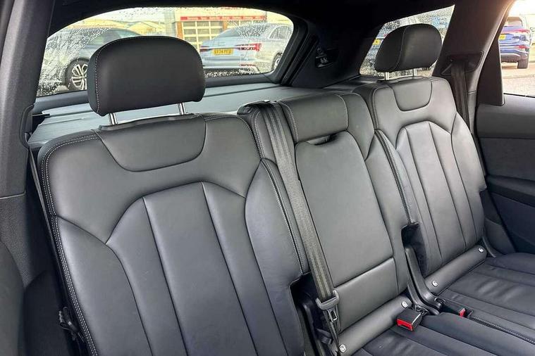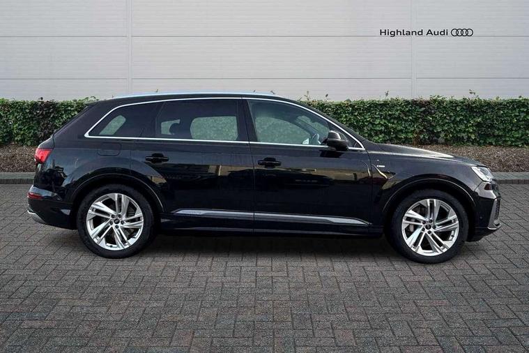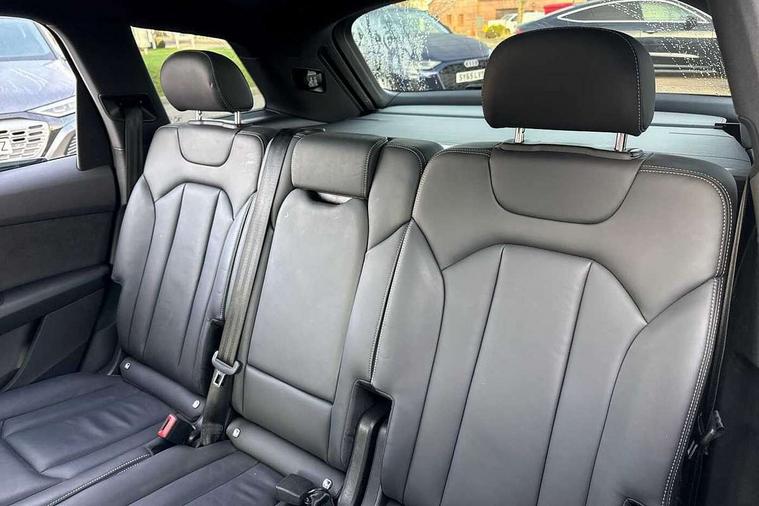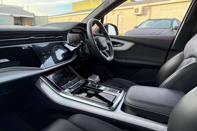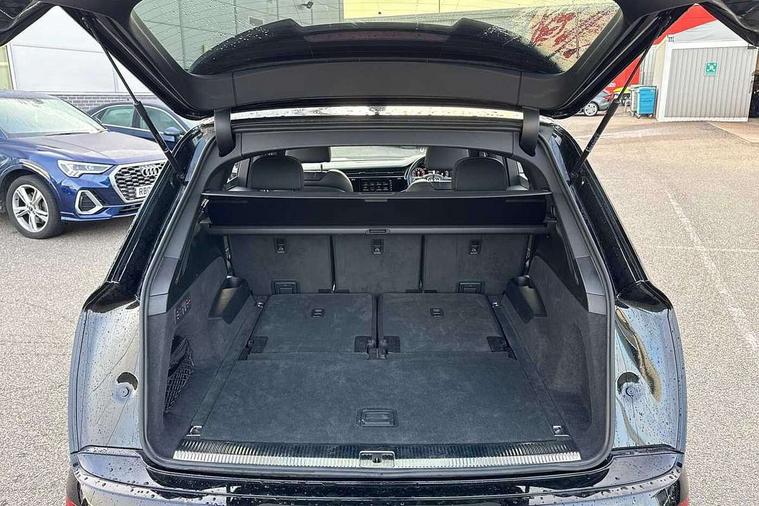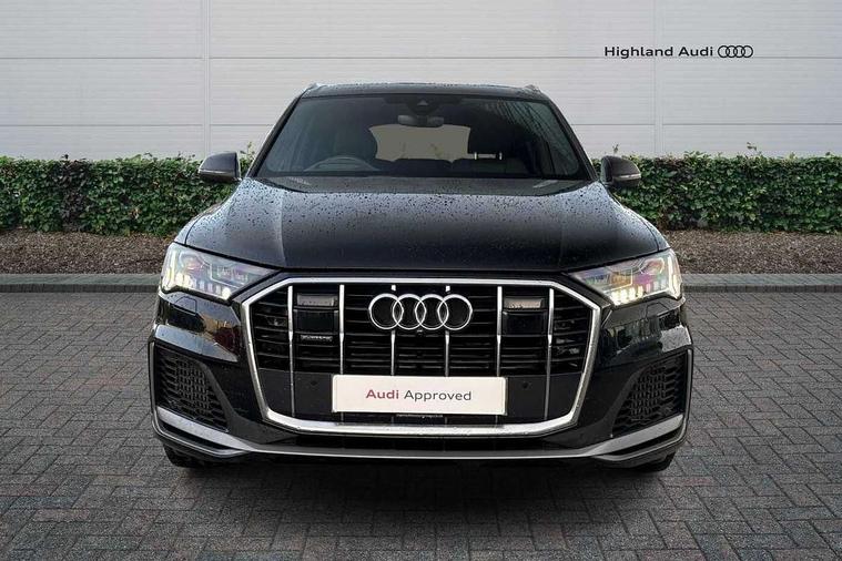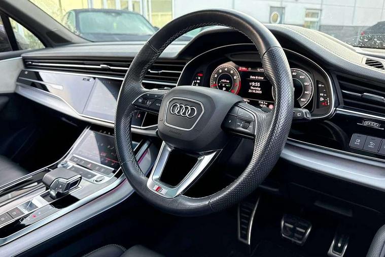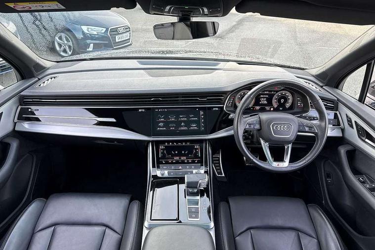 Audi connect safety and service (e-call), Audi connect with Amazon Alexa Integration, Audi drive select (Auto, Comfort, Dynamic, Efficiency, Individual, Off-road and All road), Audi phone box light with wireless charging, Audi virtual cockpit - 12.3" high-resolution LCD display with fully customisable instrument cluster, Bluetooth interface, Camera based traffic sign recognition, Electromechanical steering, MMI navigation plus with MMI touch screens includes 10.1" and 8.6" screens with haptic feedback, Natural voice recognition, Parking system plus with 360 degree display (front, rear and side sensors) - acoustic and visual park assist system, Power operated tailgate, Rear view camera, Smartphone interface includes wireless Apple carplay/Android Auto, Start/stop system, 48V Mild hybrid technology, 85 litre fuel tank, Adaptive air sports suspension, Quattro all wheel drive with self locking centre differential, Audi music interface - front 2 USB-C ports with charger and data functions, Audi sound system with 6 channel amplifier, 180 watt amplifying capacity and 10 loudspeakers including subwoofer, DAB digital radio module, 3rd brake light, Aluminium window trim, Audi Beam uses LEDs to project S emblem with red rhombus onto the ground when opening the side doors (front/rear), Auto dimming frameless rear view mirror, Black roof rails, Bumpers in contrast paint scandium grey finish includes door trim and wheel arch trim strips, inlays in door strip contain quattro embossing, Dark tinted Matrix LED headlights with dynamic front and rear indicators, Electrically adj heated/folding + automatically dimming exterior mirrors with memory + automatic kerb side function for passenger side exterior mirror, Heat insulating glass in windshield, Integrated LED indications in door mirrors, LED daytime running lights, LED rear tail lights, Privacy glass - dark tinted rear and rear side windows from B-pillar backwards, Rear side wing doors, Rear wiper, 2 seat bench in 3rd row, 2 zone automatic climate control, 3 seat bench in 2nd row, 7 seat layout with ISOFIX points for the front passenger seat and rear passenger seat, Black cloth headlining, Comfort front centre armrest, Electric adjustable front seat with 4 way lumbar support, driver memory functionality, Folding rear seats, Front head restraints, Front/rear floor mats, Heated front seats, Illuminated door sill trims with S logo, LED interior ambient lighting, Luggage compartment cover, Luggage compartment sill protection in stainless steel, Rear head restraints, Single front passenger seat, Stainless steel pedals, Sunvisors with illuminated vanity mirrors, Black styling pack plus - Q7, 3 point seatbelts on all rear seats, Audi pre sense front, Child locks on rear doors, Driver and front passenger, front side and curtain airbags, Electromechanical parking brake, Electronic Stabilisation Control (ESC) including ABS, ASR and EDL, Extended pedestrian protection measures, Hill hold assist, Seatbelt monitoring, Tyre pressure loss indicator, Warning triangle and first aid kit, Anti theft alarm, Anti-theft wheel bolts and wheel loosening detection, Keyless Go, Remote central locking, Polished oak trim with grey finish inlay, Tool kit, Tyre repair kit,