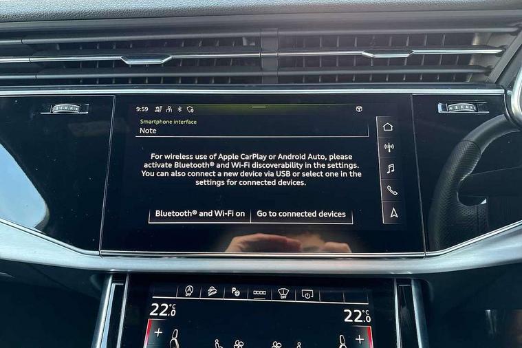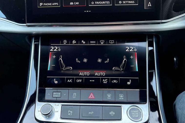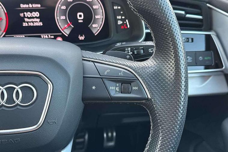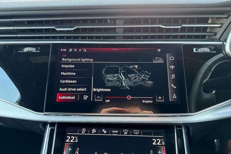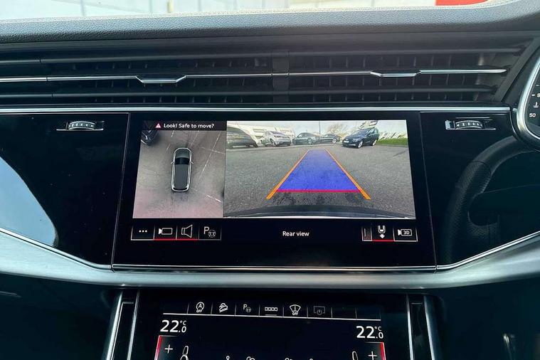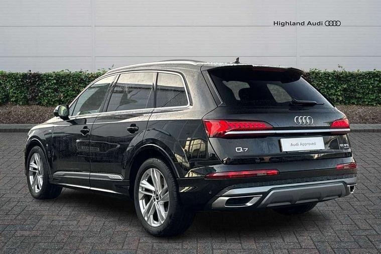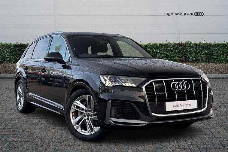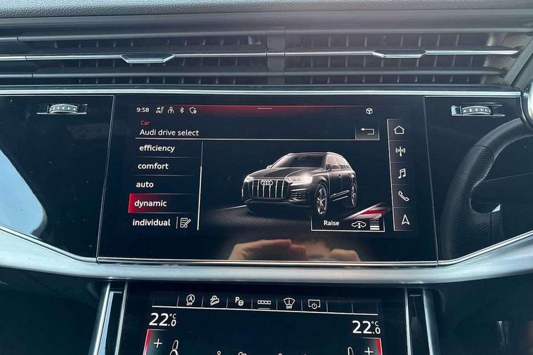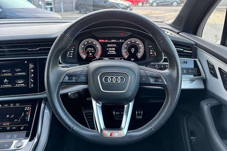 Audi connect safety and service (e-call), Audi connect with Amazon Alexa Integration, Audi drive select (Auto, Comfort, Dynamic, Efficiency, Individual, Off-road and All road), Audi phone box light with wireless charging, Audi virtual cockpit - 12.3" high-resolution LCD display with fully customisable instrument cluster, Bluetooth interface, Camera based traffic sign recognition, Electromechanical steering, MMI navigation plus with MMI touch screens includes 10.1" and 8.6" screens with haptic feedback, Natural voice recognition, Parking system plus with 360 degree display (front, rear and side sensors) - acoustic and visual park assist system, Power operated tailgate, Rear view camera, Smartphone interface includes wireless Apple carplay/Android Auto, Start/stop system, 48V Mild hybrid technology, 85 litre fuel tank, Adaptive air sports suspension, Quattro all wheel drive with self locking centre differential, Audi music interface - front 2 USB-C ports with charger and data functions, Audi sound system with 6 channel amplifier, 180 watt amplifying capacity and 10 loudspeakers including subwoofer, DAB digital radio module, 3rd brake light, Aluminium window trim, Audi Beam uses LEDs to project S emblem with red rhombus onto the ground when opening the side doors (front/rear), Auto dimming frameless rear view mirror, Black roof rails, Bumpers in contrast paint scandium grey finish includes door trim and wheel arch trim strips, inlays in door strip contain quattro embossing, Dark tinted Matrix LED headlights with dynamic front and rear indicators, Electrically adj heated/folding + automatically dimming exterior mirrors with memory + automatic kerb side function for passenger side exterior mirror, Heat insulating glass in windshield, Integrated LED indications in door mirrors, LED daytime running lights, LED rear tail lights, Privacy glass - dark tinted rear and rear side windows from B-pillar backwards, Rear side wing doors, Rear wiper, 2 seat bench in 3rd row, 2 zone automatic climate control, 3 seat bench in 2nd row, 7 seat layout with ISOFIX points for the front passenger seat and rear passenger seat, Black cloth headlining, Comfort front centre armrest, Electric adjustable front seat with 4 way lumbar support, driver memory functionality, Folding rear seats, Front head restraints, Front/rear floor mats, Heated front seats, Illuminated door sill trims with S logo, LED interior ambient lighting, Luggage compartment cover, Luggage compartment sill protection in stainless steel, Rear head restraints, Single front passenger seat, Stainless steel pedals, Sunvisors with illuminated vanity mirrors, Black styling pack plus - Q7, 3 point seatbelts on all rear seats, Audi pre sense front, Child locks on rear doors, Driver and front passenger, front side and curtain airbags, Electromechanical parking brake, Electronic Stabilisation Control (ESC) including ABS, ASR and EDL, Extended pedestrian protection measures, Hill hold assist, Seatbelt monitoring, Tyre pressure loss indicator, Warning triangle and first aid kit, Anti theft alarm, Anti-theft wheel bolts and wheel loosening detection, Keyless Go, Remote central locking, Polished oak trim with grey finish inlay, Tool kit, Tyre repair kit,