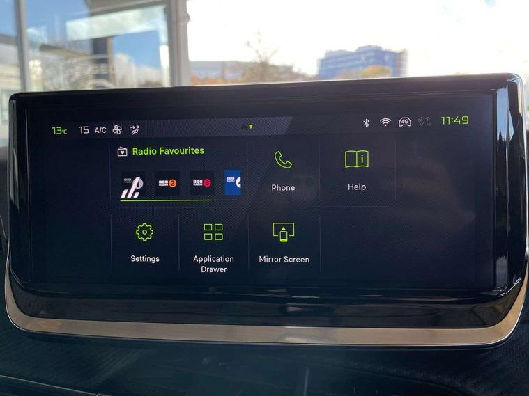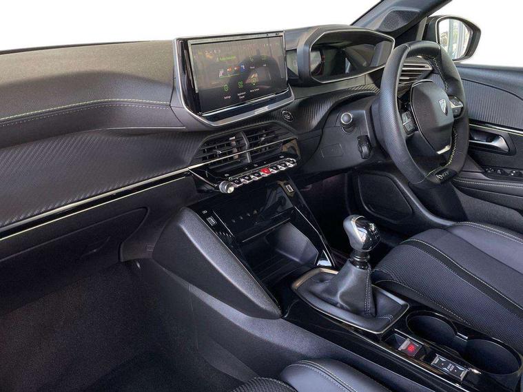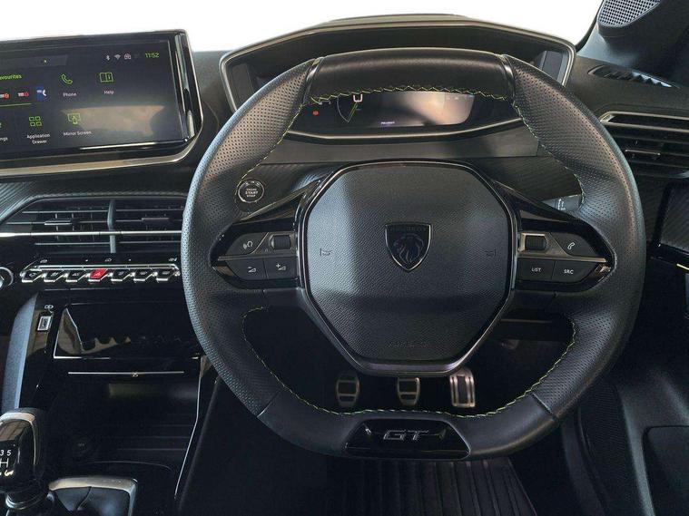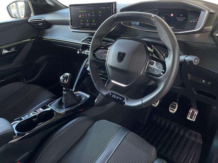 Bluetooth telephone facility, Drive mode select (Eco/Normal/Sport), Driver attention warning, Emergency call service, Exterior temperature indicator with ice warning, Front and rear parking sensors, Multi function trip computer, PEUGEOT i-Cockpit with 10" configurable 3D colour head up instrument panel, PEUGEOT i-Cockpit with 10" HD capacitive colour touchscreen, PEUGEOT i-Cockpit with compact steering wheel, PEUGEOT SOS and assistance, Push button start, Smart phone docking station, Smartphone 15W wireless charging plate, Speed limit recognition and recommendation, Start/stop system, Wireless mirror screen with apple carplay and android auto, 6 Speakers - 2 tweeters and 4 door speakers, DAB Digital radio, Peugeot i-connect infotainment system - 10in HD touchscreen, AM/FM/DAB digital radio, Wifi Mirroring, Bluetooth & 2 USB connection, USB-A socket (x1) and USB-C socket (x1) - rear, USB-C data and charge socket and USB-C charge socket in front, Voice recognition for radio, navigation and telephony features, 2 X Rear number plate lights, Acoustic windscreen, Antenna - Gloss Black 'fin' design, Automatic hazard light activation upon heavy brake application, Body coloured exterior door handles, Dark tinted rear side and tailgate windows, Diamond black rear spoiler (roof), Door sills protection with PEUGEOT signature lettering, Electric heated and power folding door mirrors with courtesy floor lighting, Frameless electrochrome interior rear view mirror, Full LED headlights with automatic height adjustment and PEUGEOT smartbeam assist, Gloss black B pillar, Gloss black door mirror shells, Gloss black front bumper grille with body colour accents, Gloss black rear cluster connecting strip, Gloss black wheel arch extensions, Gloss black window weatherstrips, GT model designation badging on C pillar, GT model designation badging on tailgate, Headlights left on audible warning, LED 3 claw horizontal rear lighting signature (with daylight function) and LED brake lights, indicators and reversing lights, LED daytime running lights with distinctive 3 claw signature, LED front indicators, LED third brake light, Model designation badges front and rear in basalt grey, One touch electric front/rear windows with pinch protection, Rear bumper with gloss black finish, Rear reversing lights, Rear side wing doors, Rear windscreen wiper triggered automatically in reverse gear, Roof spoiler, Tailgate with heated rear windscreen and wiper blade, Variable front intermittent wipers, 1/3 to 2/3 split folding rear seats, 12V socket, 3 seat bench in 2nd row, 8 Colour personalisable ambient lighting, Adamite green contrast stitching to front and rear armrest, front centre console, dashboard facia, Aluminium pedals, Automatic mono zone climate control air condition, Boot lighting, Driver and front passenger dynamic seats, Driver and front passenger seat manual adjustment in longitudinal and back rest angle, Driver and front passenger seat mechanical height adjustment, Driver and passenger sun visors, front footwells and central storage with LED lighting, Electric power steering with reach and rake adjustable steering column, Front centre armrest with storage compartment, Front LED interior light, front LED reading spotlights(x2), rear LED reading spotlight(x2), Gear shift indicator, High centre console with 2 cup holders, Luxury carpet mats, Map pockets on the backs of the front seats, Multi function full grain perforated leather steering wheel with adamite green stitch detail and 'GT' emblem, Passenger seat height adjuster, Piano keys gloss black plated toggle switches to access main functions of the vehicle, Rear centre headrest, Roof lining - Mistral black, Seatbelt unfastened on the move audible and visual alert for front and rear seats, Single front passenger seat, Visibility pack - 208, 2x Isofix child seat fitting on outer rear seats, 3 rear 3 point seatbelts, ABS (Anti-lock Braking System) with EBD (Electronic Brakeforce Distribution) and EBA (Emergency Braking Assistance), Active safety brake with night function/cyclists/pedestrians, Child locking functionality on rear doors, Driver and front passenger airbag with passenger airbag deactivation, Driver/front passenger side airbags, Electric parking brake, ESP with Hill Assist, Front and rear curtain airbags, Front and rear disc brakes, Front optimised safety headrests and 3 x rear retractable headrests with height adjustable, Front three point retractable seatbelts with force limiters, Remote plip(x2) for locking, unlocking, includes emergency key blade, Tyre pressure monitoring system, Acoustic vehicle alert system (AVAS), Alarm - Connected, volumetric , perimetric, anti lift sensor, Automatic door locking when moving off, Deadlock, Electronic code immobiliser, Peugeot Open and Go System, Remote central locking, Carbon effect Dashboard, front and rear door panel finish, 17" Yanaka two tone diamond cut alloy wheels wheels includes gloss black inserts, Space saver spare wheel,