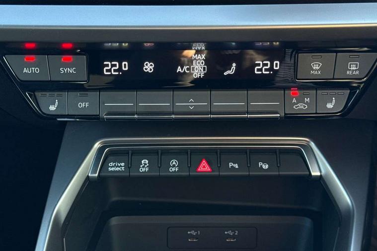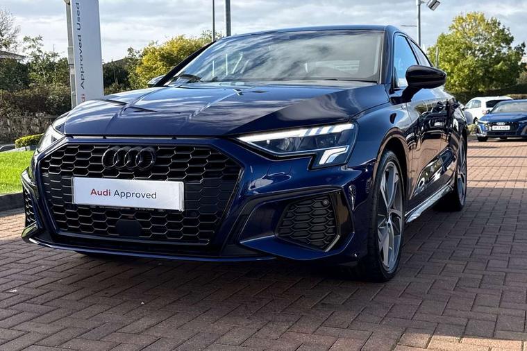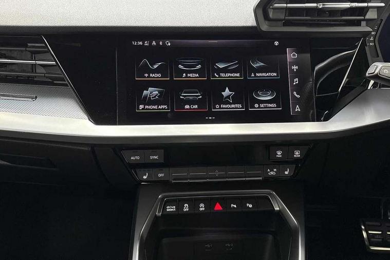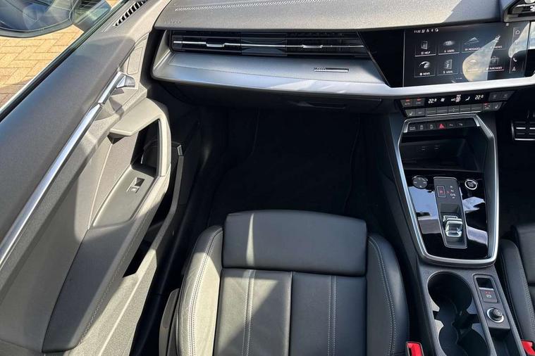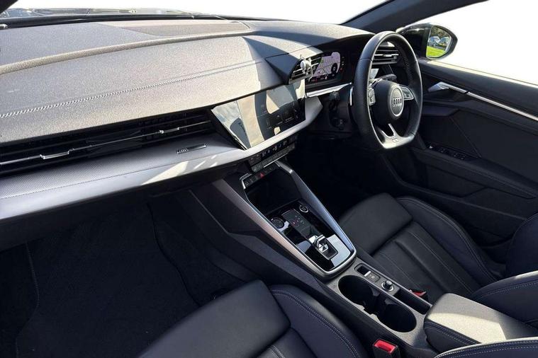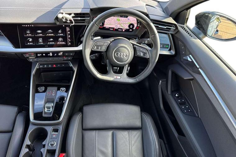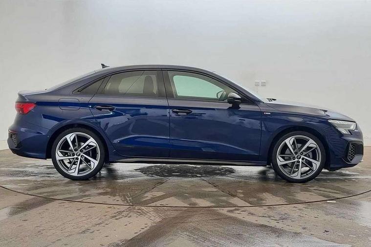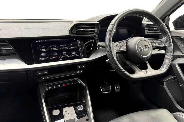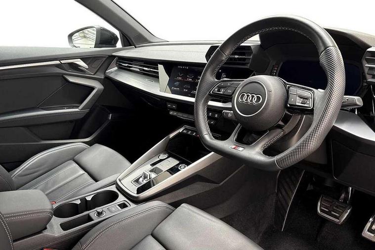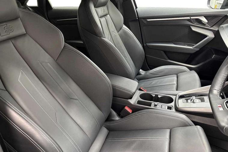Audi drive select (Auto, Comfort, Dynamic, Efficiency and Individual), Audi smartphone interface, Audi Virtual Cockpit - 10.25" digital and colour instrument cluster, Automatic start/stop system with recuperation, Bluetooth interface, Camera based traffic sign recognition, Collision avoidance assistant, e-Call (emergency call), Electromechanical power speed sensitive steering, Lane departure warning system, MMI Navigation Plus with high resolution 10.1" colour touch screen display, Service indicator, Trip computer, Voice control system with natural language interaction, Sports suspension, 2xUSB-C connection with data and charging functions, 6 passive loudspeakers, CD player, DAB Digital radio, 3rd brake light, Acoustic glass windscreen, Audi beam uses LEDs to project the Audi logo onto the ground as you exit your A3, Auto dimming frameless rear view mirror, Electrically adjustable/heated/folding/auto dimming door mirrors with integrated LED indications + kerb view function for passenger side, Front electric windows, Illuminated door sills with aluminium inserts at the front with S logo, LED daytime running lights, LED headlights with LED rear lights and dynamic rear indicators, Light and rain sensors, Model and engine designation badges at rear, Privacy glass - dark tinted rear window, rear door and side windows, Rear boot, Rear electric windows, Rear side wing doors, S roof spoiler, 12V socket and storage compartment in front centre console, 3 seat bench in 2nd row, 3 spoke flat bottomed leather multifunction sport steering wheel with gear shift paddles, 4 way electrically adjustable lumbar support for driver and front passenger, 60/40 split folding rear seat bench, Black cloth headlining, Dual zone electronic climate control, Front and rear centre armrest in artificial leather, Front and rear headrests, Front/rear floor mats, Height and reach adjustable steering wheel, Interior lighting - glove compartment light and right hand side, Luggage compartment floor covering, Manual boot compartment lid, Single front passenger seat, Stainless steel pedals and front footrest in black, Twin leather upholstery with front sports seats S embossed logo, Aluminium interior elements pack - A3, Black styling pack - A3 Saloon/Black edition, LED interior lighting pack - A3 Saloon, 3x3 point rear seat belts, Driver and front passenger airbag with passenger airbag deactivation, Electronic Stabilisation Control (ESC) including ABS, ASR and EDL, First aid kit with warning triangle and 2 safety vests, Front side airbags with head airbags and interaction airbag, Pre-sense front with pedestrian and cyclist detection, Seatbelt monitoring, Tyre pressure loss indicator, Anti theft alarm, Anti-theft wheel bolts, Electronically operated child locks, Immobiliser, Remote control central locking, Aluminium air vent surrounds, Dark spectrum aluminium inlays, accent surfaces in the dashboard and centre console in platinum grey silk effect paint finish, 19" 5 arm trapezoid design alloy wheels in matt grey with diamond cut finish,
