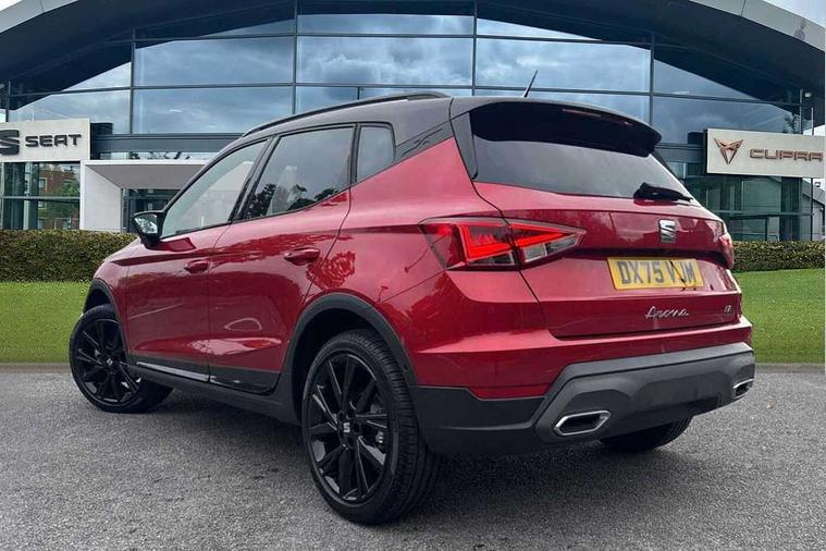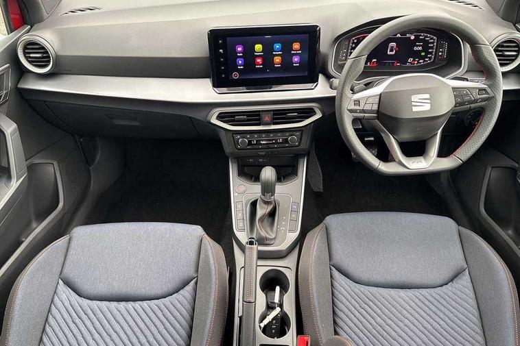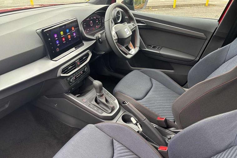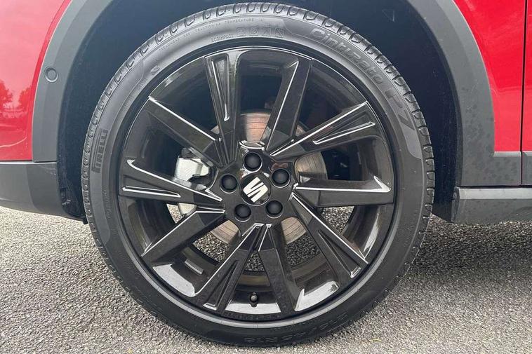 'Lights On' Reminder warning buzzer, 10" Digital cockpit, Digital clock, E-call, Electric speed sensitive power steering, Full link smartphone integration with mirror link, wireless apple carplay, Google android auto + USB Type C cable for apple and android devices, Lane keeping system, Low fuel warning light, Outside temperature display, Park assist system, Rear view camera, RPM counter, SEAT Drive profile - Four different models normal-sport-eco-individual, steering response, throttle response and gear shifts mode, Trip computer, Wireless phone charger, 9.2" colour touchscreen with navigation system, voice control and USB port (type c), Bluetooth interface for hands free and audio streaming, DAB digital radio and AM/FM radio, Steering wheel mounted audio controls, Anti theft roof antenna, Auto dimming interior rear view mirror, Automatic activation of hazard warning lights, Black roof rails and window surrounds, Black side skirts, Body coloured bumpers, Body coloured door handle inserts, Dark tinted rear windows, Electric front/rear windows, Electrically adjustable, heated and folding door mirrors, Front fog lights with cornering function and rear fog light, FULL LED automatic headlights with dynamic headlight range control, coming and leaving home, LED daytime running lights, Lasered lettering on B pillar, LED rear tail lights and licence plate lights, Protective side mouldings, Rain sensing wipers, Rear side wing doors, Rear spoiler, Rear window wash/wipe, Roof colour door mirrors, Third brake light, Twin exhaust pipe styling hidden exhaust pipe, Visible VIN plate, 2 cupholders, 3 seat bench in 2nd row, 60/40 split folding rear seat, Aircare filter, Black interior roof, Double boot floor, Driver sunvisor with covered mirror + card holder, Dual zone climate control, Front courtesy light with front reading lights, Front seat back storage pockets, Gear shift indicator, Grey interior air vents, Heated front seats, Height adjustable front seats, Height/reach adjustable steering column, Illuminated air vent surrounds, Illuminated boot, Instrument lighting with brightness control, Interior ambient lighting, Interior light in footwell, central console and door panel, ISOFIX points in outer rear seats with top tether anchorage points, Microsuede cloth upholstery, Passenger sunvisor with vanity mirror, Perforated flat bottomed leather steering wheel/gear knob/handbrake with red stitching and FR logo, Potentiometer, Single front passenger seat, Sports cloth bucket seats, Steering wheel mounted gearshift paddles, Two front and three rear height adjustable headrests, Interior chrome pack - Arona, Safe and driving pack (S) - Arona, Safety and driving pack (M) - Arona, ABS, Active front headrests, Child locks on rear doors, Driver and front passenger airbags with front passenger airbag de activation, front side and curtain airbags, Emergency Brake Assist (EBA) and front assist, Front and rear seatbelt reminder, Hill hold control, Multi-Collision braking, Tiredness recognition system, Traction control, Tyre pressure monitoring system, Alarm with back up horn with tow away protection, Deadlock, Electronic engine immobiliser, KESSY Keyless entry and go, Locking wheel bolts, Remote central locking, Titan black dashboard, 18" Black alloy wheels,