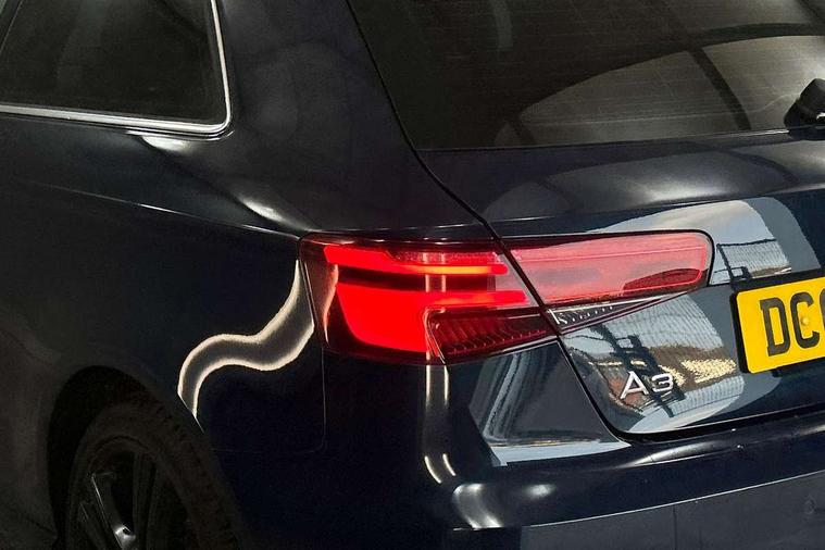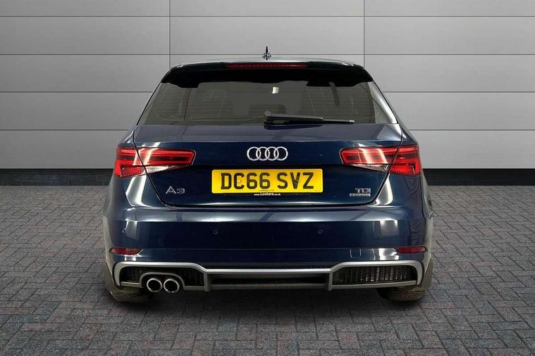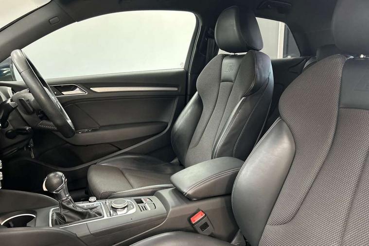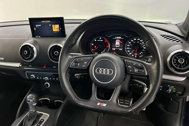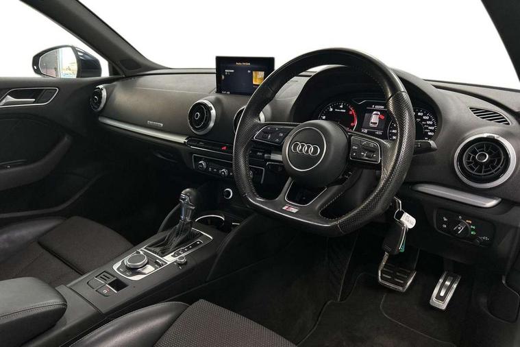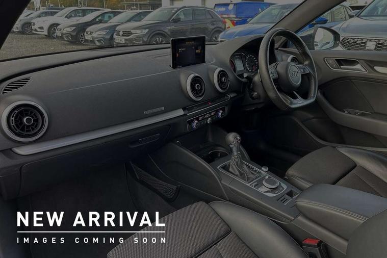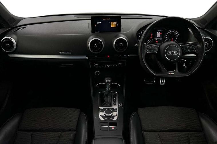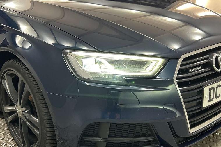 Audi connect, Audi drive select, Audi smartphone interface, Colour driver's information system display, Mobile telephone preparation - bluetooth interface, Service interval indicator, Speed limit display, Voice control system, Diesel particulate filter, 2 USB ports, Audi music interface, Auxiliary input socket, DAB Digital radio, Aluminium window trim, Body colour bumpers, Body colour door mirrors with integral indicators, Body colour roof spoiler, Chrome exhaust tailpipes, Electric front windows, Electric operated/heated door mirrors, Heated windscreen washer jets, LED daytime running lights, Matt black radiator grille, Rear wiper, S Line body styling, Sport specific side air inlet grille and diffuser insert, 3 adjustable rear headrests, 3 spoke flat bottomed multi-function leather steering wheel, 4 lashing points to secure luggage, Adjustable front armrest, Black cloth headlining, Dual zone electronic climate control, Front and rear interior lights with delay, Front passenger seat isofix location point, Front/rear floor mats, Height adjustable front seats, Height/depth adjustable steering column, Illuminated door sills, Illuminated glovebox, ISOFIX child seat preparation+airbag deactivation, Jack and tool kit, Stainless steel pedals, Steering wheel gearshift paddles, Storage compartment in centre console, Storage compartment under front seats, Storage compartments in doors, LED interior light pack - A3/RS3, Light and rain sensor pack - A3 Hatchback/Sportback, Storage and luggage pack - A3/RS3, 3 point seatbelts on all seats, ABS/EBD, Active bonnet, Active front headrests, ASR, Curtain airbags, Driver and passenger side airbags, Driver/Front Passenger airbags, Drivers knee airbag, EDL, Electromechanical parking brake, ESC - Electronic Stability Control + traction control, Front passenger airbag deactivation, Manual rear child locks, Multi-Collision braking, Seatbelt warning, Tyre pressure monitor, Warning triangle and first aid kit, Anti theft alarm, Anti-theft wheel bolts, Remote control central locking, Thatcham category 1 alarm + immobiliser, Aluminium air vent surrounds, Aluminium trim elements, Space saver spare wheel,