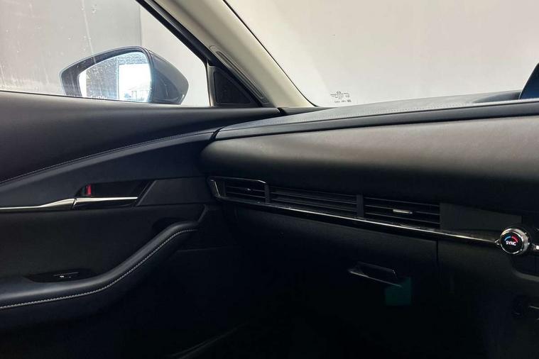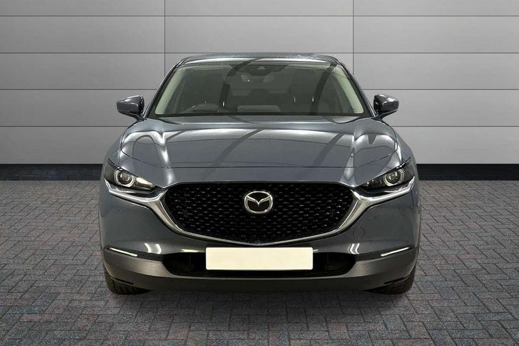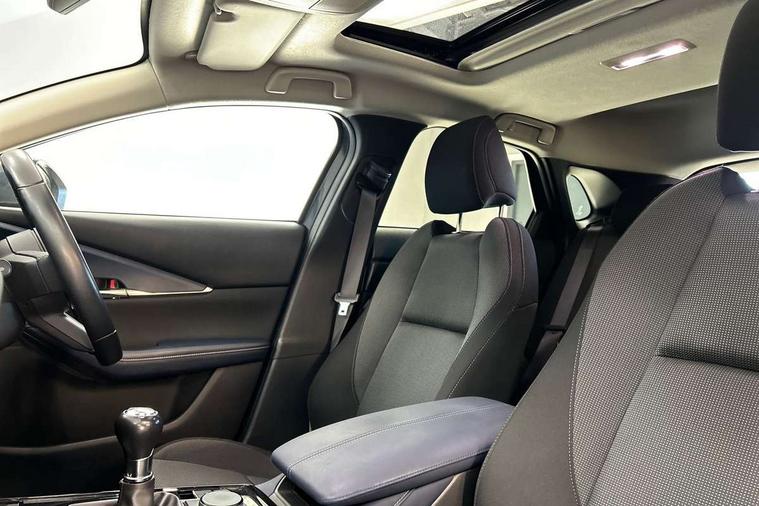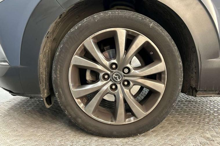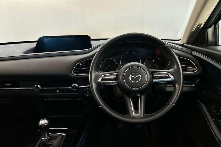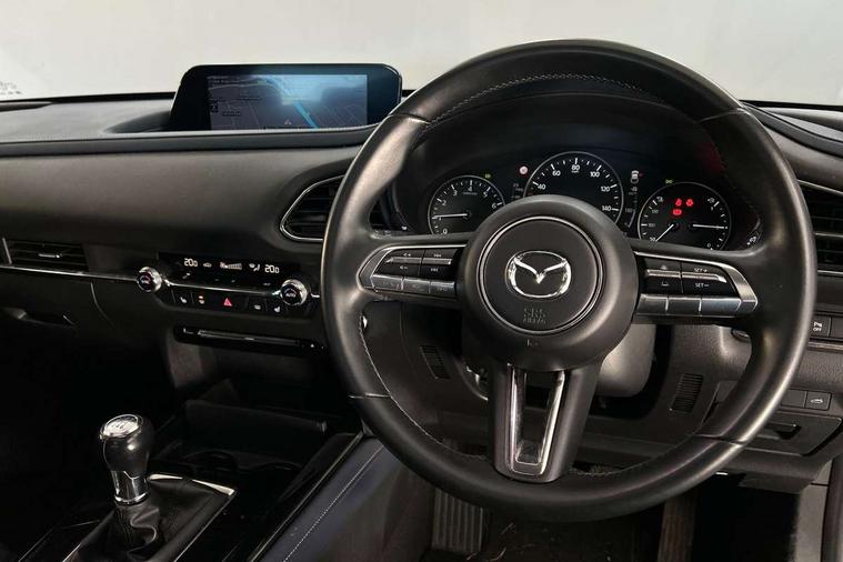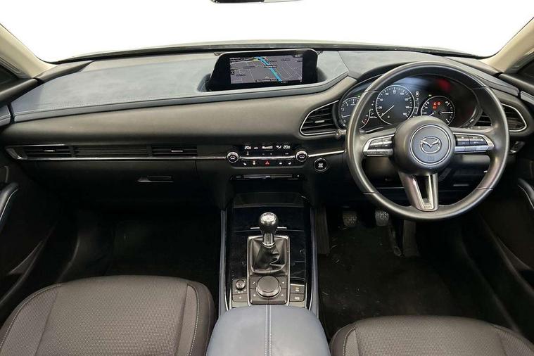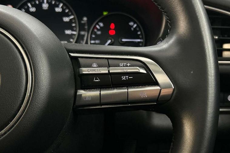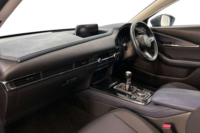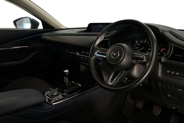 7" TFT Colour driver instrument panel display, 8.8" Colour centre touch screen display with Mazda Connect infotainment, Adaptive cruise control (Mazda radar cruise control) features stop and go, Apple car play/Android Auto, Blind spot monitoring with rear cross traffic alert, Driver attention alert system, E-call with GPS, Emergency stop signalling system, Engine start/stop button, Front and rear parking sensors, Integrated bluetooth, Integrated Mazda navigation system, Intelligent speed assist, Lane keep assist system (LAS) with Lane departure warning system (LDWS), PAS, Power lift gate, Reversing camera, Service indicator, Trip computer, Window projected colour active driving display (head up display) with traffic sign recognition, Cylinder Deactivation, i-stop, 2 USB charging ports, AM / FM / DAB radio with 8 speakers, CD player, Multimedia Commander including separate volume dial, Steering wheel mounted audio/bluetooth controls, Adaptive LED Headlights, Auto dimming driver's door mirror, B-pillar and C-pillar garnishes in gloss black finish, Body coloured, electrically adjustable, heated auto power folding door mirrors with integrated indicators, Coming/leaving home lighting function, Dual chrome exhaust, Dusk sensing headlights, Electric front/rear windows with one touch auto up/down, Frameless auto dimming interior rear view mirror, Front kodo turn signal, Gloss black front grille, Gloss black rear roof spoiler, High beam assist, LED headlamps with auto levelling, Privacy glass (rear side windows and rear screen), Rain sensing front wipers with adjustable speed and intermittent wipe, Rear fog lights, Rear wiper, Signature front LED daytime running lights, Signature LED rear combination lights with LED rear turn lights, 12V power outlet in centre console, 60/40 split fold down rear seats, Chrome horn pad ring, Cloth door panel inserts, Cloth upholstery with interior accents, Dashboard, door cards and front centre armrest in navy blue cloth, Driver and front passenger visors with covered vanity mirror and driver ticket holder, Driver seat manual slide, recline and height adjust, Driver, Front passenger and two rear grab handles with coathooks, Dual zone climate control air conditioning with rear air vents, Folding rear centre armrest with two cup holders, Front and rear (x3) head restraints, Front and rear door pockets, Front and rear LED lighting, Front armrest, Front centre storage with two cupholders, Front passengers seat manual slide, recline and height adjustment, Gear shift indicator, Glovebox illumination, Heated front seats with 3 stage setting, ISOFIX child seat anchorage points attached on outer rear seats, Leather wrapped gear shift knob, Leather wrapped steering wheel with telescopic and tilt adjustment, Luggage compartment light, Rear passenger seat map pockets, Roof mounted sunglasses holder, 3 point ELR front seat belts x2 with pretensioners, 3 point ELR rear seat belts, Anti-lock braking system (ABS), Driver/Front Passenger airbags, Drivers knee airbag, DSC - Dynamic Stability Control, Electronic parking brake with auto disengage function and auto hold function, Front and rear curtain airbags, Front passenger airbag cut-off switch, Front side airbags, Front smart city brake support, G-Vectoring control plus, Hill launch assist, Mild Hybrid system with regenerative braking, Seatbelt reminder for driver/front passenger and rear seats, Traction control system (TCS), Tyre pressure monitoring system (TPMS), Remote central locking with deadlocking and automatic door lock when driving, Smart keyless entry, Thatcham accredited alarm and immobiliser, 18" Silver metallic alloy wheels, Emergency tyre repair kit,