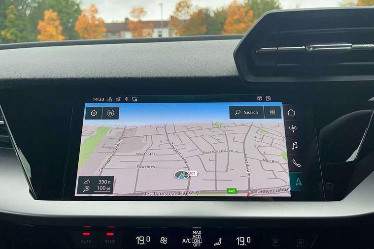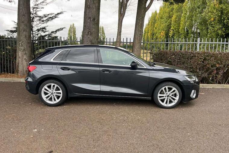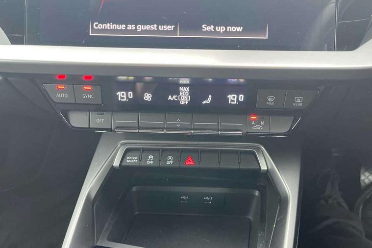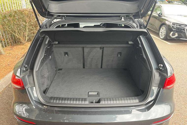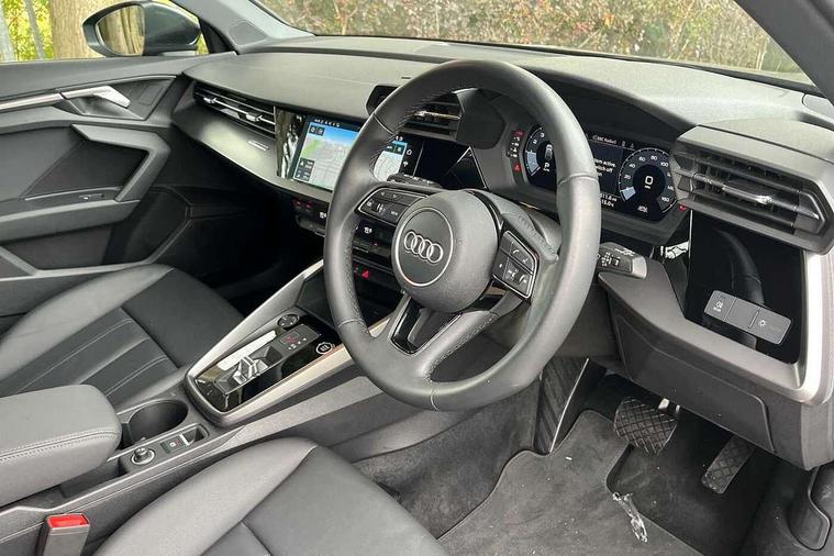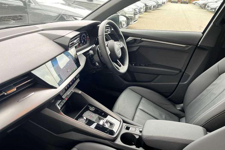 Audi drive select (Auto, Comfort, Dynamic, Efficiency and Individual), Audi smartphone interface, Audi Virtual Cockpit - 10.25" digital and colour instrument cluster, Automatic start/stop system with recuperation, Bluetooth interface, Collision avoidance assistant, e-Call (emergency call), Electromechanical power speed sensitive steering, Lane departure warning system, MMI Navigation Plus with high resolution 10.1" colour touch screen display, Service indicator, Trip computer, Voice control system with natural language interaction, Standard suspension, 2xUSB-C connection with data and charging functions, 6 passive loudspeakers, DAB Digital radio, 3rd brake light, Acoustic glass windscreen, Aluminium window trim, Auto dimming frameless rear view mirror, Body colour exterior mirrors, Body colour roof spoiler, Electrically adjustable/heated/folding/auto dimming door mirrors with integrated LED indications + kerb view function for passenger side, Front electric windows, LED daytime running lights, LED headlights and halogen rear lights, Light and rain sensors, Rear electric windows, Rear side wing doors, Rear window, rear door windows and rear side windows in clear glass, Rear wiper, 12V socket and storage compartment in front centre console, 3 seat bench in 2nd row, 40/20/40 split folding rear seat bench with cupholder, Dual zone electronic climate control, Front and rear centre armrest, Front and rear headrests, Front door sill trims with aluminium inlay, Front/rear floor mats, Height and reach adjustable steering wheel, Interior lighting - Front and rear roof module including reading lights, glove compartment light and right hand side, Luggage compartment floor covering, Manual boot compartment lid, Manually adjustable front seats, Seat side bolsters, Single front passenger seat, Steel grey cloth headlining, Twin leather upholstery, Aluminium interior elements pack - A3 Sportback, Sport styling pack - A3 Sportback, 3x3 point rear seat belts, Audi pre sense front, Driver and front passenger airbag with passenger airbag deactivation, Electronic Stabilisation Control (ESC) including ABS, ASR and EDL, First aid kit with warning triangle and 2 safety vests, Front side airbags with head airbags and interaction airbag, Pre-sense front with pedestrian and cyclist detection, Seatbelt monitoring, Tyre pressure loss indicator, Anti theft alarm, Anti-theft wheel bolts, Electronically operated child lock, Immobiliser, Remote control central locking, Inlays with silk effect paint in platinum grey,