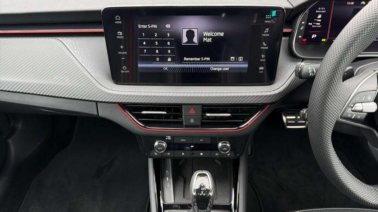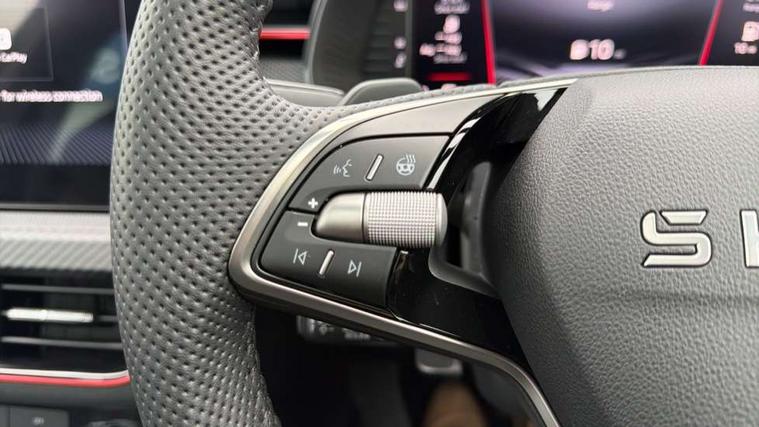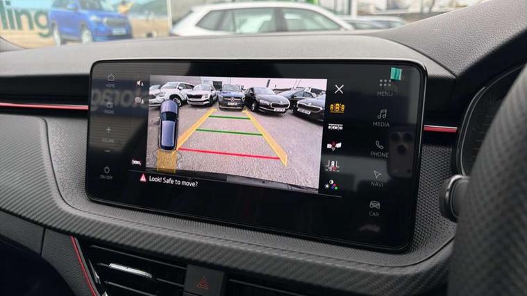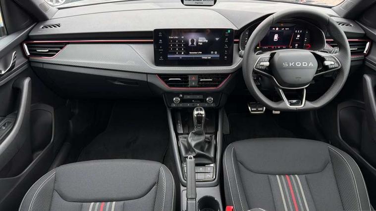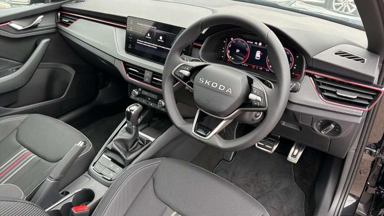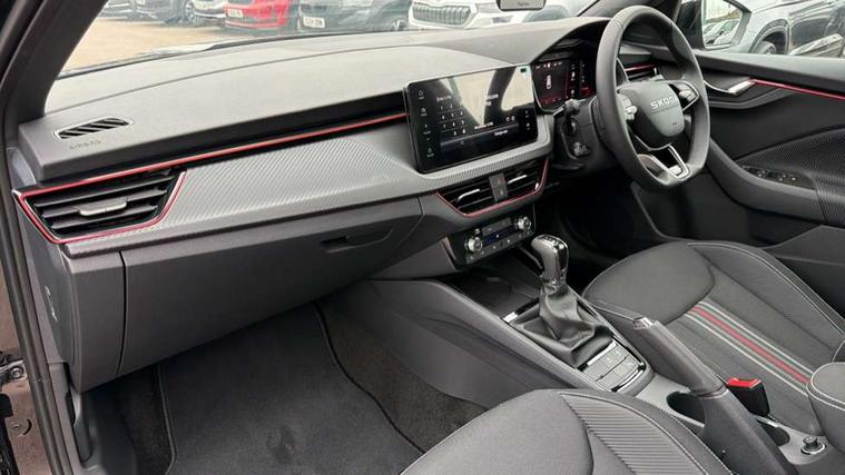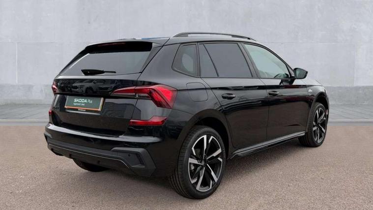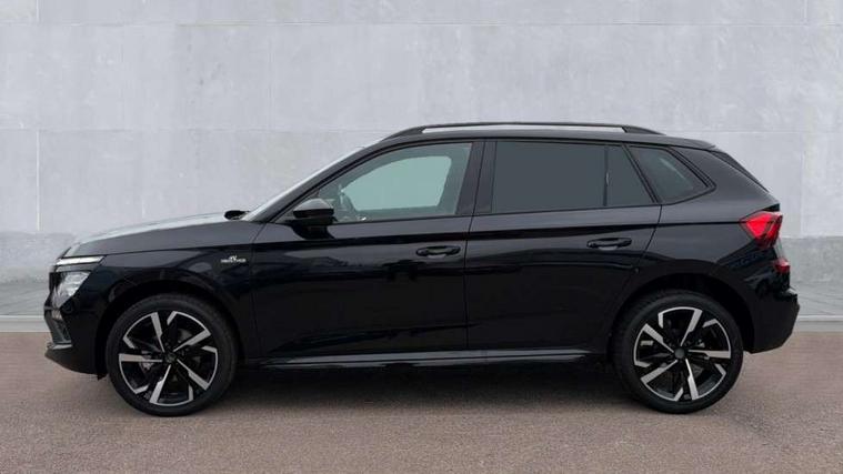 Advanced driver attention and drowsiness monitor, Bluetooth system, E-call, Front assist system, PAS, Rear parking sensors, Rear view camera, Service indicator, Speed limiter, Traffic sign recognition, Virtual cockpit with 10.25" display, Voice control system, Wireless smartlink, 4 USB C ports, 8 Speakers, 9.2" Skoda navigation display, DAB Digital radio, Auto dimming rear view mirror, Automatic headlight control with coming home and leaving home feature, Black door mirrors, Black radiator grille, Black rear diffuser, Black roof spoiler, Body colour bumpers, Body colour door handles, Boot lettering in black, Extended tailgate glass, Fixed panoramic sunroof with black roof rails, Front and rear electric windows, Heated rear window, LED daytime running lights, LED high beam, LED low beam, LED third brake light, Light sensors, Monte carlo plaque, Privacy glass, Rear side wing doors, Rear wiper, Ticket holder inside windscreen, 12V socket in luggage compartment, 3 seat bench in 2nd row, Aluminium pedals, Ambient lighting in white/red, Art leather carbon decor inserts, Art leather carbon door inserts, Black roof lining, Cargo elements, Chrome inner door handles, Driver and passenger sun visors with vanity mirror, Dual zone climate control, Front and rear roof lights, Front centre armrest, Front head restraints, Glove compartment with illumination, Height adjustable driver seat, Height adjustable front passenger seat, Ice scraper, Inner circulation control with pollen filter, ISOFIX on front passenger seat, Isofix preparation for back seats, Leather gearknob and handbrake lever, Manual lumbar support for front seats, Monte Carlo cloth upholstery, Net package and top tether hooks in boot space, Net under rear shelf, Pocket on the back of both front seats include mobile phone pockets, Rake/reach adjustable steering wheel, Reading lights, Rear centre armrests, Red hotstamping, Single front passenger seat, Sports seats, Textile floor mats, Third rear headrest, Top tether for front passenger seat, Umbrella in driver's door, Light and view plus package - Kamiq, 3x3 point rear seatbelts, Airbags - driver and front passenger, Disc brakes, ESP, Extended and predictive pedestrian/cyclist protection, Front passenger airbag deactivation switch, Front side airbags with curtain airbags, Hill hold control, Manual leather parking brake, Manual rear child locks, One tone horn, Seatbelt reminder for driver an co-driver, Traction control, Tyre pressure monitor, Anti-theft alarm system with interior monitoring, backup horn, towing protection and remote central locking with SAFE system, Anti-theft wheel bolts, Electronic engine immobilizer, 18" Ursa black diamond cut alloy wheels,