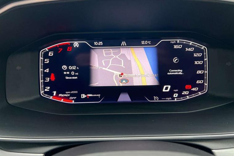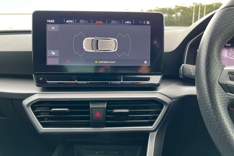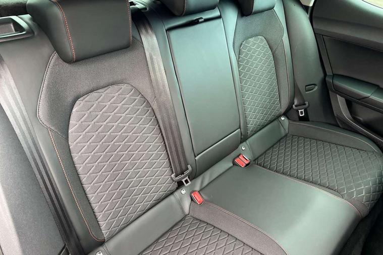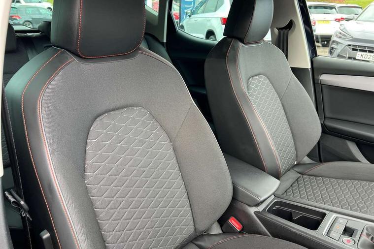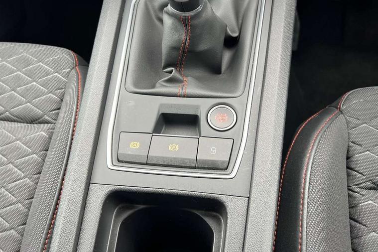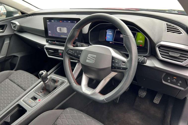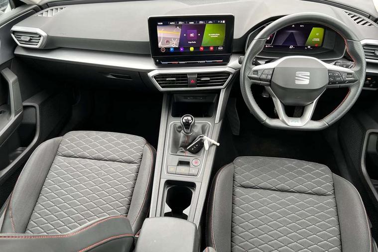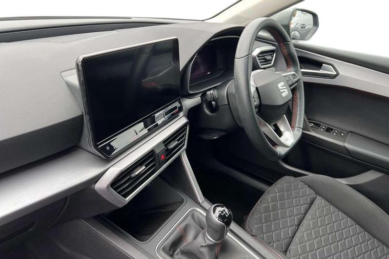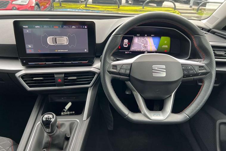 Digital cockpit, E-call, Four x USB Type C ports, Front assist with forward collision warning braking reaction to vehicles, pedestrians and cyclists, Full link smartphone integration with Mirror Link, wireless Apple CarPlay and wired Google Android Auto, Lane assist, Lockable tailgate, Park assist (inc front/rear parking sensors), Power assisted speed sensitive electro-mechanical steering, RPM, trip computer, outside temp gauge, instrument light brightness, low fuel warning light, lights on reminder, gearshift indicator, SEAT drive profile with 4 modes (Eco/Normal/Sport/Individual), throttle response, Service interval indicator, Start/stop system with regenerative braking, Sports suspension, XDS electronic differential lock and dynamic traction support, 7 speakers, Auxiliary input socket, Auto dimming rear view mirror, Body colour door handles, Body coloured bumpers, Cosmo grey exterior mirrors with integrated LED indicators, Dark tinted rear windows, Dynamic headlight range control, Electric front/rear windows, Electrically adjustable, heated and folding door mirrors, FR sports bumper, Illuminated front door sill, LED front fog lamps with cornering function, LED Headlights with dynamic turn signals, LED tail lights and rear fog lights with rear coast to coast lighting, Rain sensing wipers, Rear side wing doors, Rear wash/wipe, Separate daytime running light with automatic headlight control and coming home feature, Third brake light, Welcome light silhouette from exterior mirrors, 12v power point in centre console, 3 seat bench in 2nd row, 60/40 split rear bench seat with armrest, Ambient lighting with glovebox, footwell and single monocolour, Driver/passenger manual seat height adjustment, Dust/pollen filter, Flat bottomed perforated leather steering wheel with red stitching and FR logo and leather gear stick, Folding boot cover, Front and rear height adjustable headrests, Front and rear reading lights X 4, Front centre armrest, Front seatback storage pockets, Height/reach adjust steering wheel, ISOFIX points in outer rear seats with top tether anchorage points, Luggage tie-down hooks, Lumbar adjustment for front seats, Single front passenger seat, Sunvisors with covered illuminated mirror, Three zone climate control, Two tone cloth upholstery, Media system plus with navigation - Leon, 3 point seatbelts on all rear seats, ABS, Brake control system - ESC and brake booster, Child proof door locks, Driver and front passenger airbags with front passenger airbag de-activation, front side and curtain airbags, Electronic parking brake, Extended safety system - seat belt tensioner, window closure and hazard lights, Hill hold control, Rear disc brakes, Seat belt reminder for front and rear seats, Tiredness recognition system, driver alert system, Tyre pressure monitoring system, Anti theft alarm system with interior monitoring in cab, backup horn and towing protection, KESSY Go (Keyless start), Locking wheel bolts, Wireless phone charging, Chrome interior detailing, 17" Dynamic Bi-spoke alloy wheels with 91W tyres, Tool kit,