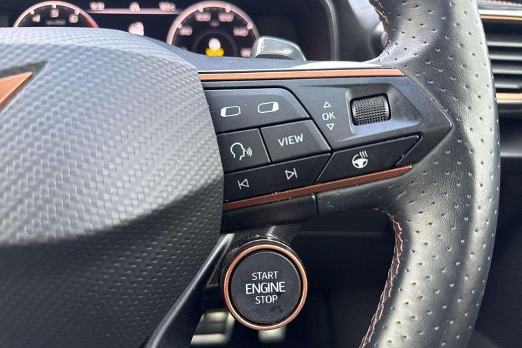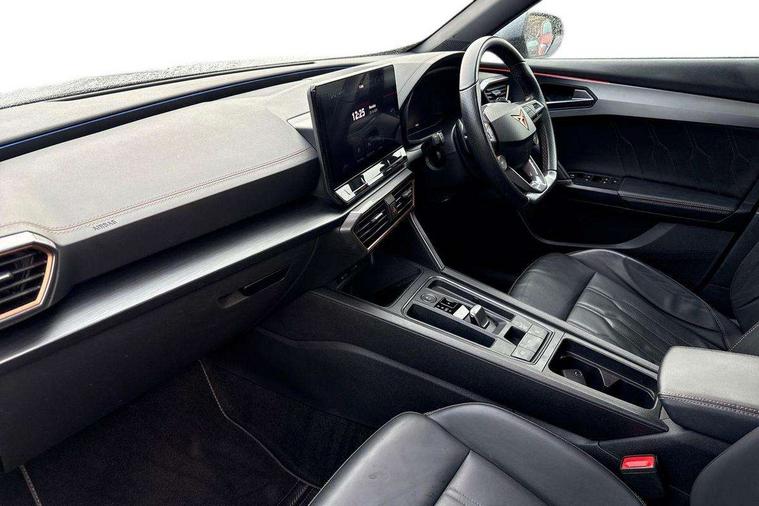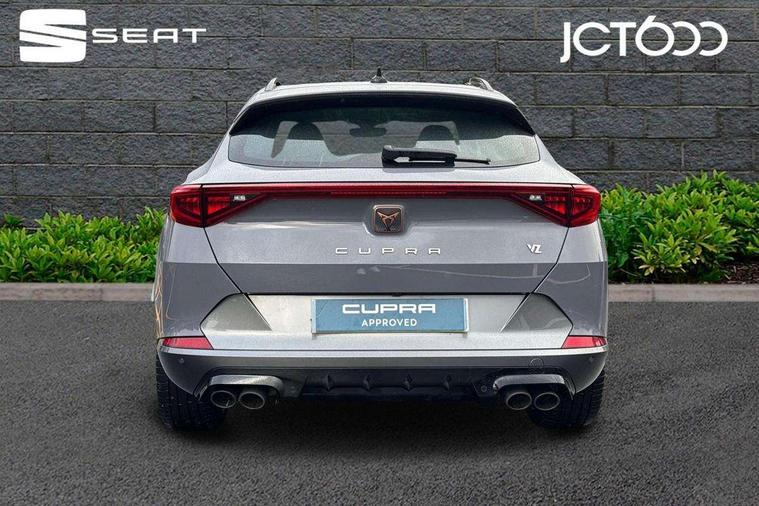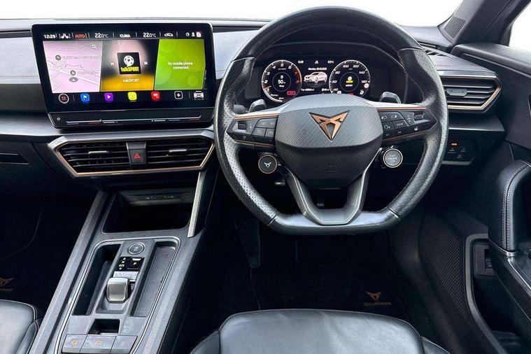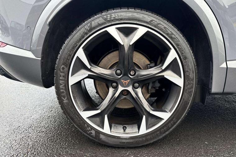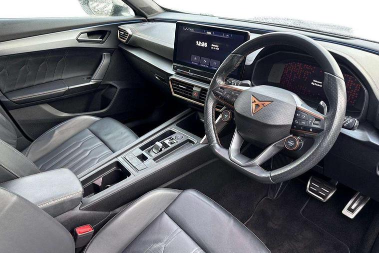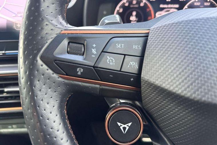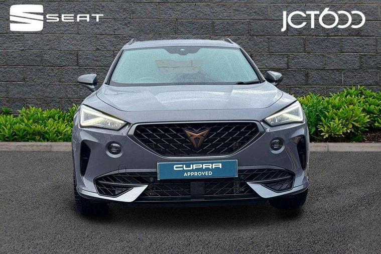Digital cockpit and configurable dashboard, Driver alert system, Dynamic chassis control with driving profile selection (Comfort, Sport, CUPRA, Individual), E-call, Forward collision warning with automatic braking, Lane assist, Navigation system with 12'' Touchscreen Display, Park assist (inc front/rear parking sensors), Predictive adaptive cruise control with speed limiter, RPM, trip computer, outside temp gauge, instrument light brightness, low fuel warning light, lights on reminder, gearshift indicator, Service interval indicator, Speed sensitive power steering, Start/stop system with regenerative braking, Virtual pedal and electric tailgate, Voice control system, Wireless apple carplay, Wireless phone charger, Electronic locking differential and dynamic traction support, Sports suspension with front shock absoption, 2 front and 2 rear USB type C sockets, Auxiliary input socket, DAB radio, Auto dimming rear view mirror, Body colour door handles, Body coloured bumpers, Dark grey wing mirror, Daytime running light with automatic headlight control and coming home feature, Dynamic headlight range control, Electric front/rear windows, Electrically adjustable heated and folding door mirrors with memory function, Front fog lamps with cornering function, Gloss black roof rails and window surrounds, LED Headlights, LED Taillights with dynamic indicator, Rain sensing wipers, Rear diffuser with twin exhaust pipe on each side, Rear side wing doors, Rear wash/wipe, Sports bumpers, Third brake light, Tinted rear windows, VZ logo rear badging, Welcome lights, 12v power supply in centre console, 12V socket, 12v socket in loadspace, 2 front and 2 rear reading lights, 230V socket, 3 seat bench in 2nd row, 60/40 split rear bench seat with armrest and mechanical seat release, Black headlining, Cupra sports pedals, Dust/pollen filter, Front and rear head restraints, Front centre armrest, Height/reach adjust steering wheel, Illuminated interior front door sills, Illuminated sunvisor with mirror, Isofix, Leather heated multi-function sports steering wheel with start stop, CUPRA mode button and gear shift paddles, Luggage tie-down hooks, Single front passenger seat, Three zone climate control with control panel in rear, Variable luggage/load compartment floor, Wraparound lighting, Genuine Nappa leather Pack - Cupra, Safety and driving pack (XL) - Formentor, 3 point seatbelts on all rear seats, ABS, Brake control system - ESC and brake booster, Child proof door locks, Driver and front passenger airbags with front passenger airbag de-activation, Electronic parking brake, Front and rear disc brakes, Front side curtain airbags, Hill hold control, Seat belt reminder for front and rear seats, Tyre pressure monitoring system, Anti theft alarm system, Keyless entry and start system (KESSY), Locking wheel bolts, Copper and aluminium interior detailing, 19" 'Exclusive' machined sport matte black and silver alloy wheels, Space saver spare wheel,