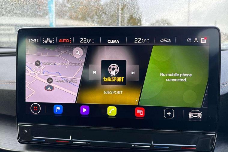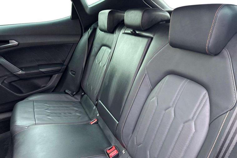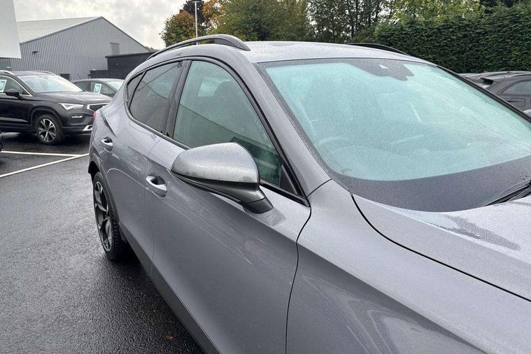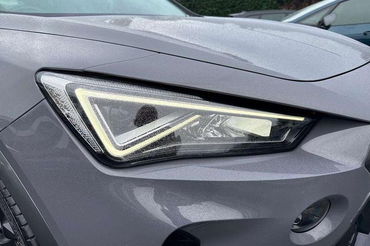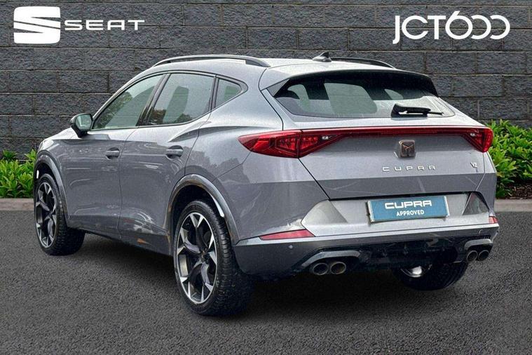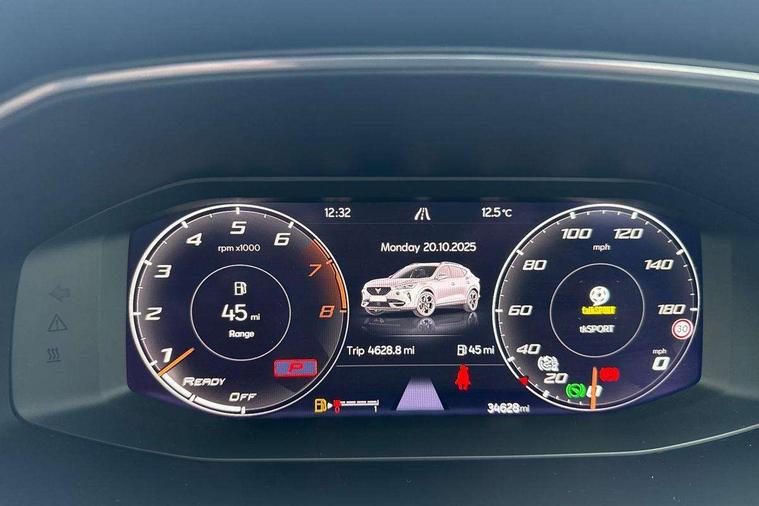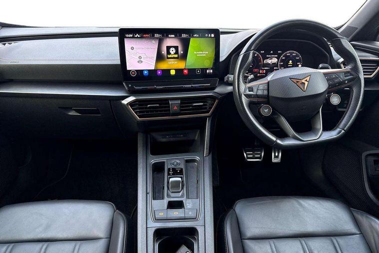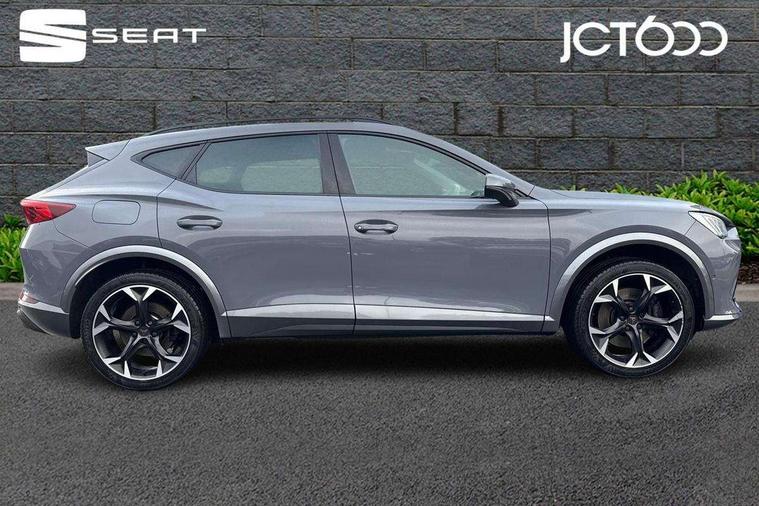 Digital cockpit and configurable dashboard, Driver alert system, Dynamic chassis control with driving profile selection (Comfort, Sport, CUPRA, Individual), E-call, Forward collision warning with automatic braking, Lane assist, Navigation system with 12'' Touchscreen Display, Park assist (inc front/rear parking sensors), Predictive adaptive cruise control with speed limiter, RPM, trip computer, outside temp gauge, instrument light brightness, low fuel warning light, lights on reminder, gearshift indicator, Service interval indicator, Speed sensitive power steering, Start/stop system with regenerative braking, Virtual pedal and electric tailgate, Voice control system, Wireless apple carplay, Wireless phone charger, Electronic locking differential and dynamic traction support, Sports suspension with front shock absoption, 2 front and 2 rear USB type C sockets, Auxiliary input socket, DAB radio, Auto dimming rear view mirror, Body colour door handles, Body coloured bumpers, Dark grey wing mirror, Daytime running light with automatic headlight control and coming home feature, Dynamic headlight range control, Electric front/rear windows, Electrically adjustable heated and folding door mirrors with memory function, Front fog lamps with cornering function, Gloss black roof rails and window surrounds, LED Headlights, LED Taillights with dynamic indicator, Rain sensing wipers, Rear diffuser with twin exhaust pipe on each side, Rear side wing doors, Rear wash/wipe, Sports bumpers, Third brake light, Tinted rear windows, VZ logo rear badging, Welcome lights, 12v power supply in centre console, 12V socket, 12v socket in loadspace, 2 front and 2 rear reading lights, 230V socket, 3 seat bench in 2nd row, 60/40 split rear bench seat with armrest and mechanical seat release, Black headlining, Cupra sports pedals, Dust/pollen filter, Front and rear head restraints, Front centre armrest, Height/reach adjust steering wheel, Illuminated interior front door sills, Illuminated sunvisor with mirror, Isofix, Leather heated multi-function sports steering wheel with start stop, CUPRA mode button and gear shift paddles, Luggage tie-down hooks, Single front passenger seat, Three zone climate control with control panel in rear, Variable luggage/load compartment floor, Wraparound lighting, Genuine Nappa leather Pack - Cupra, Safety and driving pack (XL) - Formentor, 3 point seatbelts on all rear seats, ABS, Brake control system - ESC and brake booster, Child proof door locks, Driver and front passenger airbags with front passenger airbag de-activation, Electronic parking brake, Front and rear disc brakes, Front side curtain airbags, Hill hold control, Seat belt reminder for front and rear seats, Tyre pressure monitoring system, Anti theft alarm system, Keyless entry and start system (KESSY), Locking wheel bolts, Copper and aluminium interior detailing, 19" 'Exclusive' machined sport matte black and silver alloy wheels, Space saver spare wheel,
