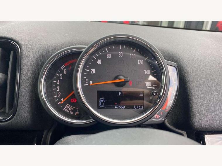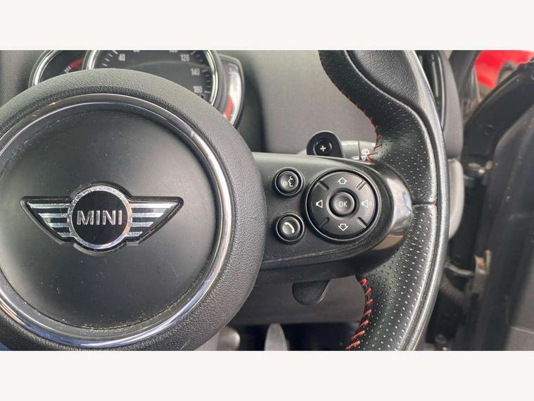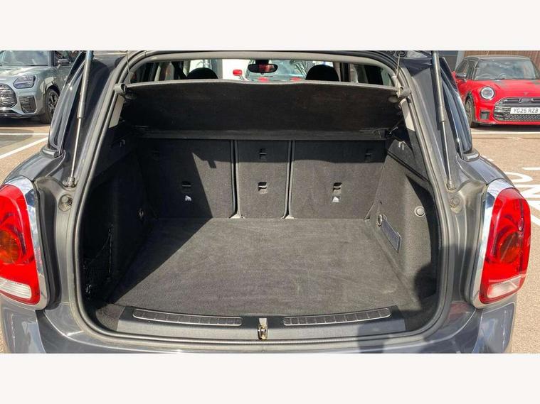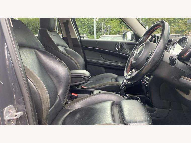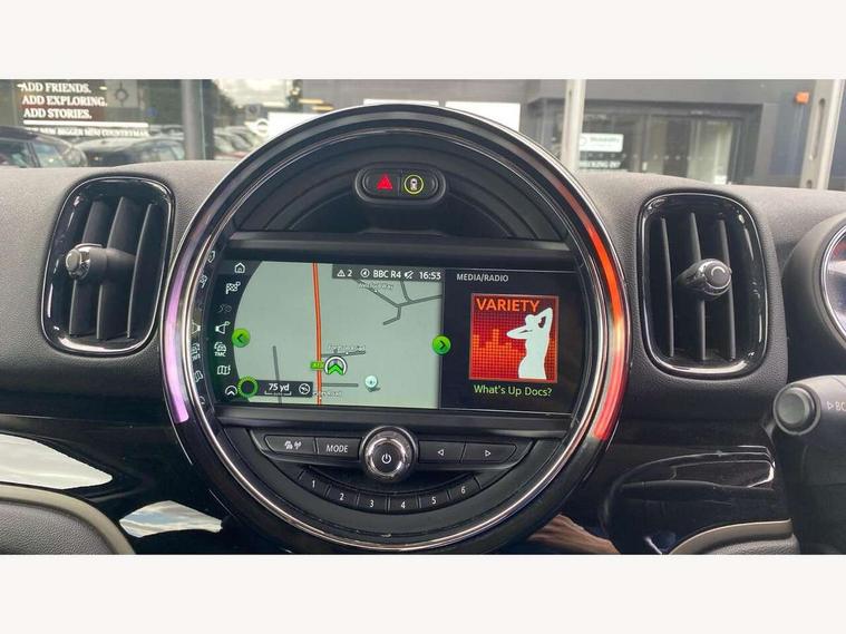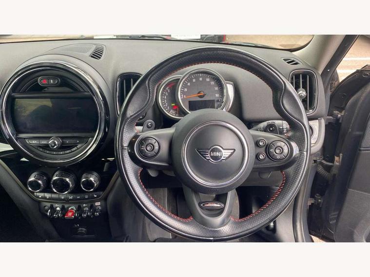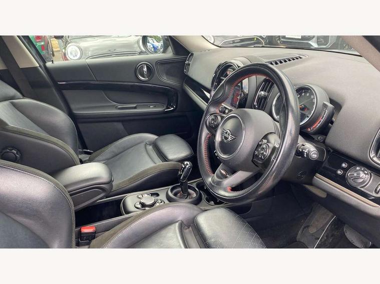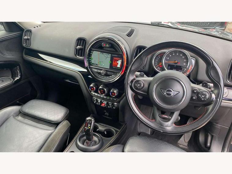 Apple CarPlay preparation, Brake pad wear indicator warning light, Central display with LED ring and 6.5" colour touch screen, Connected driver, DTC - Dynamic traction control, Exterior temperature gauge, Intelligent emergency call, MINI remote services, MINI TeleServices, Navigation system, On board computer, Personal Profile, Real time traffic information, Service interval indicator, Servotronic speed sensitive power steering, Electronic differential lock, Performance Control, Auxiliary input socket, DAB digital radio module, MP3 compatible radio/single CD player, Radio visual boost, Anti dazzle rear view mirror, Body colour scoop integrated into engine- compartment lid, Chrome door handles, Chrome headlight surround, Chrome plated radiator grille, Chrome side scuttle, Chrome window surround, Electric front windows + one touch + anti-pinch, Electrically adjustable door mirrors, Follow me home headlights, Green tinted glass, Heated door mirrors/heated windscreen washers, Heated rear window with automatic switch off, Metal look door sill finishers, Rain sensor including auto headlights activation, Rear wiper, Roof spoiler, Twin chrome exhaust tailpipes, White indicator lights, 12V power point front, 2 cupholders in front centre console, 4 lashing points to secure luggage, 40:20:40 split folding rear seats, Centre console storage box, Chrome interior door handles, Driver/passenger sunvisors, Front and rear headrests, Front interior light, Front passenger grab handle, Front seat backrest storage nets, Gearshift paddles, Heater with recirculation function, Height/reach adjust steering wheel, Isofix rear child seat preparation, Luggage compartment lighting, Multifunction steering wheel, Rear grab handles, Sensatec gearshift and handbrake, Sport front seats, Storage compartments in doors, Toolkit in luggage compartment, Interior lights pack - Countryman, MINI Excitement Pack - Countryman, 3 point automatic seatbelts, 3 point seatbelts on all rear seats, ABS, Cornering brake control (CBC), Crash Sensor - activates hazard/interior lighting + unlocks doors, Driver and passenger airbags, Driver and passenger side airbags, DSC - Dynamic Stability Control, Electronic brake force distribution, Electronic parking brake, Front curtain airbags, Front passenger airbag deactivation, Fuel cut off safety device, Hill start assist, Pyrotechnically pre-tensioned front seatbelts, Tyre pressure warning, Automatic door locking, Keyless Start, Locking wheel bolts, RF remote control central locking, Second remote key, Thatcham category 1 alarm + immobiliser,