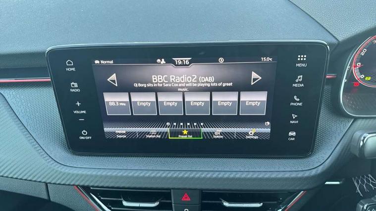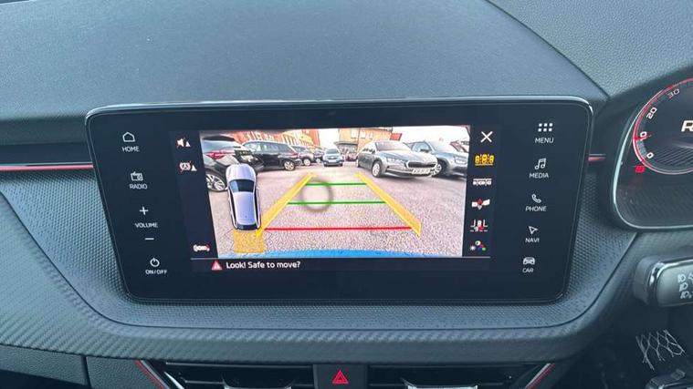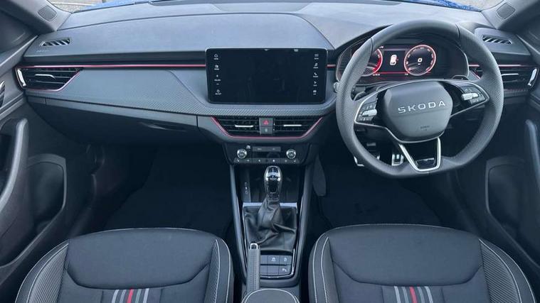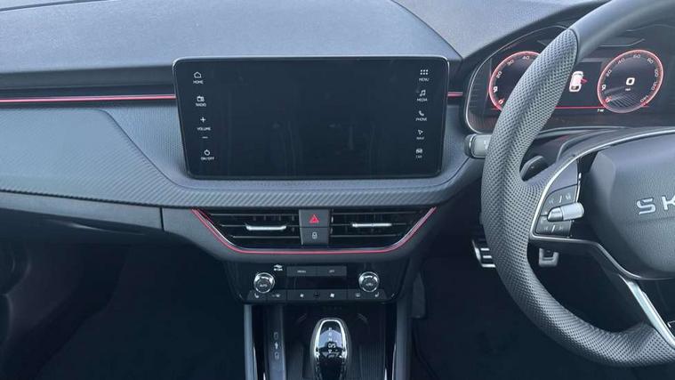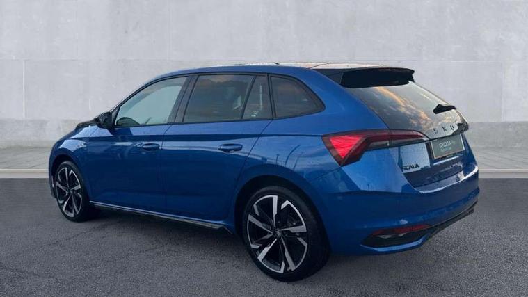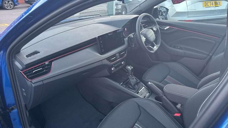 Advanced driver attention and drowsiness monitor, Bluetooth, e-Call (emergency call), Front assist system, PAS, Rear parking sensors, Rear view camera, Speed limiter, Tailgate, Traffic sign recognition, Virtual Cockpit - 10.25" digital display, Voice control system, Wireless smartlink, Drive mode select with Sport Chassis Control and ECO mode, 4 USB C ports, 8 Speakers, 9.2" Skoda navigation display, DAB radio, Auto dimming rear view mirror, Automatic headlight control with manual coming and leaving home feature, Automatic intermittent wipers, Black door mirrors, Black lettering on boot lid, Black radiator grille, Black rear diffuser, Black roof spoiler, Black window frames, Body colour bumpers, Body colour door handles, Extended tailgate glass, Front and rear electric windows, Heated rear window, LED 3rd brake light, LED daytime running lights, LED high beam, LED low beam, Light sensors, Monte carlo plaque, Panoramic glass roof, Privacy glass, Rear LED fog light, Rear side wing doors, Rear wiper, Tinted windows, Unique dark chrome design logo on alloy wheels, 12V socket in luggage compartment, 3 seat bench in 2nd row, Aluminium pedals, Ambient lighting in white/red, Black / White armrest stitching, Black roof headlining, Cargo elements, Chrome inner door handles, Door inserts in art.leather carbon, Driver and passenger sun visors with vanity mirror, Dual zone climate control, Front and rear roof lights, Front centre armrest, Front head restraints, Height adjustable driver seat, Height adjustable passenger seat, Ice scraper, Illuminated glove compartment, Inner circulation control with pollen filter, ISOFIX for front passenger seat, Isofix preparation for back seats, Leather gearknob and handbrake lever, Luggage net under rear parcel shelf, Manual lumbar support for front seats, Monte Carlo cloth upholstery, Net package and top tether hooks in boot space, Pocket on the back of both front seats, incl. mobile phone pockets, Rear centre armrest, Red hotstamping, Single front passenger seat, Skoda lettering on steering wheel, Sport seats, Textile floor mats, Third rear headrest, Ticket holder, Top tether for front passenger seat, Umbrella in driver's door, Light and view plus pack - Scala, 3x3 point rear seatbelts, ABS, Child locks, Curtain airbags and front side airbags, Disc brakes, Driver and front passenger airbags, ESP, Hill hold control, Manual leather parking brake, One tone horn, Passenger airbag switch off function, Seatbelt reminder for driver and front passenger, Tyre pressure monitoring system, Anti theft alarm system with interior monitoring, backup horn and towing protection, Anti-theft wheel bolts, Remote central locking with 2 remote folding keys, SAFE function for remote central locking, Carbon effect decorative inserts, 18" Ursa black diamond cut alloy wheels,