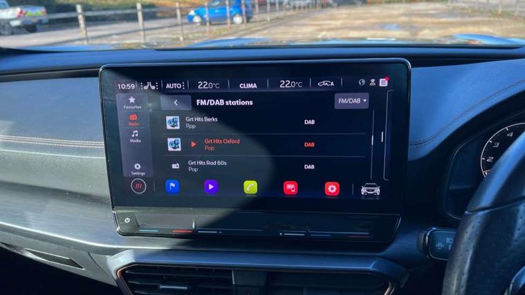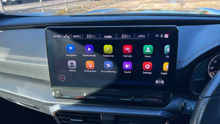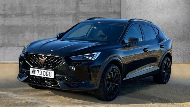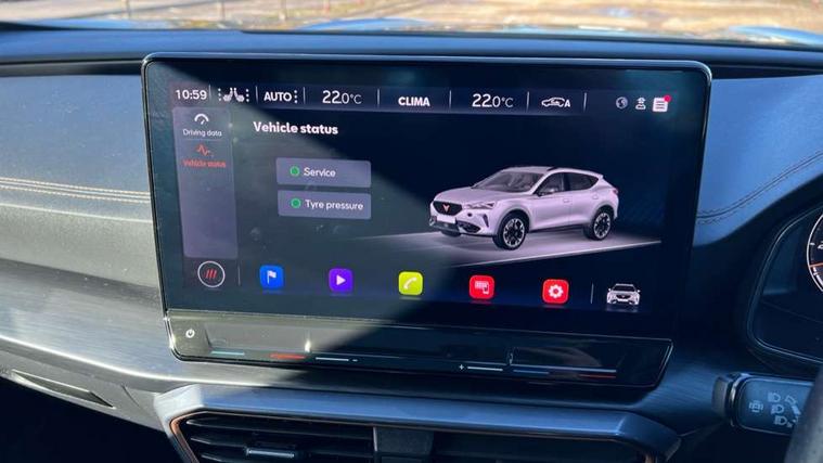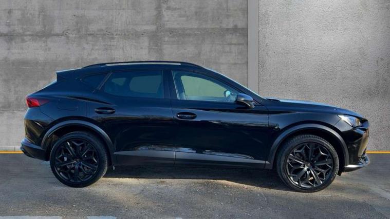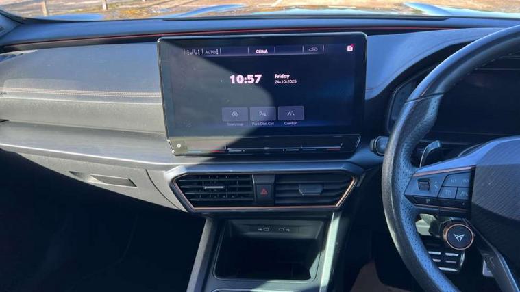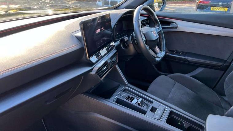 Digital cockpit and configurable dashboard, Driver alert system, Dynamic chassis control with driving profile selection (Comfort, Sport, CUPRA, Individual), Forward collision warning with automatic braking, Lane assist, Navigation system with 12'' Touchscreen Display, Park assist (inc front/rear parking sensors), Predictive adaptive cruise control with speed limiter, RPM, trip computer, outside temp gauge, instrument light brightness, low fuel warning light, lights on reminder, gearshift indicator, Service interval indicator, Speed sensitive power steering, Start/stop system with regenerative braking, Top view camera, Virtual pedal and electric tailgate, Voice control system, Wired Android Auto, Wireless apple carplay, Wireless phone charger, Electronic locking differential and dynamic traction support, Sports suspension with front shock absoption, 2 front and 2 rear USB type C sockets, Auxiliary input socket, Beats audio with 9 speakers plus subwoofer and 340W amplifier, DAB radio, Auto dimming rear view mirror, Body colour door handles, Body coloured bumpers, Cupra exterior black lettering, Daytime running light with automatic headlight control and coming home feature, Dynamic headlight range control, Electric front/rear windows, Electrically adjustable heated and folding door mirrors with memory function, Front fog lamps with cornering function, Front grill, cladding parts and exterior mirros housing painted in sport black matte, Gloss black roof rails and window surrounds, LED Taillights with dynamic indicator, Matrix LED headlights, Panoramic sunroof, Rain sensing wipers, Rear diffuser with twin exhaust pipe on each side, Rear side wing doors, Rear wash/wipe, Sports bumpers, Third brake light, Tinted rear windows, Welcome lights, 12v power supply in centre console, 12V socket, 12v socket in loadspace, 2 front and 2 rear reading lights, 230V socket, 3 seat bench in 2nd row, 60/40 split rear bench seat with armrest and mechanical seat release, Black headlining, Cupra sports pedals, Dinamica/leather upholstery + bucket seats, Dust/pollen filter, Electrically adjustable with memory function for driver seat, Front and rear head restraints, Front centre armrest, Heated front seats, Height/reach adjust steering wheel, Illuminated interior front door sills, Illuminated sunvisor with mirror, Isofix, Leather heated multi-function sports steering wheel with start stop, CUPRA mode button and gear shift paddles, Luggage tie-down hooks, Single front passenger seat, Three zone climate control with control panel in rear, Variable luggage/load compartment floor, Wraparound lighting, Safety and driving pack (XL) - Formentor, 3 point seatbelts on all rear seats, ABS, Brake control system - ESC and brake booster, Child proof door locks, Driver and front passenger airbags with front passenger airbag de-activation, Electronic parking brake, Front and rear disc brakes, Front side curtain airbags, Hill hold control, Public e-call, Seat belt reminder for front and rear seats, Tyre pressure monitoring system, Anti theft alarm system, Keyless entry and start system (KESSY), Locking wheel bolts, Copper and aluminium interior detailing, Leather dashboard, dinamic door insert and side trim panel, 19" Sport matt black alloy wheels, Tyre repair kit,