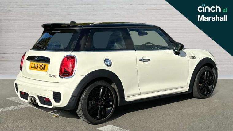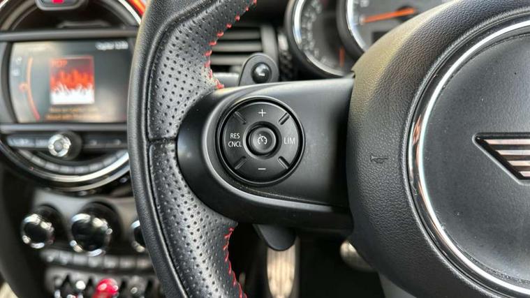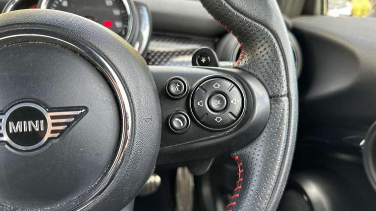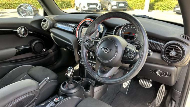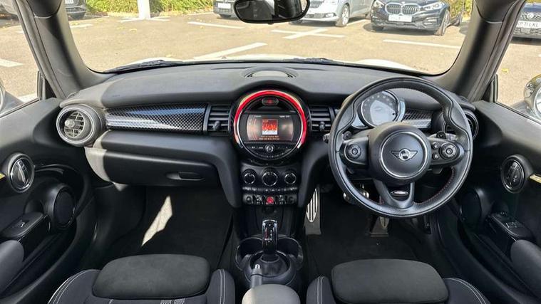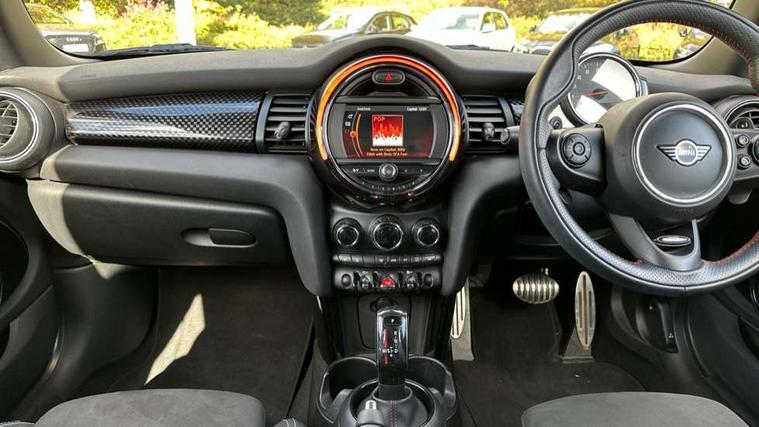 Compatible mobile phone bluetooth with audio streaming, Instrument cluster, Mini E-call, MINI TeleServices, On board computer, Service interval indicator, Performance Control, Steptronic sport transmission with double clutch and steering wheel paddles, 6.5" touchscreen with LED ring, FM tuner and DAB digital radio, Automatic headlight activation switch, Bonnet scoop, Chrome border honeycomb structure radiator grille with S badge, Chrome plated fuel cap, Dynamic brake lights, Electric front+rear windows, Heated rear window, Heated windscreen washer jets, John Cooper Works - aerodynamic kit (front and rear apron, spoiler), front and rear sport bumpers and part-painted side sills with door sill finishers, John Cooper Works rear spoiler, LED headlight with closed ring and daytime driving lights, Metal door sill strips with Cooper S imprint, Model logo Cooper S on right of tailgate, Rain sensor window wipers, Rear fog lights, Rear LED lights with union jack design, Rear window wiper, Side scuttle panel with integrated indicator, Sun/heat protection glass, Two central exhaust tailpipes with chrome finisher, White indicator lenses, 12V Accessory socket in centre console, 4 lashing eyes in luggage compartment, 60/40 split folding rear seat, Anthracite headlining, Chrome interior highlights, Cupholders, Front and rear isofix with front passenger airbag deactivation, Glove compartment, Height and length steering column adjustment, Interior lighting with 12 basic colours selectable via toggle switch in roof, John Cooper Works leather steering wheel with contrasting stitching in Chilli Red with John Cooper Works logo, John Cooper Works Logo in seat, Leather gearshift lever and handbrake gaiters, LED reading lights, vanity mirror lights, front foot well light and spotlight on front seats, Manual air conditioning, Mechanical seat adjustment, driver seat height adjust, forward/back and front seats backrest, Mini logo projection on floor from drivers exterior mirror, Multifunction steering wheel, Storage compartments in doors, Storage pocket on back of front seats, Sunvisors with vanity mirrors, 3 point seatbelts on all four seats, 6 Airbags - front, side, head and seat belt tensioners, Anti-lock braking system (ABS), DSC - Dynamic Stability Control, Front and rear disc brakes, Hill start assist, Two tone horn, Tyre pressure monitoring system, Alarm system with tilt sensor, monitoring doors, bonnet interior and tailgate, Electronic vehicle immobiliser, Start/stop toggle with keyless go, Tool kit,