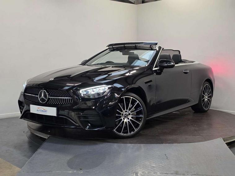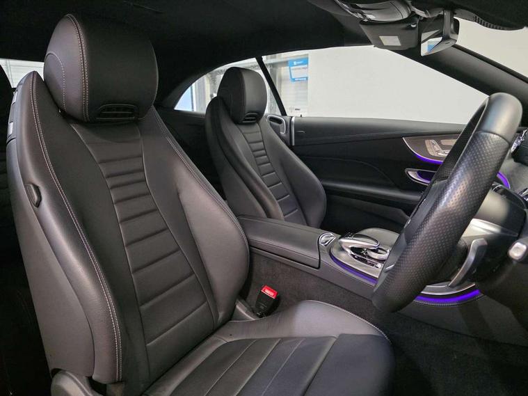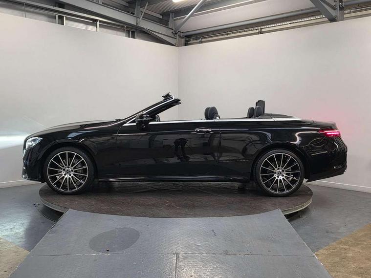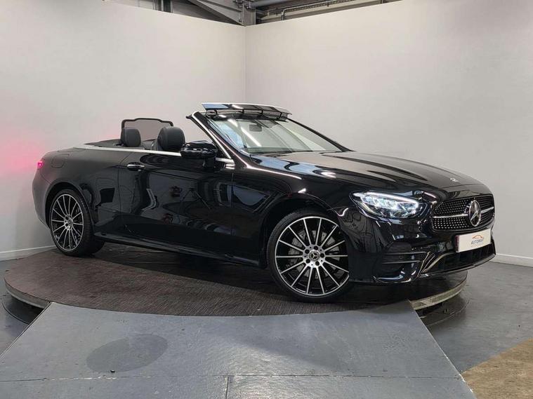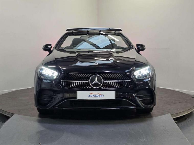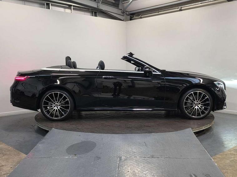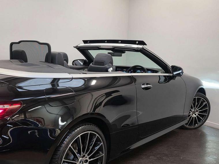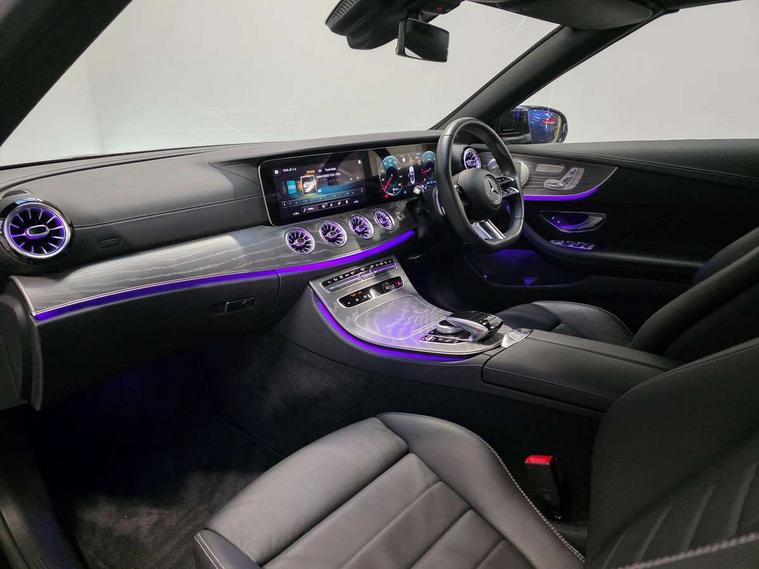 360 degree parking camera, Active parking assist including front and rear parking sensors, Analogue clock, Attention assist, Automatic boot separator, Brake wear warning display, Cockpit display 12.3" widescreen digital instrument cluster, Collision prevention assist plus, Direct steer speed sensitive steering, DYNAMIC SELECT with a choice of driving modes (ECO, Comfort, Sport, Sport+ and Individual), E-call, ECO start/stop function, High resolution 12.3" multimedia colour display, MBUX voice control activated by keywords "Hey Mercedes", Mercedes connect me, Outside temperature display, Pre-installation for Vehicle Monitoring, Pre-installation for Vehicle Setup, Remote boot release, Service indicator (ASSYST), Status display for rear seat belts in instrument cluster, Touchpad with controller, Traffic sign assist, Trip computer in multifunction display showing current fuel consumption, Wireless charging, 14 litre AdBlue tank, 66 litre fuel tank, 9G TRONIC 9 speed automatic transmission, Agility control sports suspension with selective damping system, Diesel particulate filter, Incorrect fuelling protection, 2 USB ports in centre console, 2 USB ports in the rear, Burmester surround sound system with 13 speakers and a 9 channel amplifier with total output of 590 watts, MBUX multimedia system with DAB digital radio and touchpad including satellite navigation, Smartphone integration via Android Auto/Apple CarPlay, Media Interface, USB and Bluetooth interface and touchpad with control wheel, Acoustic soft-top with enhanced climate and noise comfort, Adaptive brake lights, Adaptive high beam assist, AIRCAP wind deflector and draught stop, AMG bodystyling front and rear aprons in polished aluminium, Body colour door handles, Body coloured bumpers, Electric windows with one touch opening/closing and obstruction sensors, Exterior mirrors heated and electronically adjustable, High gloss black exterior mirror housing, High gloss black front apron, High gloss black rear bumper with chrome trim, Illuminated front door sill panels with Mercedes-Benz lettering, LED 3rd brake light, LED daytime running lights, LED high performance headlamps, Magic Vision Control heated windscreen wiper system, Radiator grille with integral star and 2 louvres in matt iridium silver with chrome trim, Radio aerial integrated into rear window, Rain sensing windscreen wipers, Rear boot, Rear LED lights, Top surround of side windows in polished aluminium, Visible twin pipe exhaust system integrated into bumper, Waistline in polished aluminium, 2 seat bench in 2nd row, 3-spoke flat bottom multifunction AMG steering wheel with Touch Control buttons, trimmed in black nappa leather, 50/50 split folding rear seat, Airscarf - neck level heating, Artico man-made leather upper dashboard and beltlines with contrast stitching, Automatic child seat recognition sensor, Belt feeder driver and front passenger seat belt automatically positioned within easier reach, Black door pins, Black roof lining, Central stowage compartment with 12 V socket in centre console, Central stowage compartment with USB socket for use with Android Auto and Apple CarPlay, Centre armrest and door handle illumination, Centre console in grey open-pore ash wood, Floor mats with AMG lettering, Front and rear door pockets, Front centre armrest with stowage compartment, Front footwell lights, Glasses compartment in overhead control panel, Glove compartment - lockable, air conditioned and illuminated, Head restraints for driver and front passenger (four-way adjustability) and in rear (two-way), Heated front seats with partial electric adjustment and electro-pneumatic four-way lumbar support, Interior lighting - 64 colour Ambient lighting, Interior rear light/integral reading lights, Isofix rear child seat fastenings, Multi contour front sports seats, Seat occupancy sensor for front passenger seat, Single front passenger seat, Sports pedals in brushed stainless steel with black rubber studs, Steering column electrically adjustable for height and reach, Steering wheel gearshift paddles, Sunvisors with illuminated vanity mirrors, THERMOTRONIC automatic climate control system with 3 climate zones, Memory pack - E Class, Mirror pack - E Class, Night package - E Class, Stowage pack - E Class, 2 x 3-point rear seatbelts, Active bonnet pedestrian safety measure which detects an impact and raises bonnet, Adaptive brake system with HOLD function and brake drying in the wet, Adaptive driver and front passenger airbags, Airbags - sidebag for driver and front passenger with combined thorax/pelvis bag, Anti-lock braking system (ABS), Drivers knee airbag, Electric parking brake, Electronic Stability Programme, Front and rear window airbags, Head airbags, Hill hold function, Perforated front brake discs with "Mercedes-Benz" lettering, Seatbelt warning, Tyre pressure monitoring system, Warning triangle and first aid kit, Alarm system/interior protection/immobiliser, Central locking with interior switch, automatic locking and crash sensor with emergency opening function, Chrome surround in electric key, Keyless Go entry and starting function, Open-pore grey ash wood trim, 20" AMG multi spoke design alloy wheels painted in high gloss black with high sheen finish, Summer tyres, TIREFIT with tyre inflation compressor,