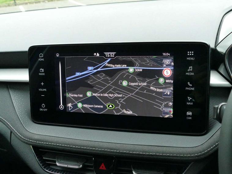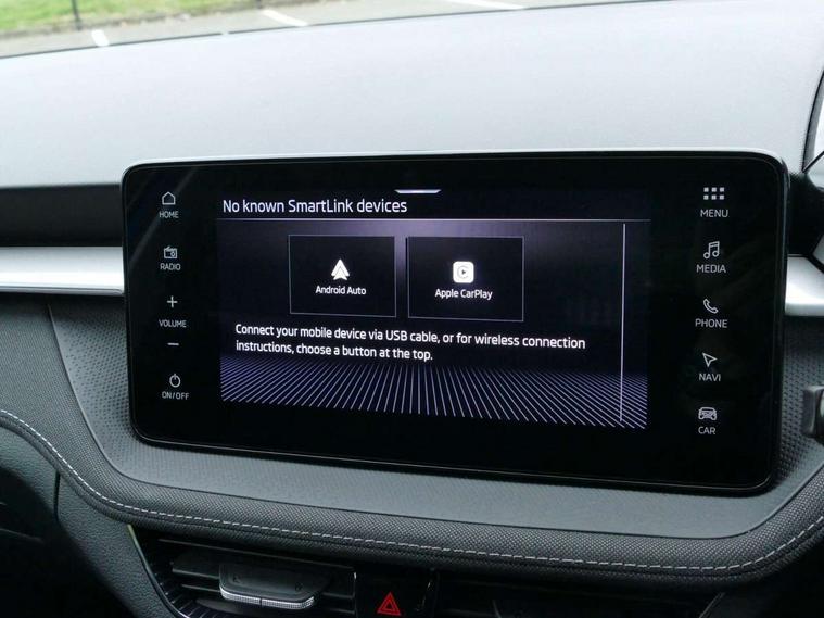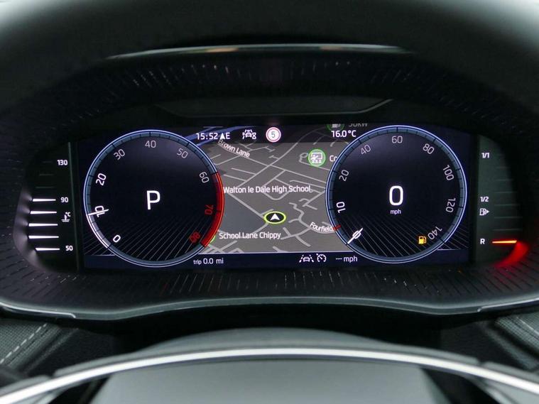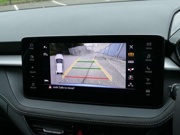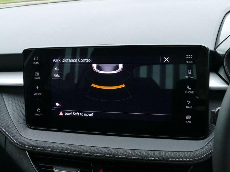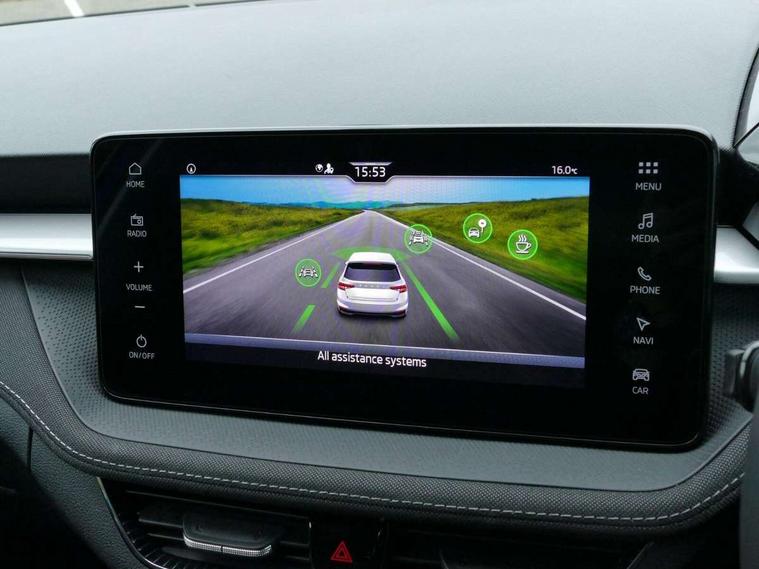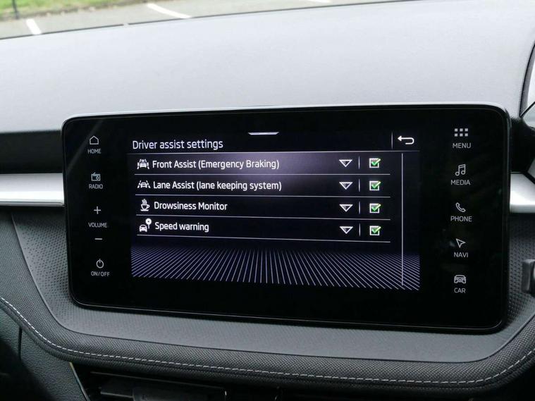 Advanced driver attention and drowsiness monitor, Bluetooth connection, Driver alert system, Electromechanical power steering, Exterior temperature gauge, Service interval indicator, Traffic sign recognition, Virtual cockpit with 10.25" colour display, Wireless SmartLink for Apple CarPlay and Android Auto, 6 Speakers (4 in front and 2 in rear), 9.2" colour display skoda navigation system with voice control and web radio, Auxiliary socket for external MP3 player, DAB digital radio reception, Auto dimming rear view mirror, Body colour door mirrors, Body coloured bumpers, Chrome window surround, Door mirror integrated indicators, Front and rear electric windows, Front window wiper intermittent control, Headlight range control - Automatic, Ice scraper in fuel cap, LED 3rd brake light, LED daytime running lights with coming and leaving home feature, LED rear lights, Privacy glass, Rear LED fog light, Rear side wing doors, Rear window wiper with washing nozzles, Roof mounted spoiler, SKODA tailgate lettering in chrome, Unique dark chrome design logo on alloy wheels, 2 LED reading lights in front and rear, 3 rear headrests, Backrest split and folding, Central console with fixed cup holder and storage box, Chrome handbrake release button, Comfort seats, Door sills with fabia badging, Dual zone air conditioning with climatronic electronic control, Fabric upholstery, Front centre armrest, Gearshift knob/handle in leather, Grain satin black interior door handles, Hand brake lever handle in leather, Height adjustable front headrests, Height adjustable front seats, Height adjustable steering wheel, ISOFIX and TopTether anchorage points to the outer rear seats, ISOFIX and TopTether on the front passenger seat, Luggage compartment lighting, Manually adjustable lumbar support in front seats, Pollen filter, Rear seat bench unsplit, Single front passenger seat, Skoda lettering on steering wheel, Storm grey headlining, Sun visors with mirror and airbag label on passenger side, Textile floor mats, Ticket holder, Umbrella in drivers door, Ambient lighting pack - Fabia Hatchback, 3-point height adjustable front seats belts with pretensioner and force limiter, Automatic warning lights in case of crash, Driver and passengers airbag with switch off function, e-Call+, ESC including ABS, MSR, ASR, EDS, HBA and XDS, Front and rear seat belt warning, FRONT ASSIST (AEB City and AEB Inter Urban), Front side airbags, Head airbags, Hill hold control, One tone horn, Pedestrian protection, Three rear 3-points safety seat belts with pretensioner and force limiter including stop function for outer rear seat belts, Tyre pressure monitoring system, Anti-theft alarm system including immobiliser, interior monitoring, backup horn, and towing protection, Central locking with radio remote control, interior controls, SAFE function and 2 foldable keys, Chrome edged air vents, Grain satin black central console cover, Metallic grey upper decorative trim, Satin black door and side trim panel in front, Textile microsuede grey lower decorative trim with art grey stitching, Anti-theft wheel bolts protection, Super-low rolling resistance tyres,