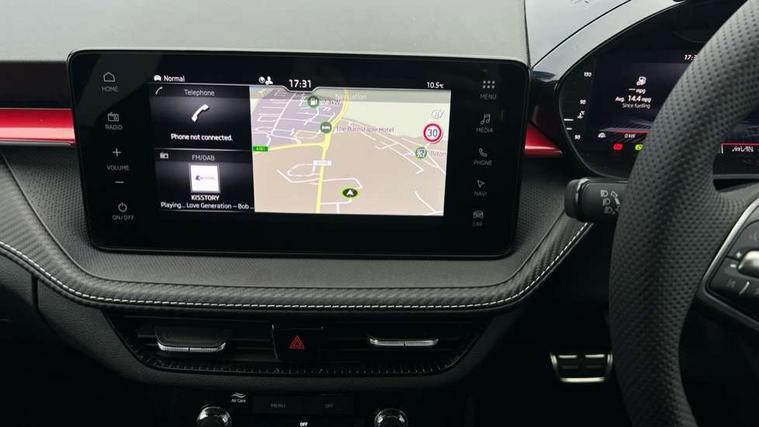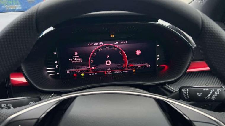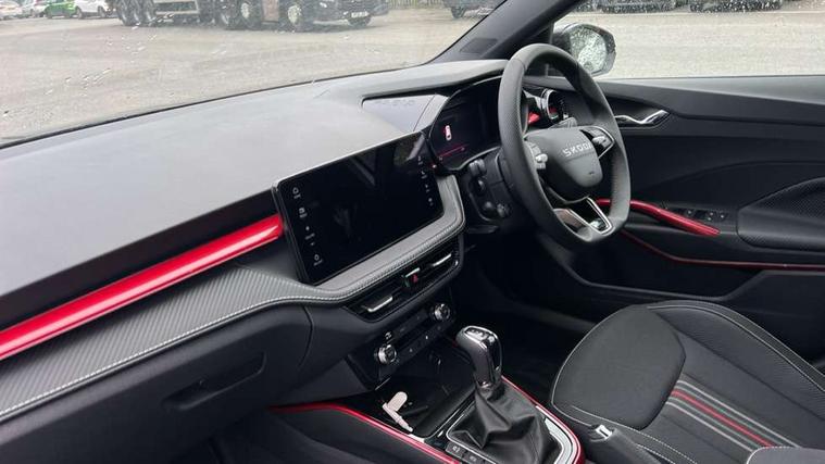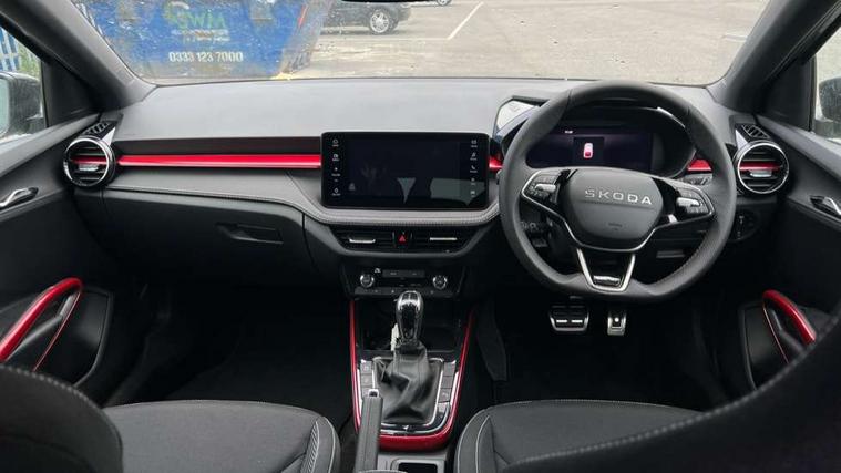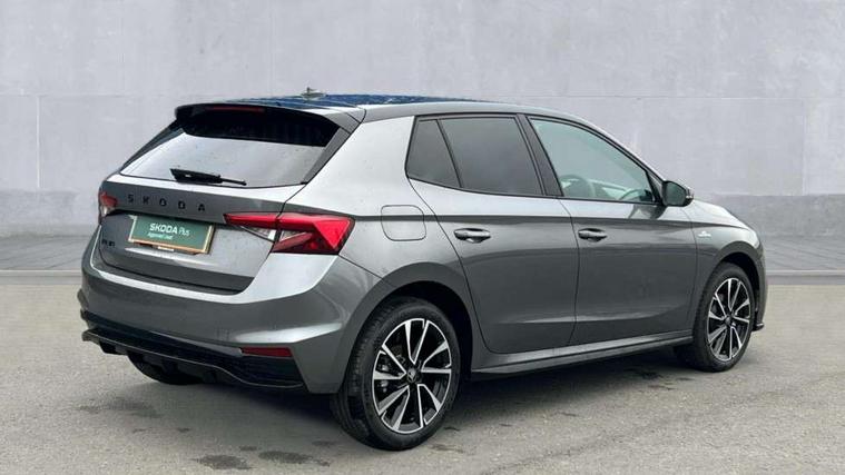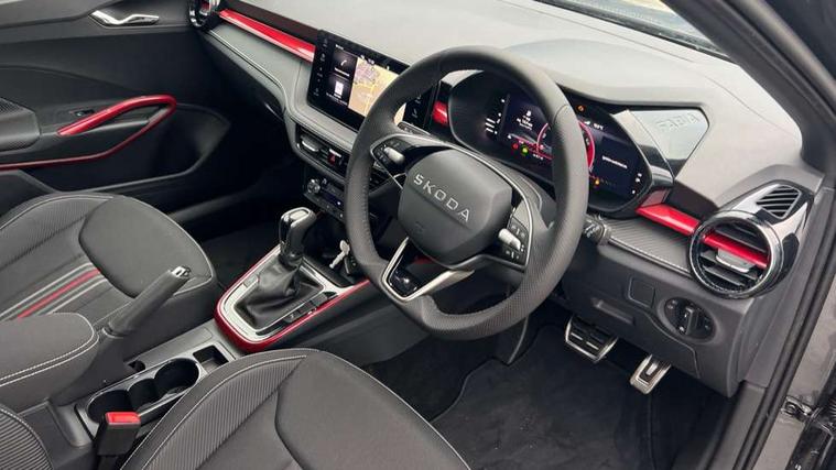 Advanced driver attention and drowsiness monitor, Bluetooth connection, Driver alert system, Electromechanical power steering, Exterior temperature gauge, Service interval indicator, Traffic sign recognition, Virtual cockpit with 10.25" colour display, Wireless SmartLink for Apple CarPlay and Android Auto, 6 Speakers (4 in front and 2 in rear), 9.2" colour display skoda navigation system with voice control and web radio, Auxiliary socket for external MP3 player, DAB digital radio reception, Auto dimming rear view mirror, Black radiator grille, Body coloured bumpers, Chrome window surround, Door mirror integrated indicators, Dynamic headlight range control, Front and rear electric windows, Front window wiper intermittent control, Ice scraper in fuel cap, LED 3rd brake light, LED daytime running lights with coming and leaving home feature, LED rear lights, Monte Carlo badging, Privacy glass, Rear LED fog light, Rear side wing doors, Rear window wiper with washing nozzles, Roof mounted spoiler, SKODA tailgate lettering in black, Sports bumpers, Unique dark chrome design logo on alloy wheels, 2 LED reading lights in front and rear, 3 rear headrests, Aluminium pedals, Backrest split and folding, Black headlining, Central console with fixed cup holder and storage box, Chrome handbrake release button, Door sills with fabia badging, Dual zone air conditioning with climatronic electronic control, Fabric/artificial leather upholstery, Front centre armrest, Front sports seats, Gearshift knob/handle in leather, Hand brake lever handle in leather, Height adjustable front headrests, Height adjustable front seats, Height adjustable steering wheel, ISOFIX and TopTether anchorage points to the outer rear seats, ISOFIX and TopTether on the front passenger seat, Luggage compartment lighting, Manually adjustable lumbar support in front seats, Metallic red interior door handles, Pollen filter, Rear seat bench unsplit, Single front passenger seat, Skoda lettering on steering wheel, Sun visors with mirror and airbag label on passenger side, Textile floor mats, Ticket holder, Umbrella in drivers door, Ambient lighting pack - Fabia Hatchback, Convenience pack - Fabia, Light and view pack plus - Fabia, 3-point height adjustable front seats belts with pretensioner and force limiter, Automatic warning lights in case of crash, Driver and passengers airbag with switch off function, e-Call+, ESC including ABS, MSR, ASR, EDS, HBA and XDS, Front and rear seat belt warning, FRONT ASSIST (AEB City and AEB Inter Urban), Front side airbags, Head airbags, Hill hold control, One tone horn, Pedestrian protection, Three rear 3-points safety seat belts with pretensioner and force limiter including stop function for outer rear seat belts, Tyre pressure monitoring system, Anti-theft alarm system including immobiliser, interior monitoring, backup horn, and towing protection, Central locking with radio remote control, interior controls, SAFE function and 2 foldable keys, Carbon effect door and side trim panels, Carbon effect lower decorative trim with white stitching, Grain satin black central console cover, Monte carlo air vents, Red metallic upper decorative trim, Anti-theft wheel bolts protection, Super-low rolling resistance tyres,
