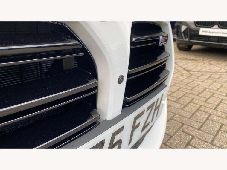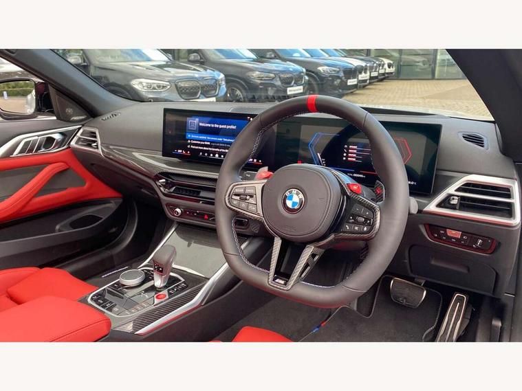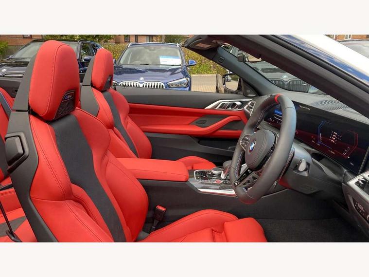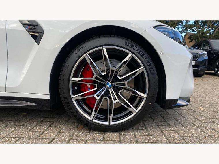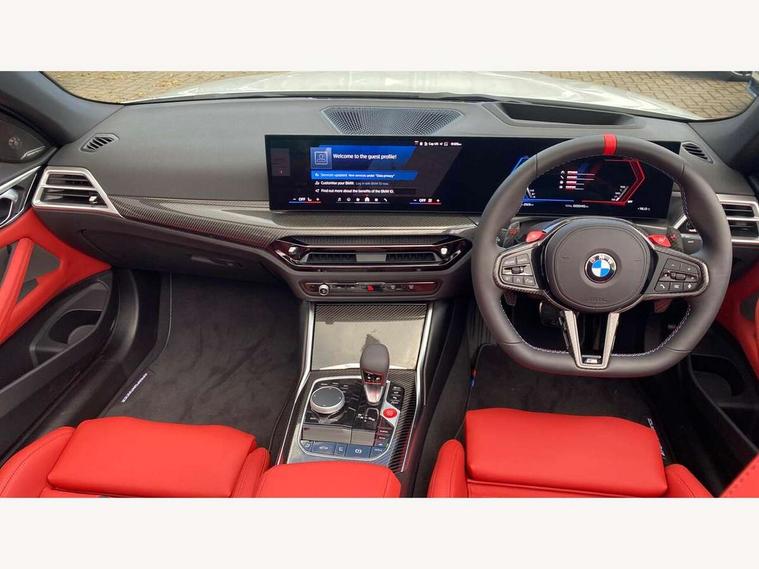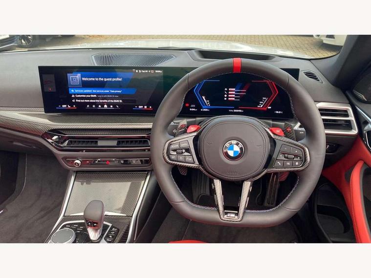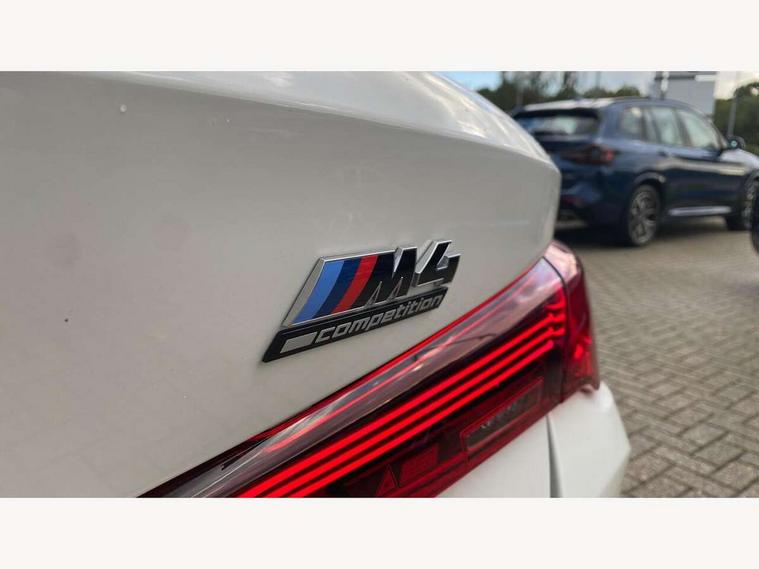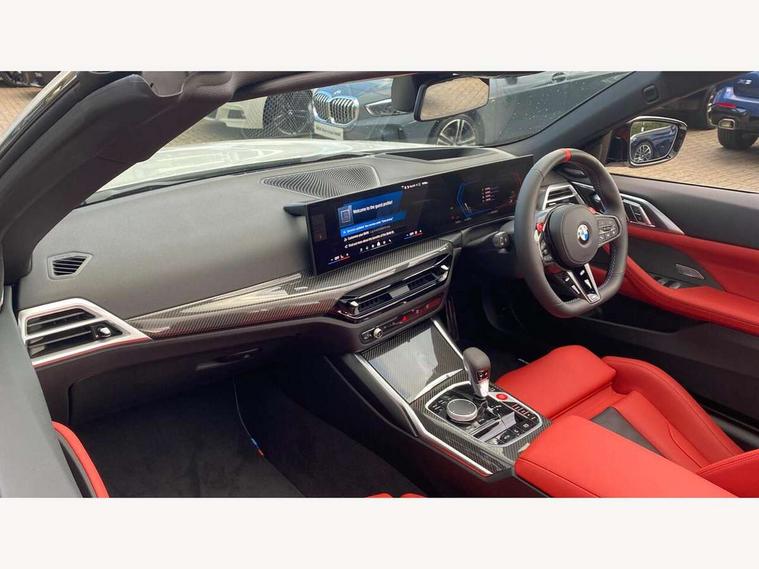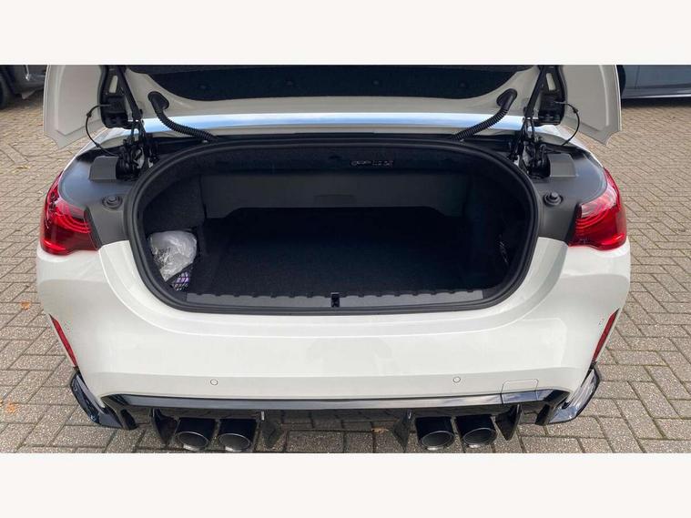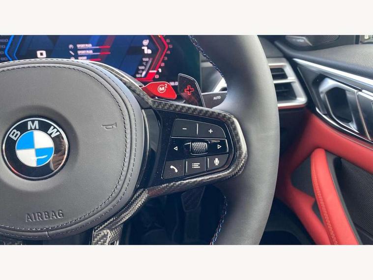 Active Guard, Automatic start/stop system, BMW ConnectedDrive online services, BMW legal emergency call, BMW Live Cockpit Pro with Head up display including 12.3" instrument display and 14.9" high resolution control display with navigation function, BMW Teleservices, Brake pad wear indicator warning light, Condition based service, Cruise control with braking function, Door/boot open warning light, Electric Power Steering (EPS) with Servotronic, Language version English, Lights on warning, M drive buttons, Oil sensor for level and grade, warning by check control system, Oil temperature gauge, On board computer, On board diagnostics, Optimum shift indicator, Outside temperature display, Park distance control, Pull away assistant, Run flat indicator, Service interval indicator, Shifting point display, Smartphone integration, Speed limiter, Start/stop button in red, Variable sport steering, Double joint spring strut front axle, M Adaptive suspension, M Drive Professional including track mode, laptimer, traction control & Drift analyser, M Sport differential, Safety battery terminal clamp, Sport automatic transmission with gearshift paddles, Auxiliary point for auxiliary devices, DAB radio with bluetooth music capability, Harman kardon surround sound audio system, Personal eSim, Acoustic laminated side glass, Auto dimming driver's door mirror, Automatic headlights + automatic windscreen wipers, Automatic parking function on front passenger's exterior mirror, Black chrome exhaust tailpipes, Black model designation badges, BMW high gloss shadow line with extended contents, BMW radiator grille, frameless, with horizontal double blind slats, black high-gloss, with model badge, Body colour bumpers, Bonnet and tailgate badge, Carbon fibre reinforced plastic (CFRP) roof, Day time running light, Door mirror integrated indicators, Dynamic brake lights, Electric adjustable heated door mirrors, Electric folding door mirrors, Electrochromic exterior driver side mirror, Electrochromic interior rear view mirror with automatic anti-dazzle function, Entry sills with aluminium inserts and model badge, Extended Stroage, Follow me home headlights, Front and rear bumper system, Front and rear plastic apron in vehicle colour, Front door sill strips in aluminium inlays with M4 inscription, Front electric windows with open and close fingertip control, anti trap facility and comfort closing, Headlight beam throw control, Heated washer jets, High gloss black lower bumper edges, side sills and diffuser edge binding, LED tail lights with 3D L-shaped LED light design, M designation, Mirror glass aspheric on driver's side, convex on passenger side, Rain sensor, Rear boot, Rear fog lights, Rear reflectors, Reversing light, Roof fin and roof trim strips in Black high-gloss, Shark fin roof aerial, Strakes in front side panel, black matt/high-gloss black, with model badge, Third brake light, Visible VIN plate, Welcome lighting, 2 cupholders in front centre console, 2 cupholders in rear armrest, 2 rear head restraints, 2 x 12 V Power sockets (luggage compartment and front centre console), 2 x USB Type C ports for charging and data transmission in front centre console, 40:20:40 split folding rear 2 seat bench with loading system, Ambient inside door handle light, Ambient lighting for storage compartment, Ambient lighting front and rear, Anthracite headlining, Battery in luggage compartment, Centre console armrest with storage compartment, Contour lighting for door trim, Driver/passenger sunvisors with ticket holders + illuminated vanity mirrors, Driving experience mode switch, Dual zone automatic air conditioning, Dynamic ambient interior lighting, Electric front seats + driver memory, English handbook, Floor mats in velour, Front and rear door exit lights, Front door storage bins with bottle holder, Front footwell ambient lighting, Front interior light, Front isofix attachment + airbag deactivation, Front reading light, Front seat backrest width adjustment, Front/rear door armrests, Heated front seats, Height adjustable front headrests, Illuminated bow-type door handles in vehicle colour, driver's side with door lock, Interior mirror lighting, Isofix on 2nd row seats, Lockable/illuminated glovebox, Luggage compartment lighting, Multifunction steering wheel, Rake/reach adjustable steering wheel, Single front passenger seat, Storage compartment in rear doors, Storage tray and compartment with cover in centre console, Through loading system, Toolkit located in luggage compartment, Waterfall lighting for central air vent, Wireless charging tray, Connected package professional - M4, Extended storage pack - M3/M4, High gloss shadowline exterior trim pack - M4, 4 x 3 point seatbelts, ABS/EBD, Automatic Stability Control (ASC), Brake energy regeneration, Brake fade compensation, Compound structure brake discs, Cornering brake control (CBC), Crash sensor, Curtain airbags, Driver/Front Passenger airbags, Dry braking, Dynamic brake control, Dynamic stability control + (DSC+), Dynamic Traction Control - DTC, Electromechanical parking brake, Electronic differential lock control (EDLC), Front and rear head airbags, Front seat side impact airbags, Front seatbelt pretensioners + load limiters, Hill start assist, M Sport seat belts, Seat occupancy detection for driver and passenger side, Seatbelt warning, Side impact protection, Two tone horn, Tyre pressure sensor, Warning triangle and first aid kit, Centre lock switch, Closing system with central locking, Electronic immobiliser, Locking wheel bolts, Remote central locking, Thatcham cat 1 remote alarm, Vehicle Key with 4 buttons including the integrated key, Galvanic embellisher for controls, Tyre repair kit,