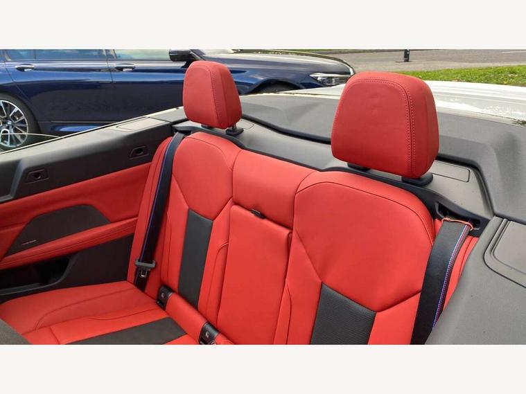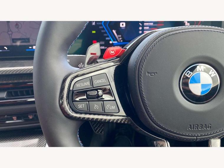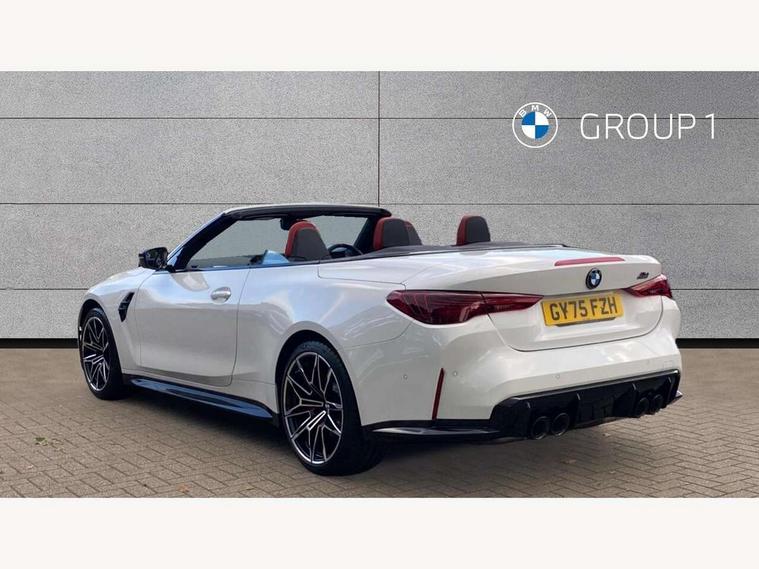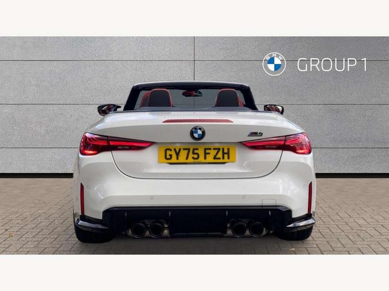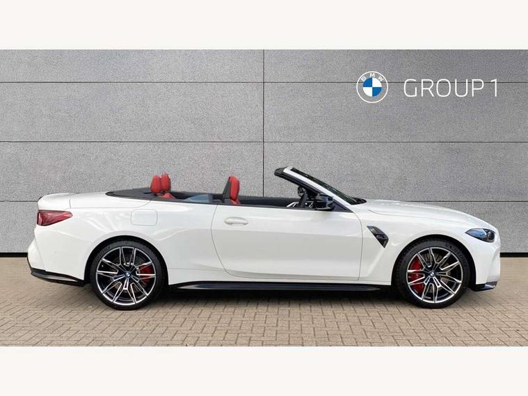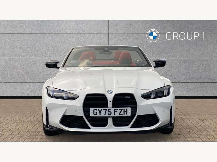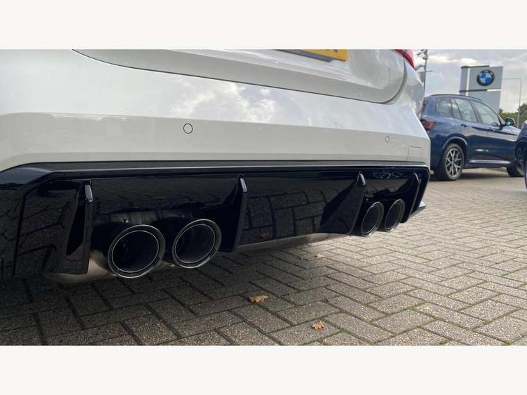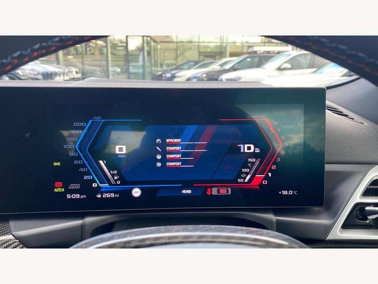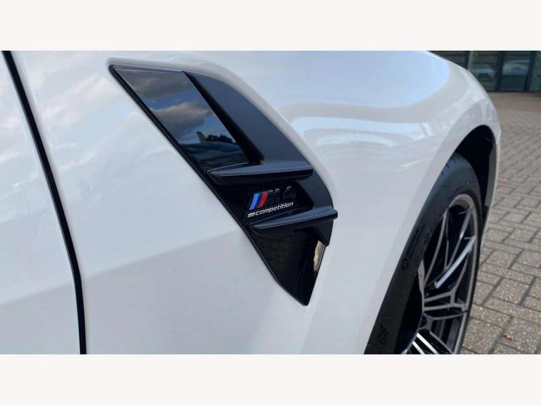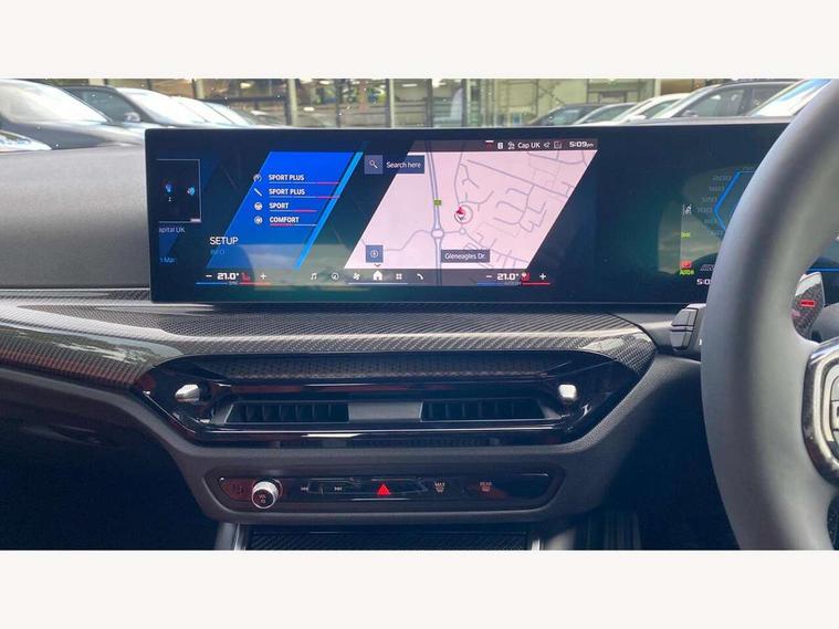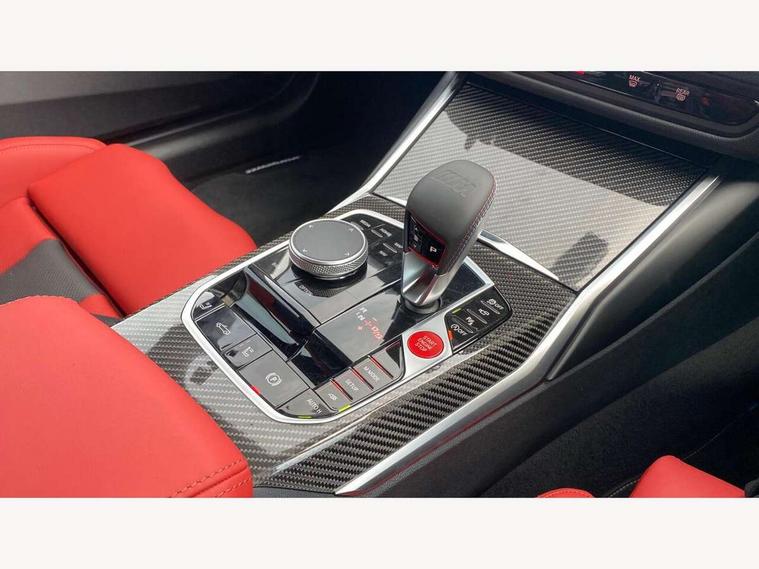 Active Guard, Automatic start/stop system, BMW ConnectedDrive online services, BMW legal emergency call, BMW Live Cockpit Pro with Head up display including 12.3" instrument display and 14.9" high resolution control display with navigation function, BMW Teleservices, Brake pad wear indicator warning light, Condition based service, Cruise control with braking function, Door/boot open warning light, Electric Power Steering (EPS) with Servotronic, Language version English, Lights on warning, M drive buttons, Oil sensor for level and grade, warning by check control system, Oil temperature gauge, On board computer, On board diagnostics, Optimum shift indicator, Outside temperature display, Park distance control, Pull away assistant, Run flat indicator, Service interval indicator, Shifting point display, Smartphone integration, Speed limiter, Start/stop button in red, Variable sport steering, Double joint spring strut front axle, M Adaptive suspension, M Drive Professional including track mode, laptimer, traction control & Drift analyser, M Sport differential, Safety battery terminal clamp, Sport automatic transmission with gearshift paddles, Auxiliary point for auxiliary devices, DAB radio with bluetooth music capability, Harman kardon surround sound audio system, Personal eSim, Acoustic laminated side glass, Auto dimming driver's door mirror, Automatic headlights + automatic windscreen wipers, Automatic parking function on front passenger's exterior mirror, Black chrome exhaust tailpipes, Black model designation badges, BMW high gloss shadow line with extended contents, BMW radiator grille, frameless, with horizontal double blind slats, black high-gloss, with model badge, Body colour bumpers, Bonnet and tailgate badge, Carbon fibre reinforced plastic (CFRP) roof, Day time running light, Door mirror integrated indicators, Dynamic brake lights, Electric adjustable heated door mirrors, Electric folding door mirrors, Electrochromic exterior driver side mirror, Electrochromic interior rear view mirror with automatic anti-dazzle function, Entry sills with aluminium inserts and model badge, Extended Stroage, Follow me home headlights, Front and rear bumper system, Front and rear plastic apron in vehicle colour, Front door sill strips in aluminium inlays with M4 inscription, Front electric windows with open and close fingertip control, anti trap facility and comfort closing, Headlight beam throw control, Heated washer jets, High gloss black lower bumper edges, side sills and diffuser edge binding, LED tail lights with 3D L-shaped LED light design, M designation, Mirror glass aspheric on driver's side, convex on passenger side, Rain sensor, Rear boot, Rear fog lights, Rear reflectors, Reversing light, Roof fin and roof trim strips in Black high-gloss, Shark fin roof aerial, Strakes in front side panel, black matt/high-gloss black, with model badge, Third brake light, Visible VIN plate, Welcome lighting, 2 cupholders in front centre console, 2 cupholders in rear armrest, 2 rear head restraints, 2 x 12 V Power sockets (luggage compartment and front centre console), 2 x USB Type C ports for charging and data transmission in front centre console, 40:20:40 split folding rear 2 seat bench with loading system, Ambient inside door handle light, Ambient lighting for storage compartment, Ambient lighting front and rear, Anthracite headlining, Battery in luggage compartment, Centre console armrest with storage compartment, Contour lighting for door trim, Driver/passenger sunvisors with ticket holders + illuminated vanity mirrors, Driving experience mode switch, Dual zone automatic air conditioning, Dynamic ambient interior lighting, Electric front seats + driver memory, English handbook, Floor mats in velour, Front and rear door exit lights, Front door storage bins with bottle holder, Front footwell ambient lighting, Front interior light, Front isofix attachment + airbag deactivation, Front reading light, Front seat backrest width adjustment, Front/rear door armrests, Heated front seats, Height adjustable front headrests, Illuminated bow-type door handles in vehicle colour, driver's side with door lock, Interior mirror lighting, Isofix on 2nd row seats, Lockable/illuminated glovebox, Luggage compartment lighting, Multifunction steering wheel, Rake/reach adjustable steering wheel, Single front passenger seat, Storage compartment in rear doors, Storage tray and compartment with cover in centre console, Through loading system, Toolkit located in luggage compartment, Waterfall lighting for central air vent, Wireless charging tray, Connected package professional - M4, Extended storage pack - M3/M4, High gloss shadowline exterior trim pack - M4, 4 x 3 point seatbelts, ABS/EBD, Automatic Stability Control (ASC), Brake energy regeneration, Brake fade compensation, Compound structure brake discs, Cornering brake control (CBC), Crash sensor, Curtain airbags, Driver/Front Passenger airbags, Dry braking, Dynamic brake control, Dynamic stability control + (DSC+), Dynamic Traction Control - DTC, Electromechanical parking brake, Electronic differential lock control (EDLC), Front and rear head airbags, Front seat side impact airbags, Front seatbelt pretensioners + load limiters, Hill start assist, M Sport seat belts, Seat occupancy detection for driver and passenger side, Seatbelt warning, Side impact protection, Two tone horn, Tyre pressure sensor, Warning triangle and first aid kit, Centre lock switch, Closing system with central locking, Electronic immobiliser, Locking wheel bolts, Remote central locking, Thatcham cat 1 remote alarm, Vehicle Key with 4 buttons including the integrated key, Galvanic embellisher for controls, Tyre repair kit,